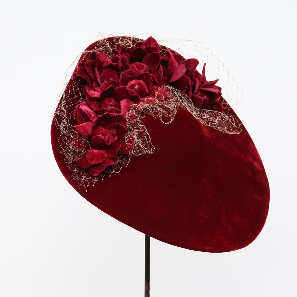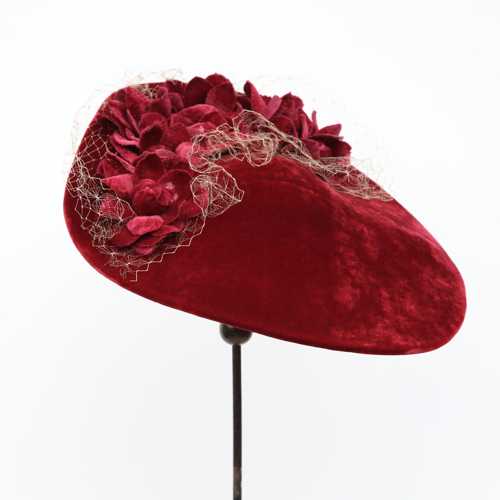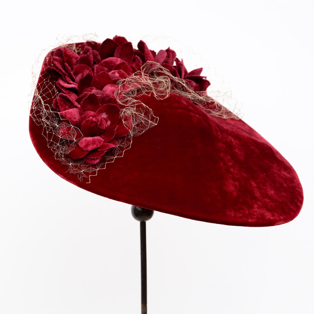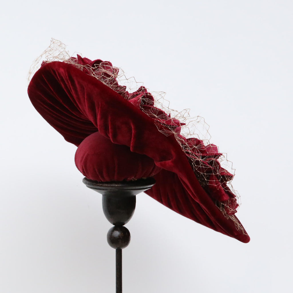 A rich crimson silk velvet wave, with little vintage flowers and vintage 1930's golden veiling. Beautifully pleated on the underside.