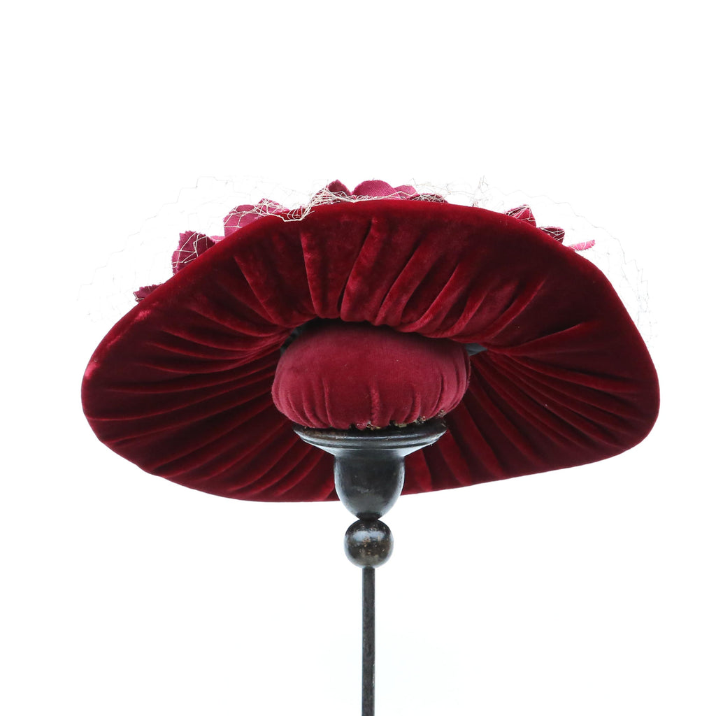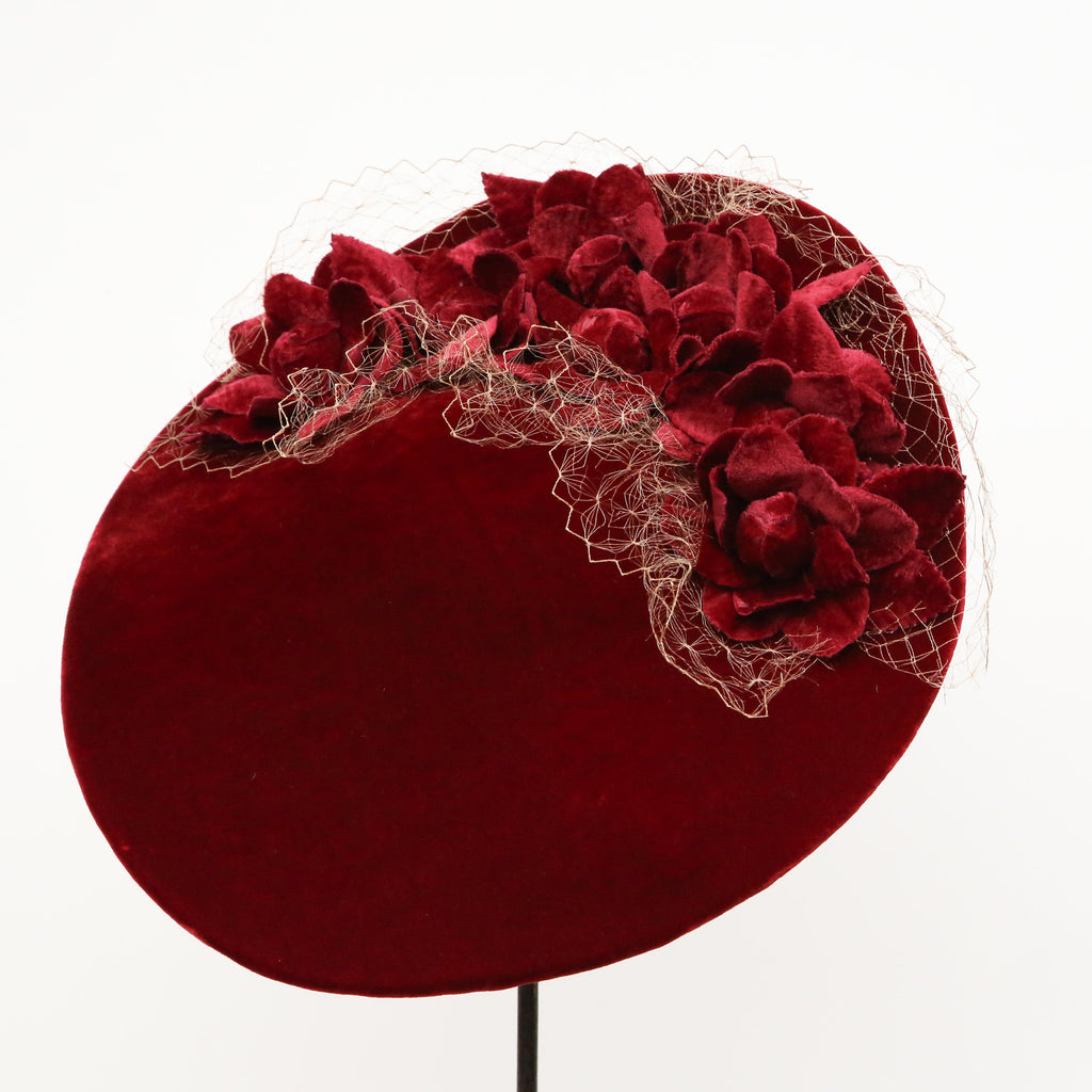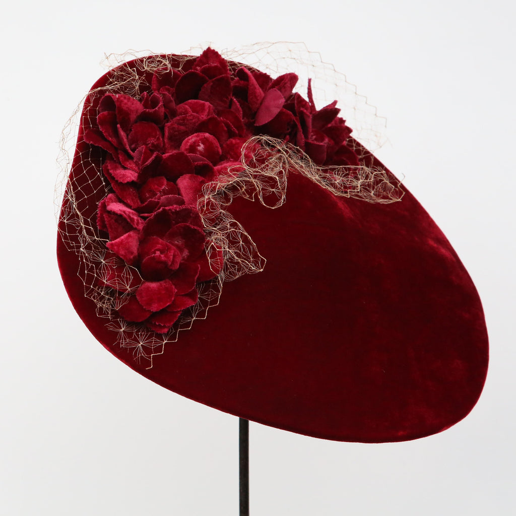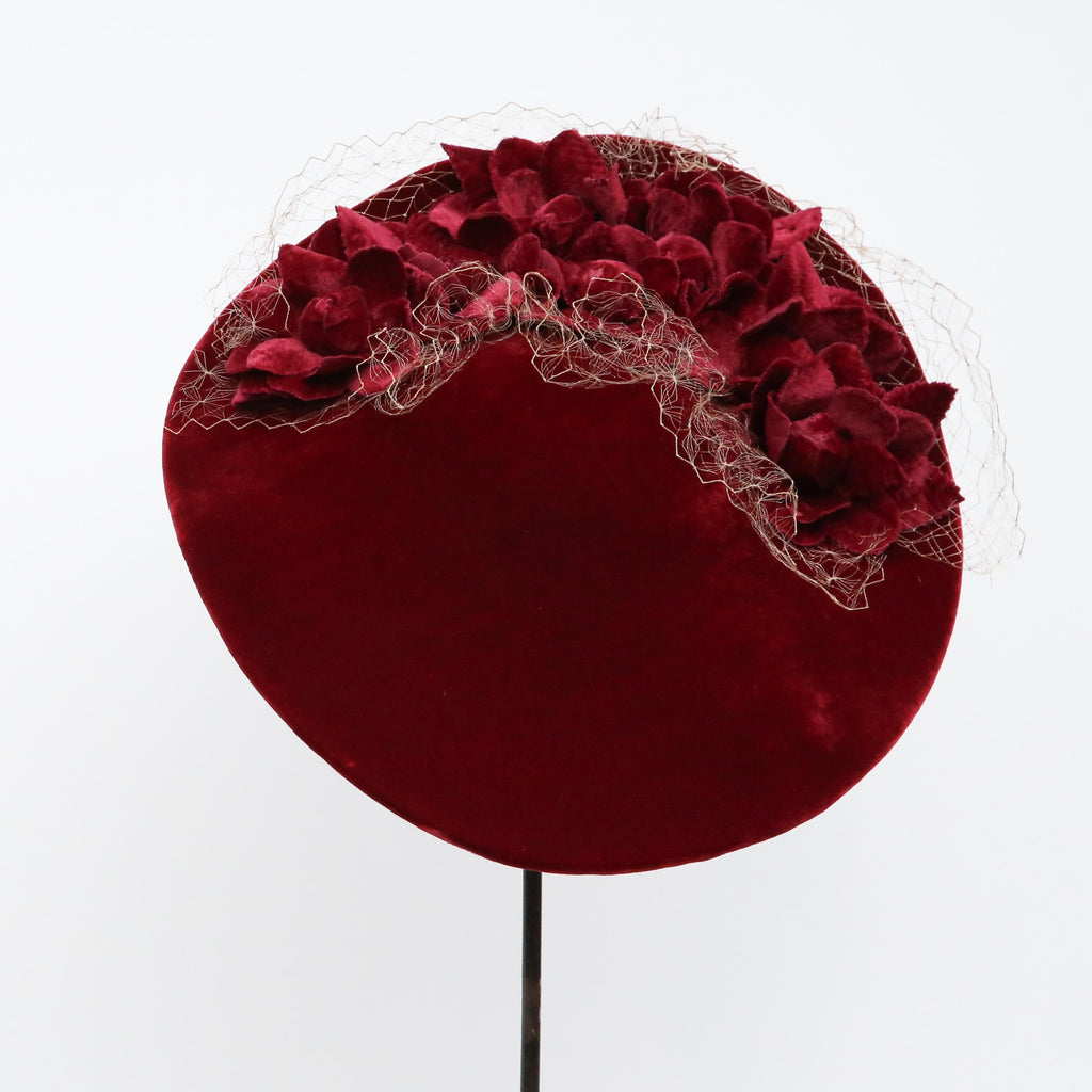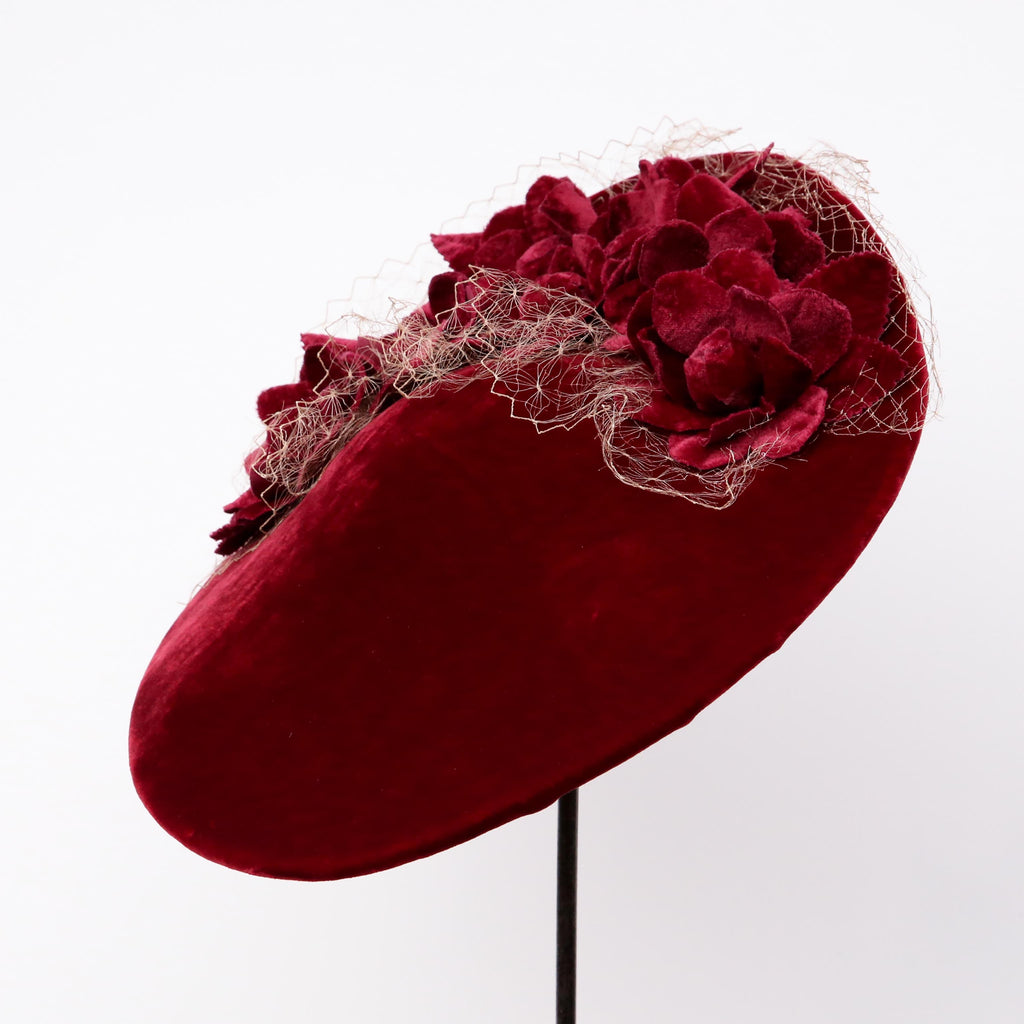 A rich crimson silk velvet wave, with little vintage flowers and vintage 1930's golden veiling. Beautifully pleated on the underside.