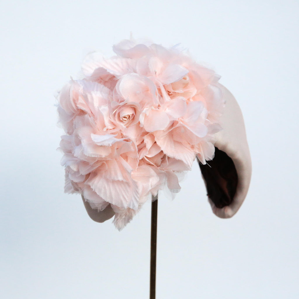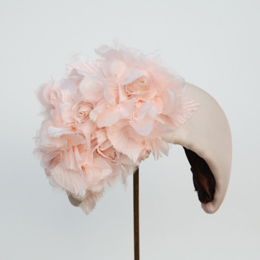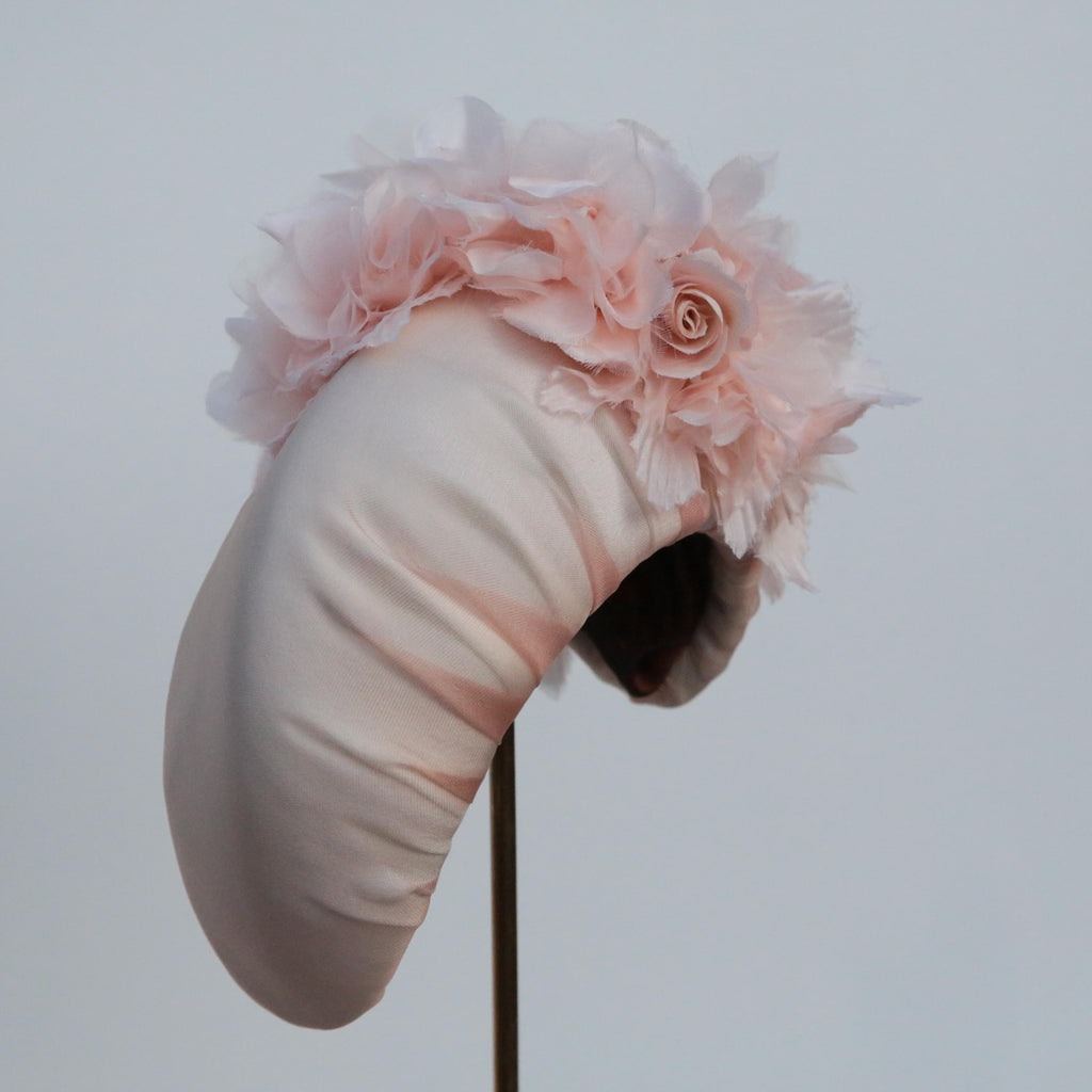 A peach silk organza softly padded high moon headband, with peachy hydrangea silk flowers and handmade little roses made with the same organza as the headband, very pale blush silk velvet and silk.