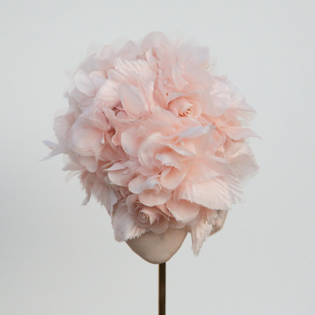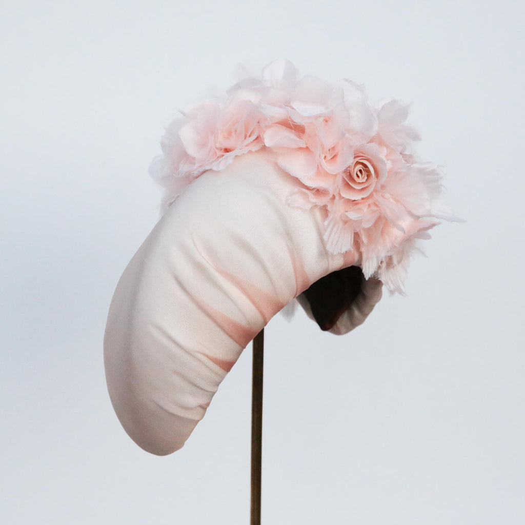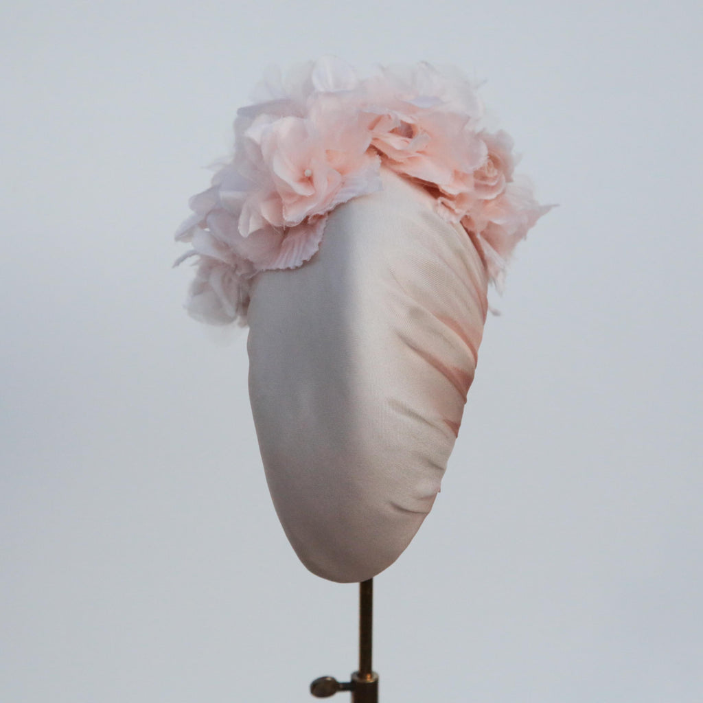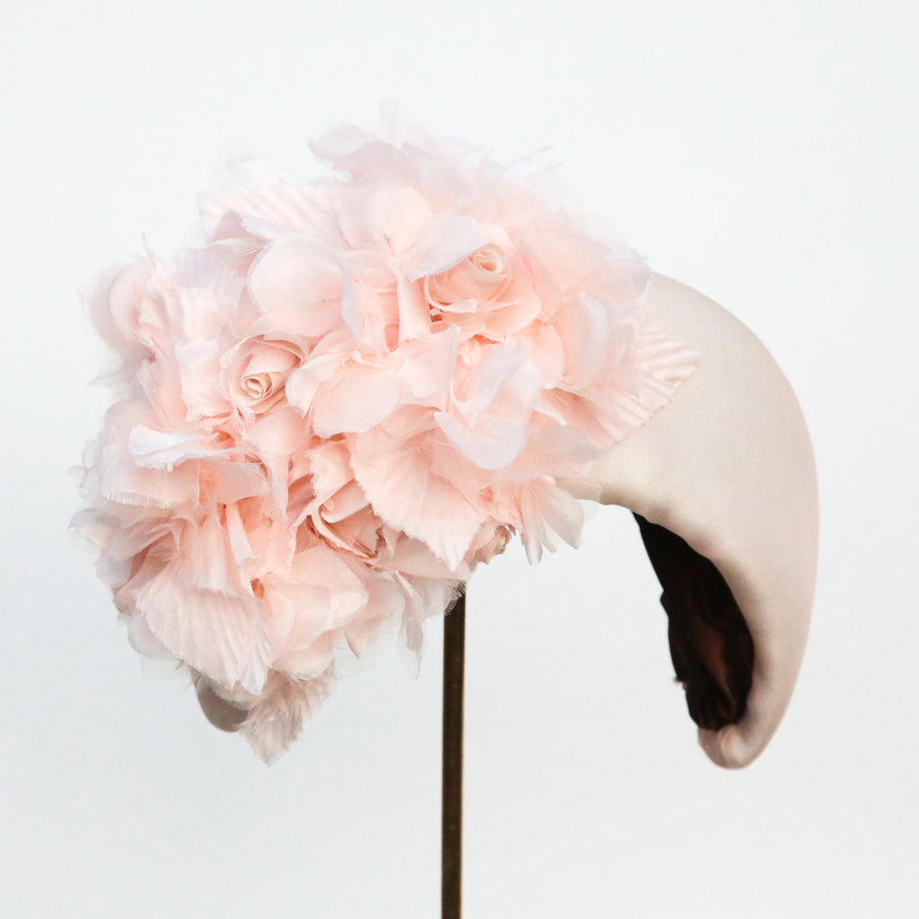 A peach silk organza softly padded high moon headband, with peachy hydrangea silk flowers and handmade little roses made with the same organza as the headband, very pale blush silk velvet and silk.