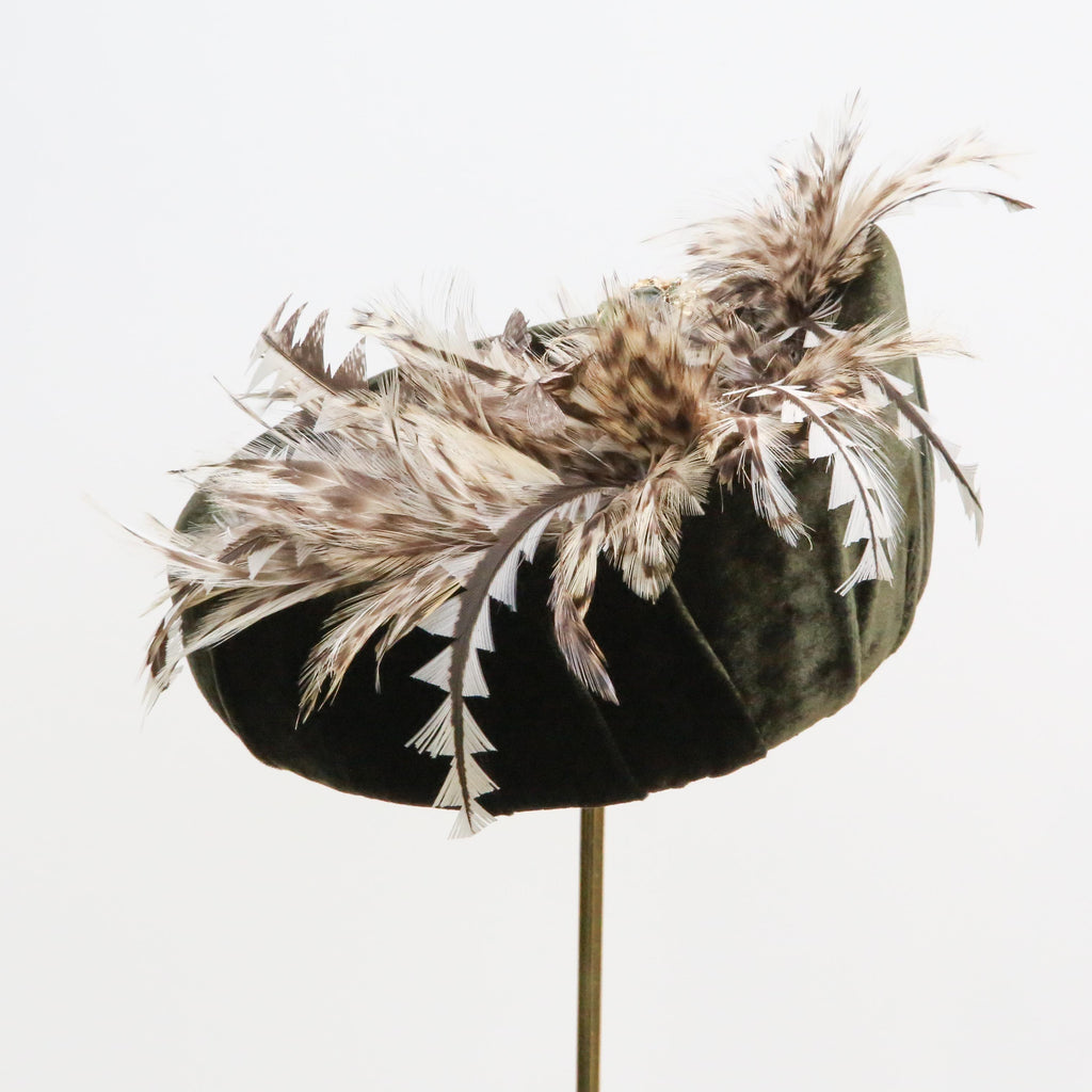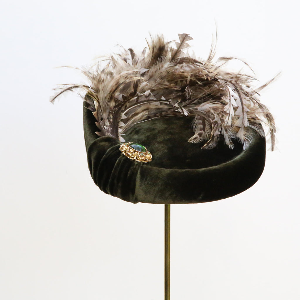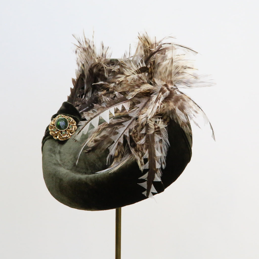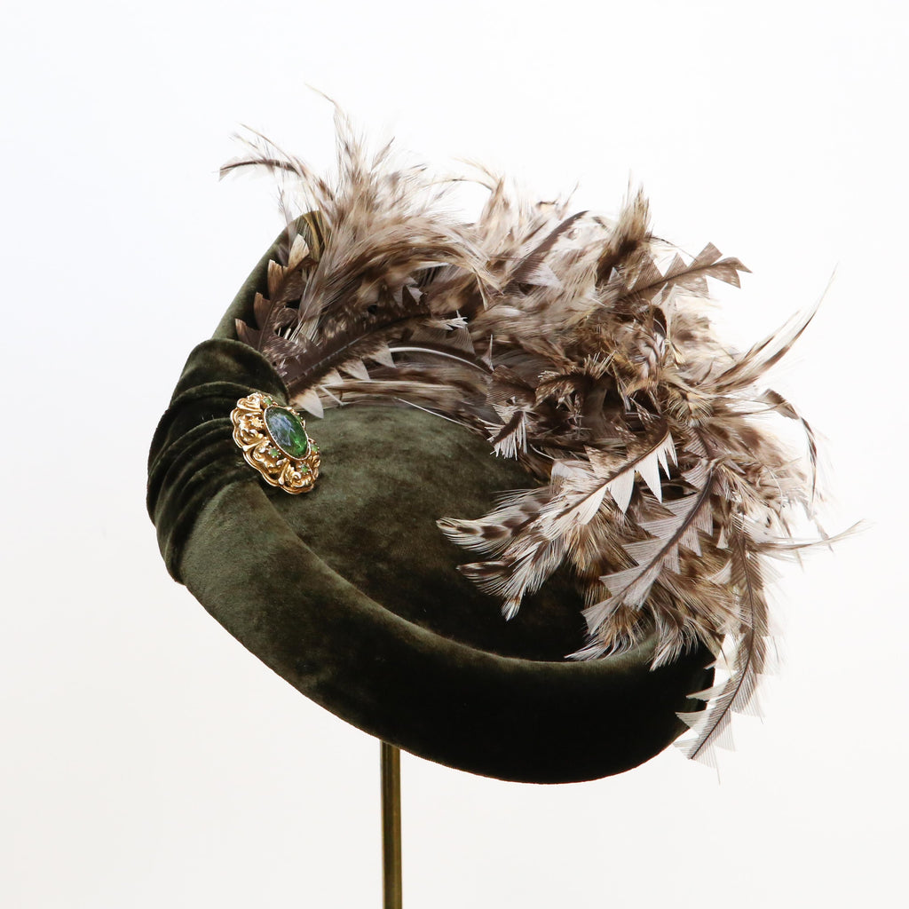 An olive silk velvet point backed hat, with natural hackle feathers and trimmed white peacock feathers, a little rouched pleat and vintage brooch.