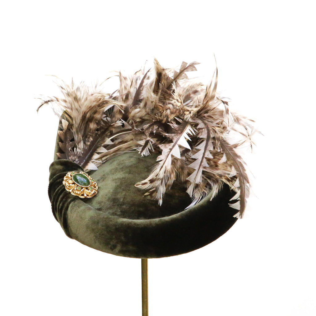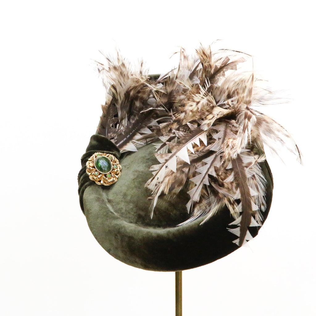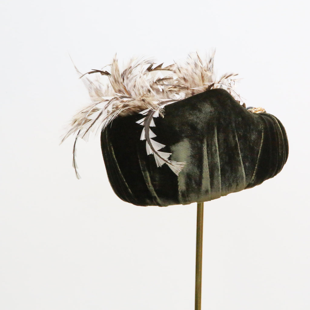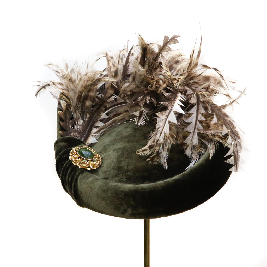 An olive silk velvet point backed hat, with natural hackle feathers and trimmed white peacock feathers, a little rouched pleat and vintage brooch.
