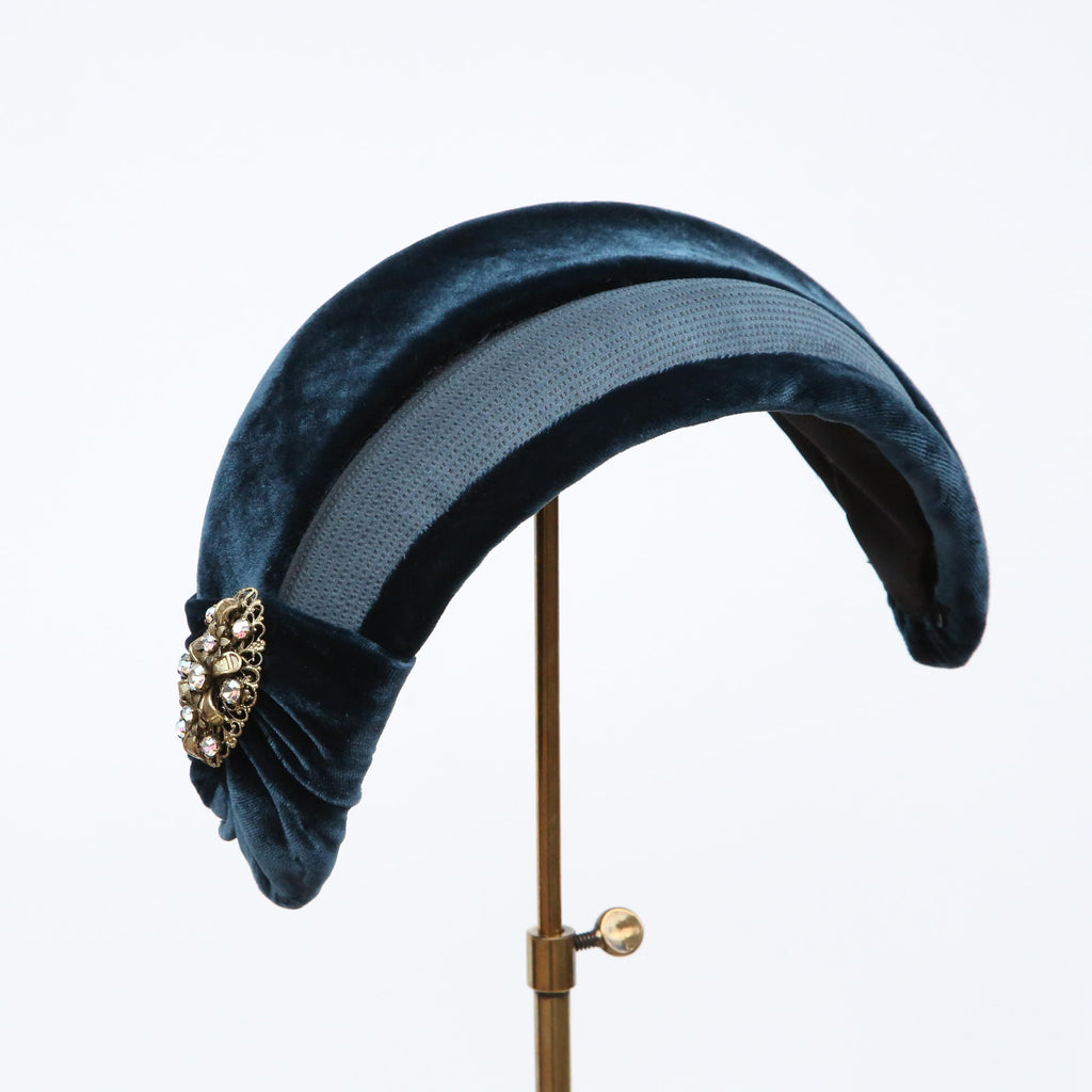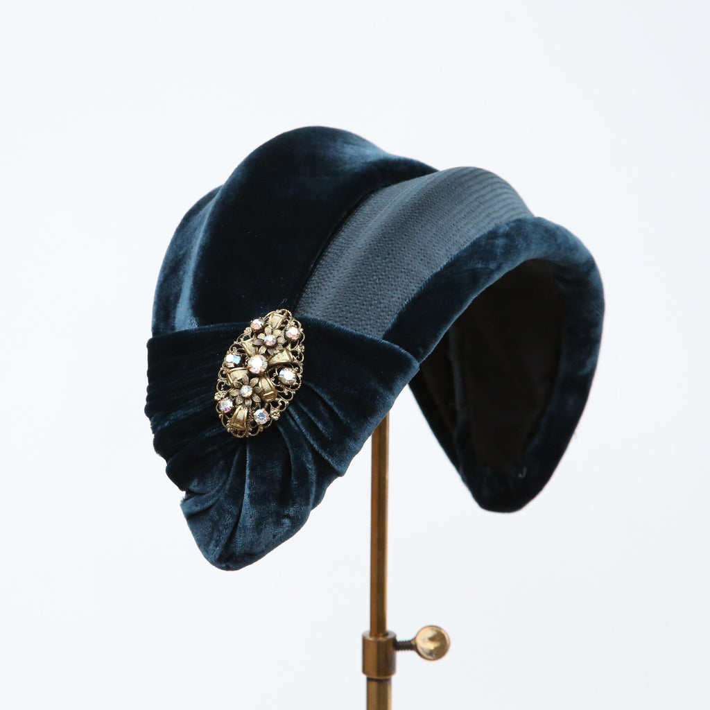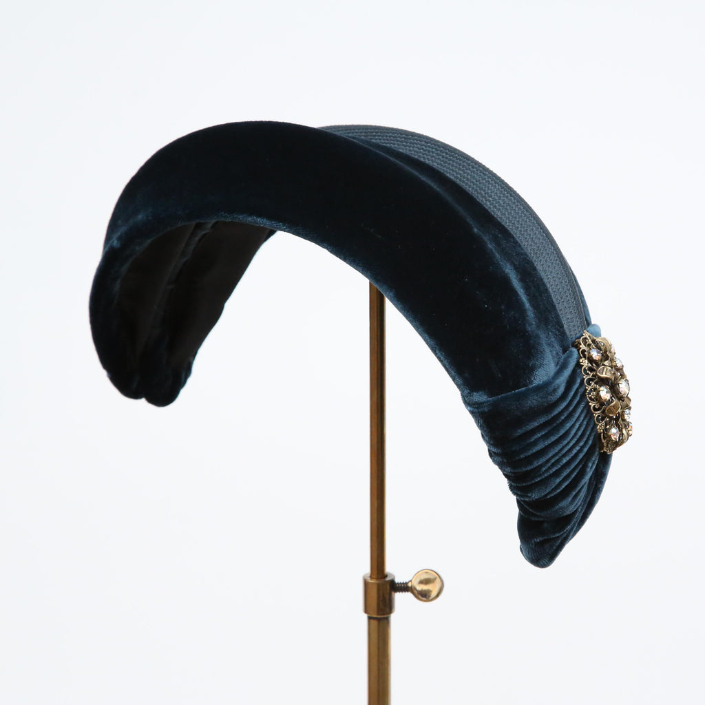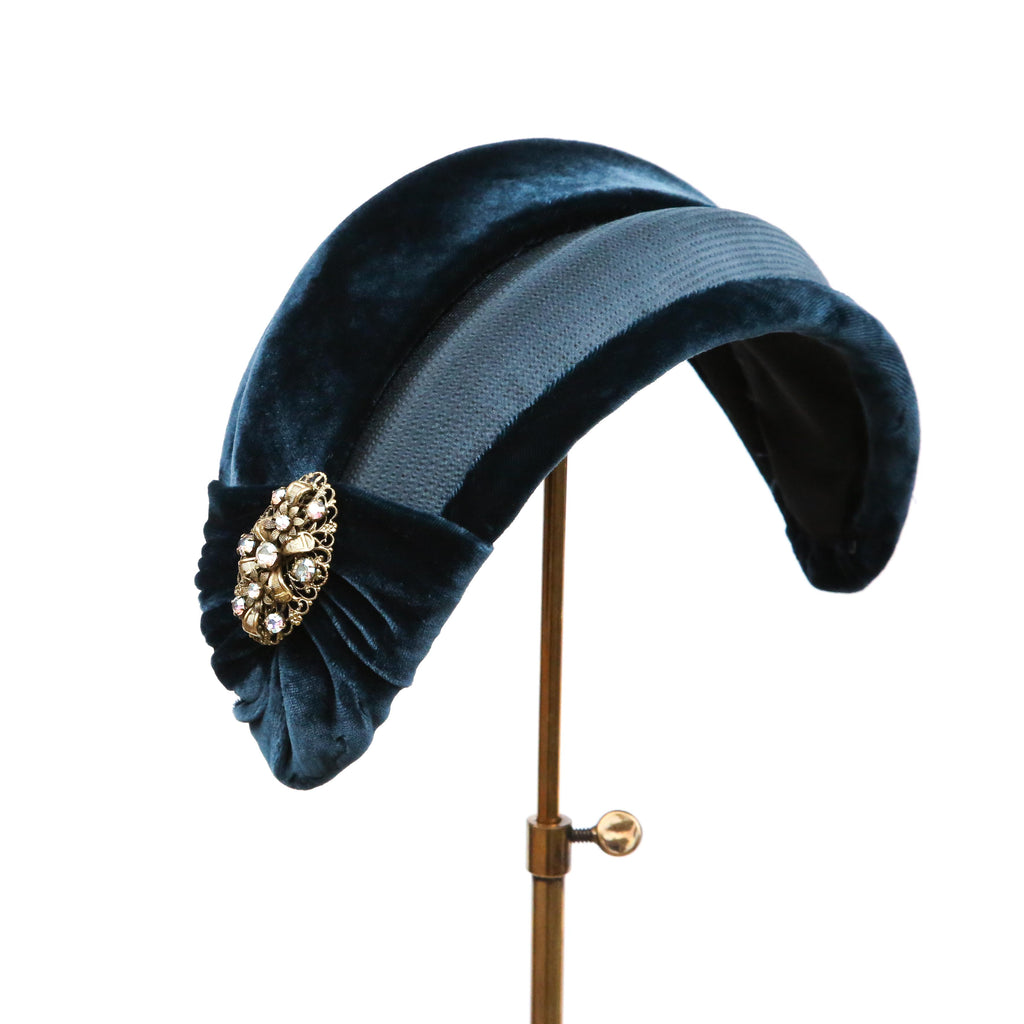 A dark teal hammered silk and silk velvet double bandeau, with silk velvet lip and velvet pleat, with a vintage brooch.