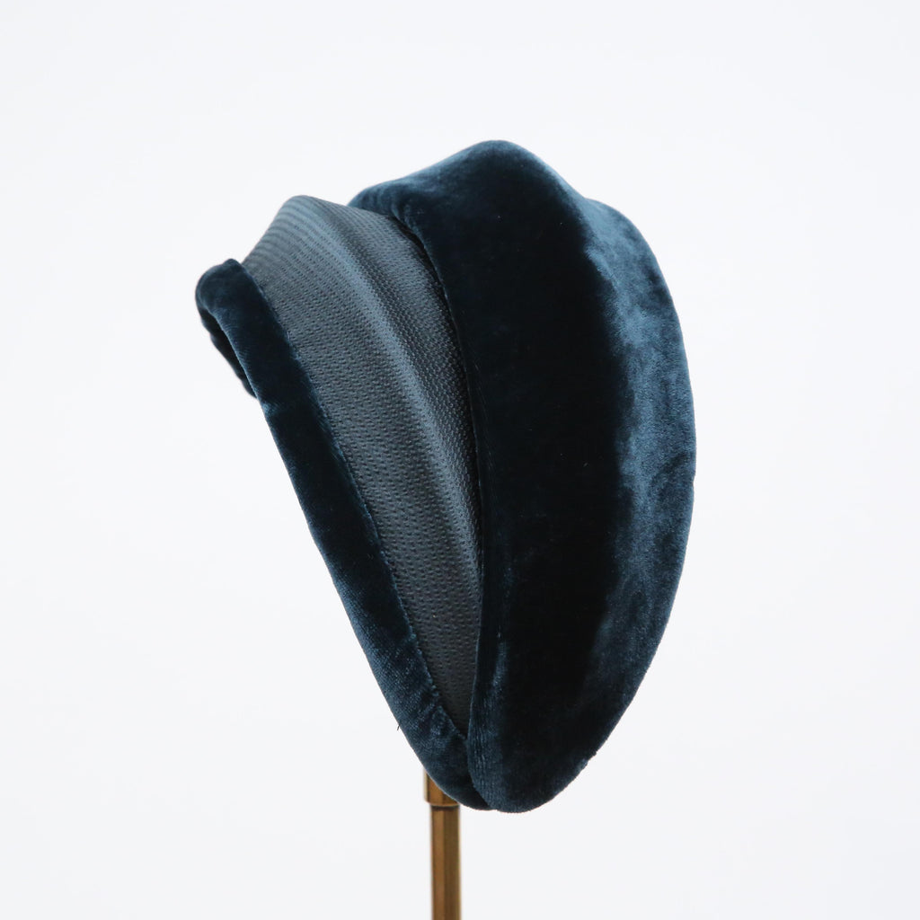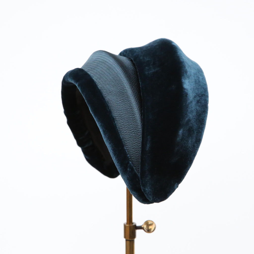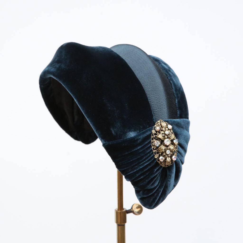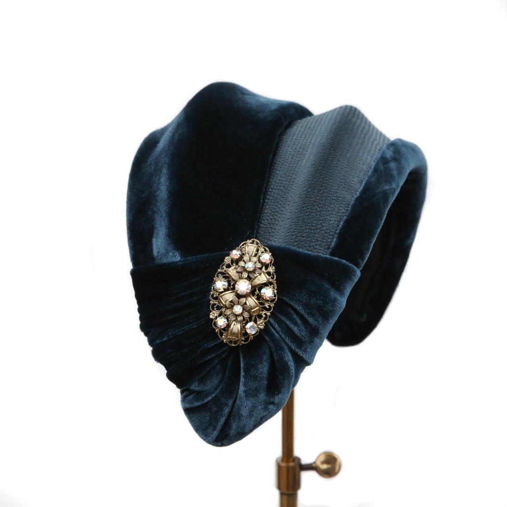 A dark teal hammered silk and silk velvet double bandeau, with silk velvet lip and velvet pleat, with a vintage brooch.
