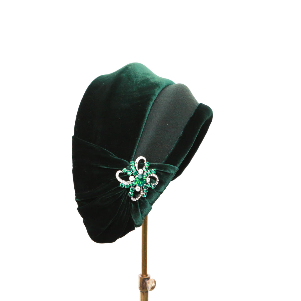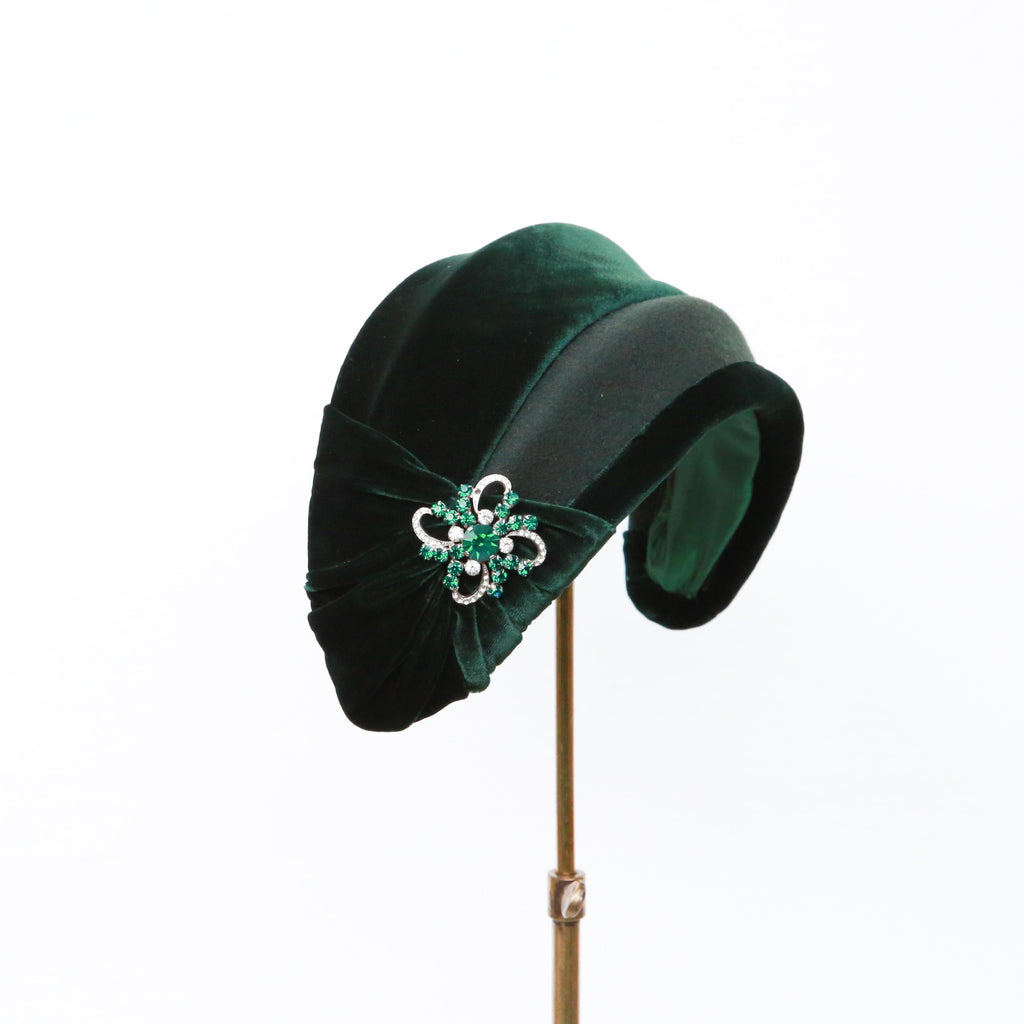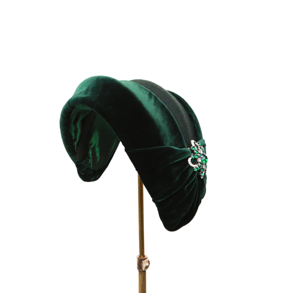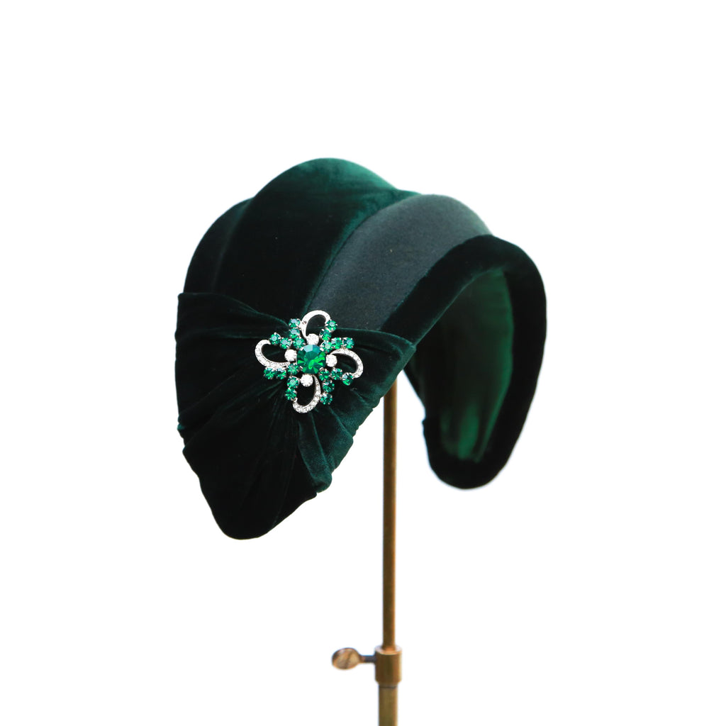 A double bandeau, made with dark bottle green silk velvet, and a complimentary wool/cashmere blend. Finished with a lip of silk velvet on the front bandeau, a pleat and a vintage brooch.