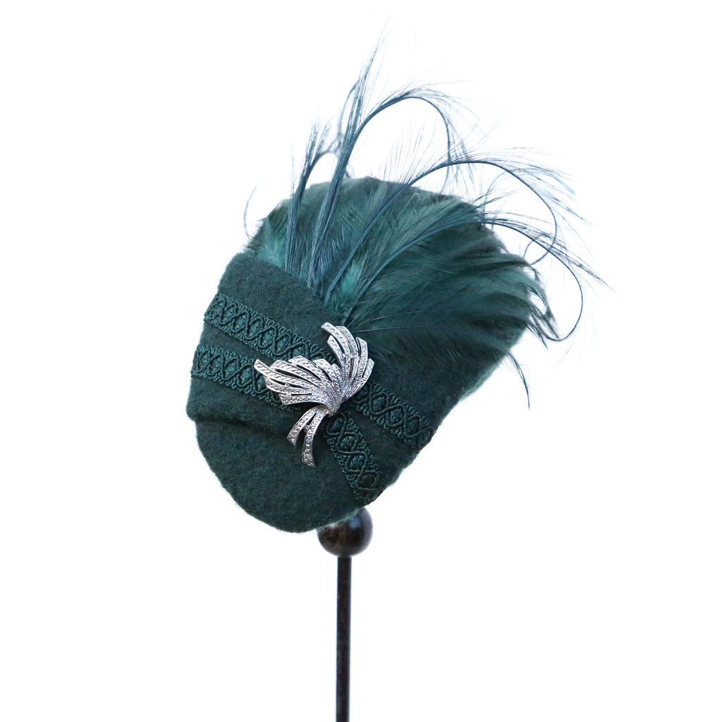 A green pure wool almond shaped headband, with  matching vintage feathers, burnt pheasant, a flat pleat with green braiding and a vintage marcasite brooch.
