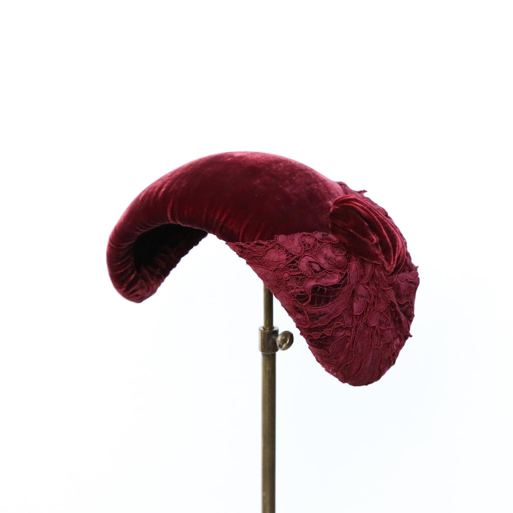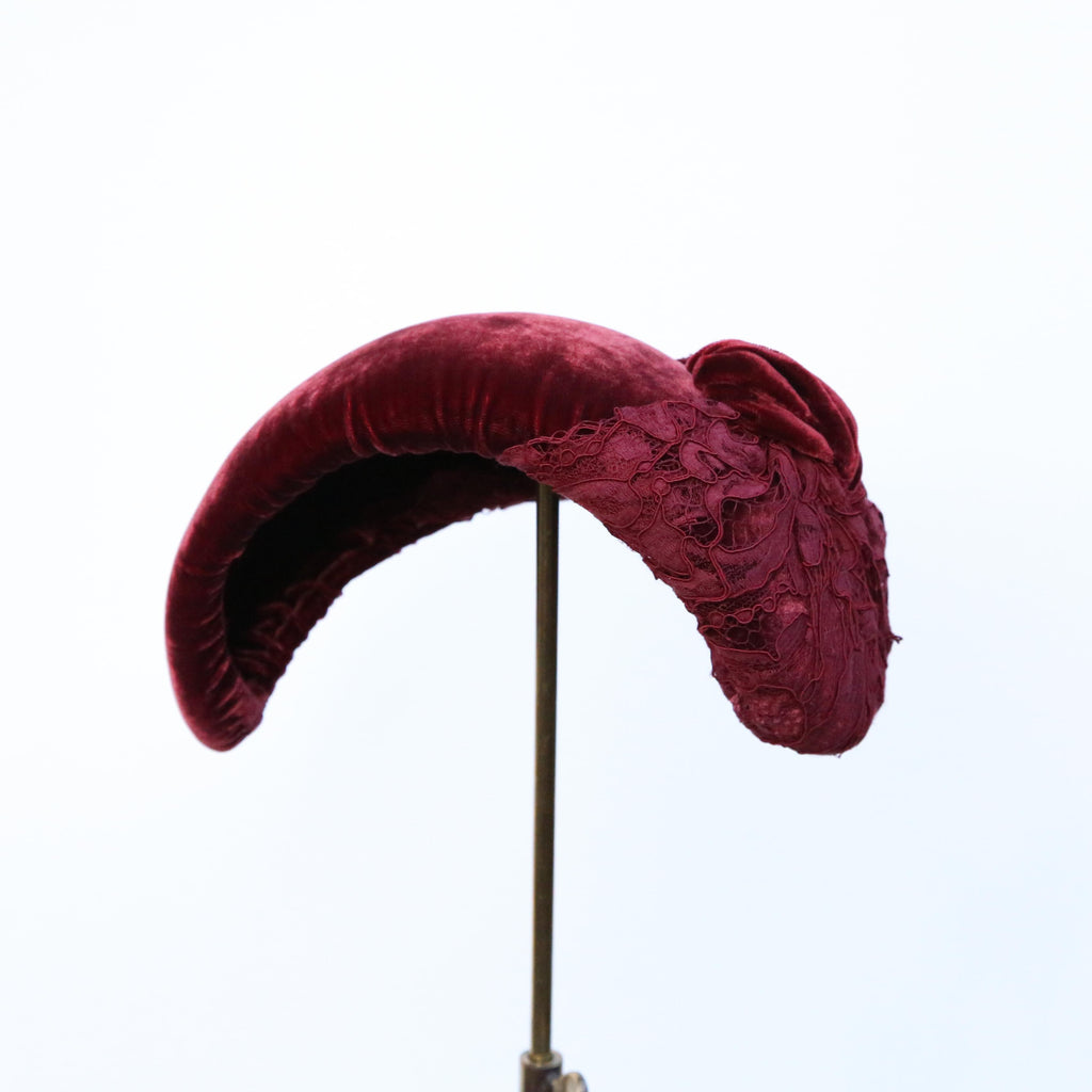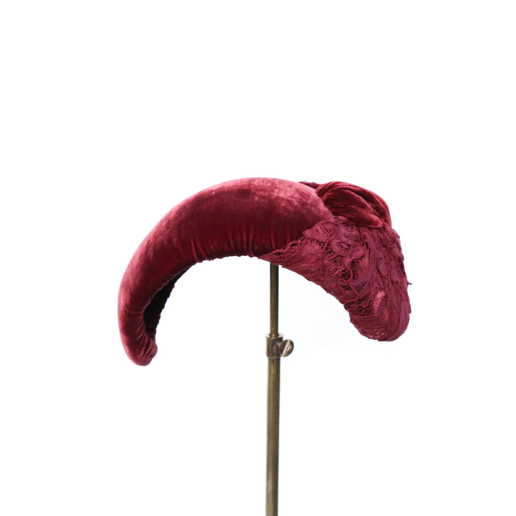 An old red silk velvet almond shaped headpiece, with complimentary coloured vintage lace bow and a velvet knot detail.