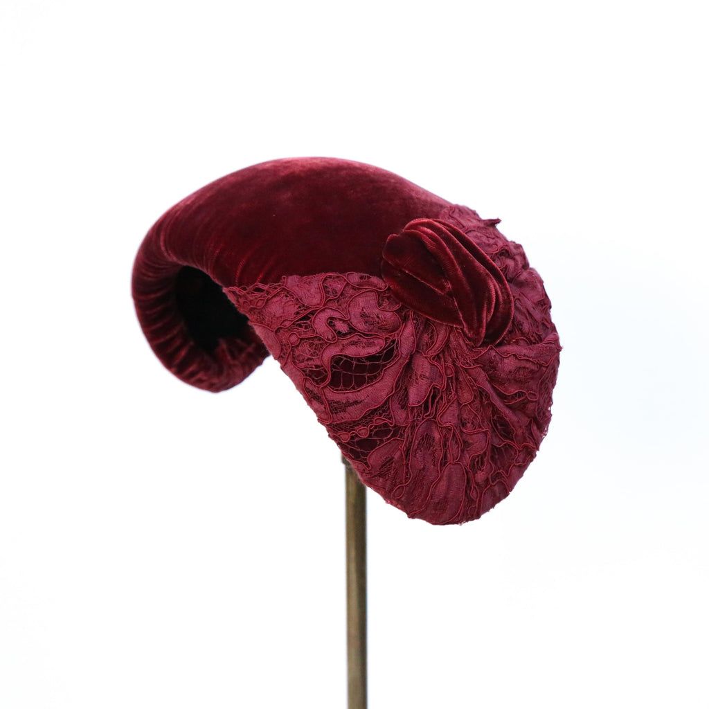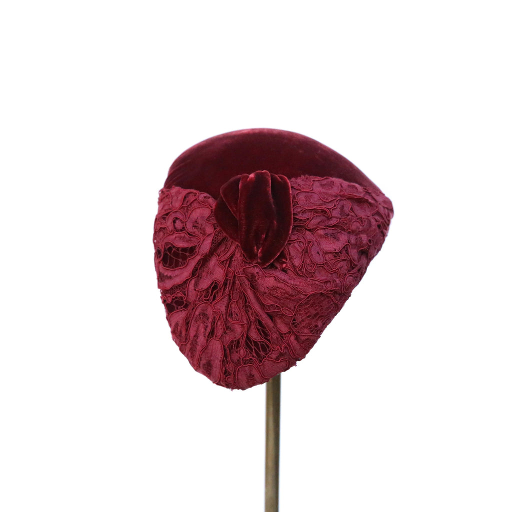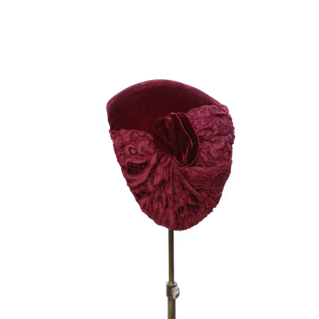 An old red silk velvet almond shaped headpiece, with complimentary coloured vintage lace bow and a velvet knot detail.