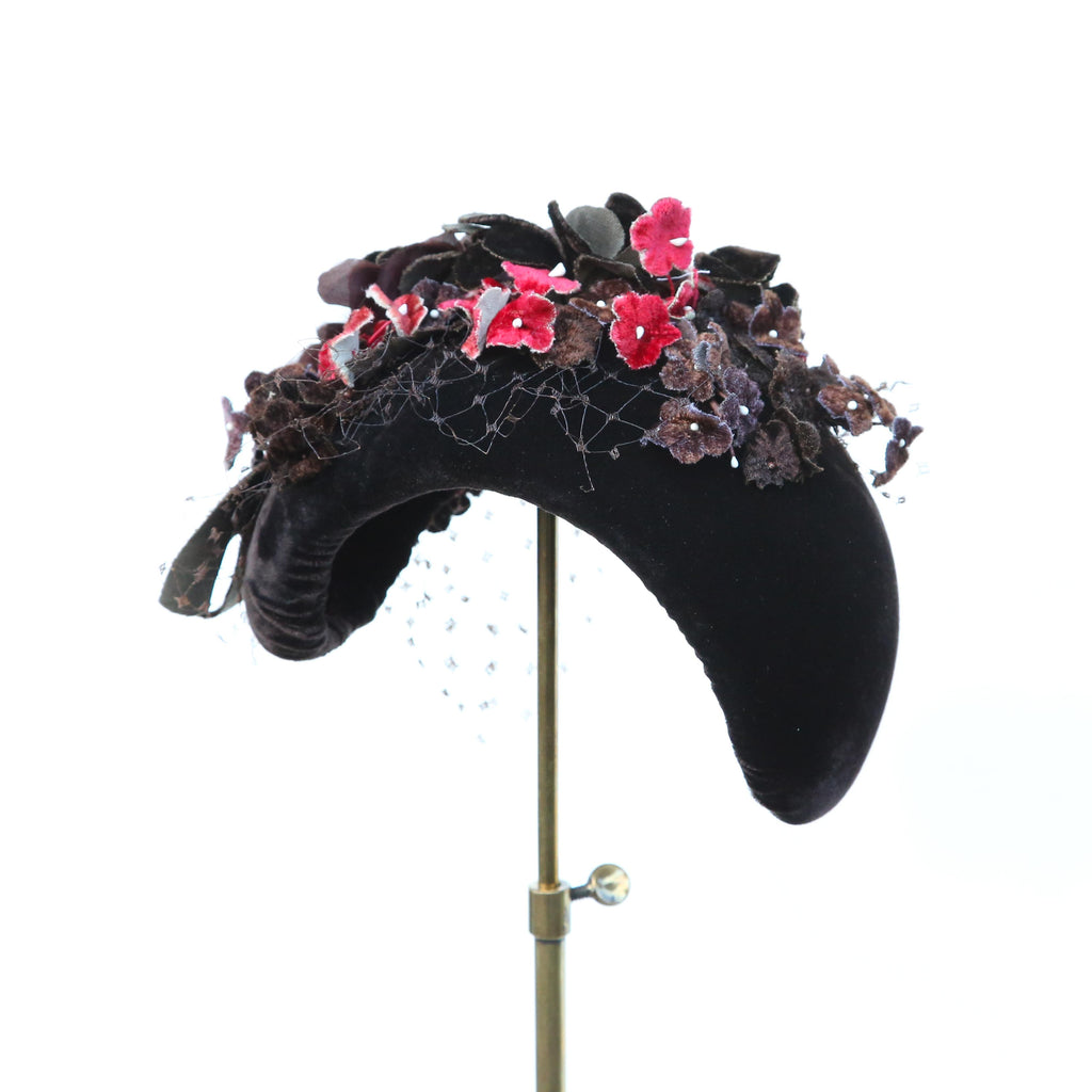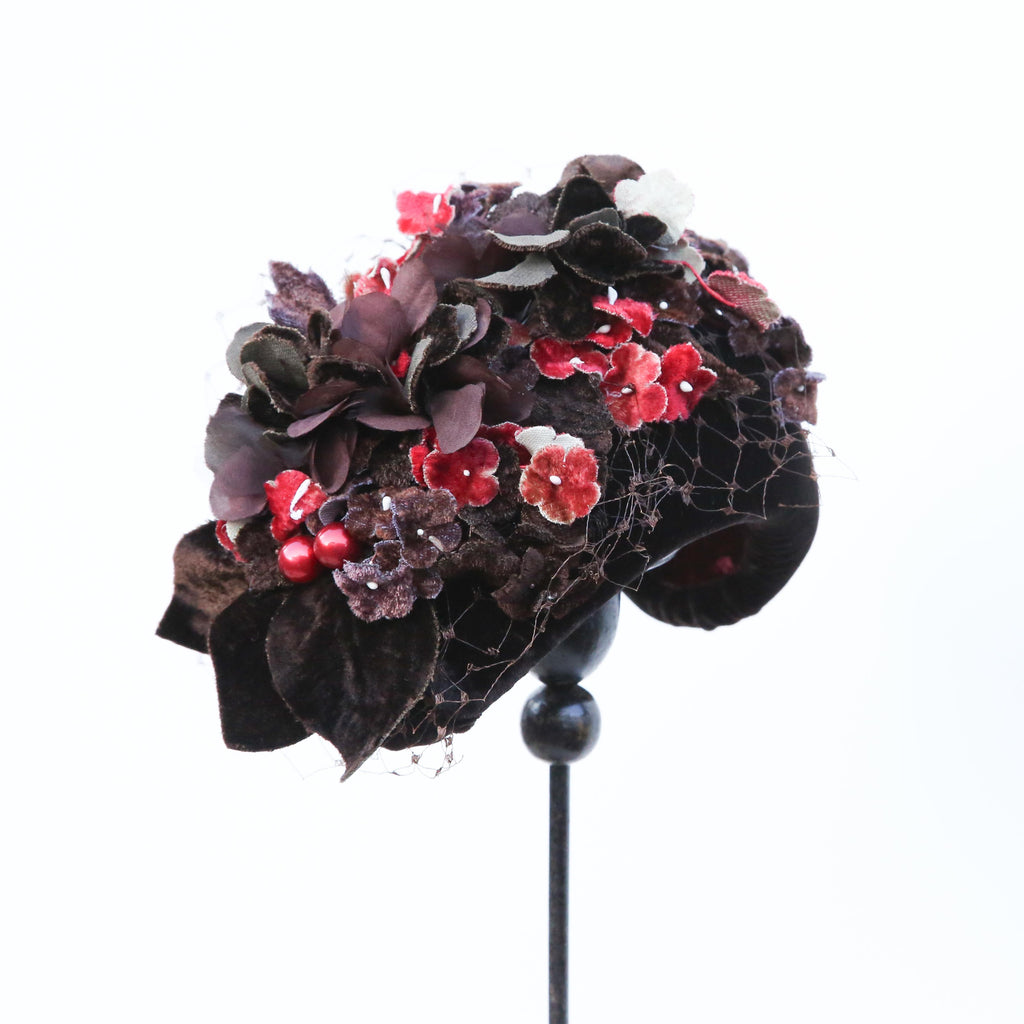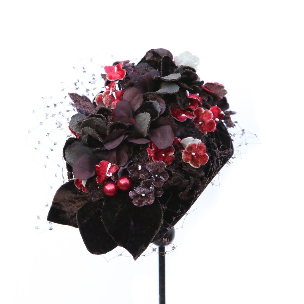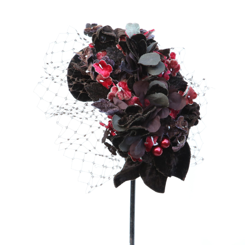 A rich dark brown velvet almond shaped headband, with vintage brown veiling, red velvet flowers and berries, and brown velvet and organza flowers and leaves.