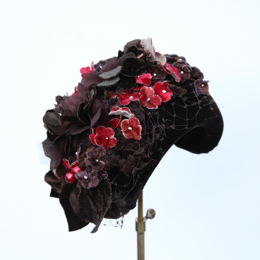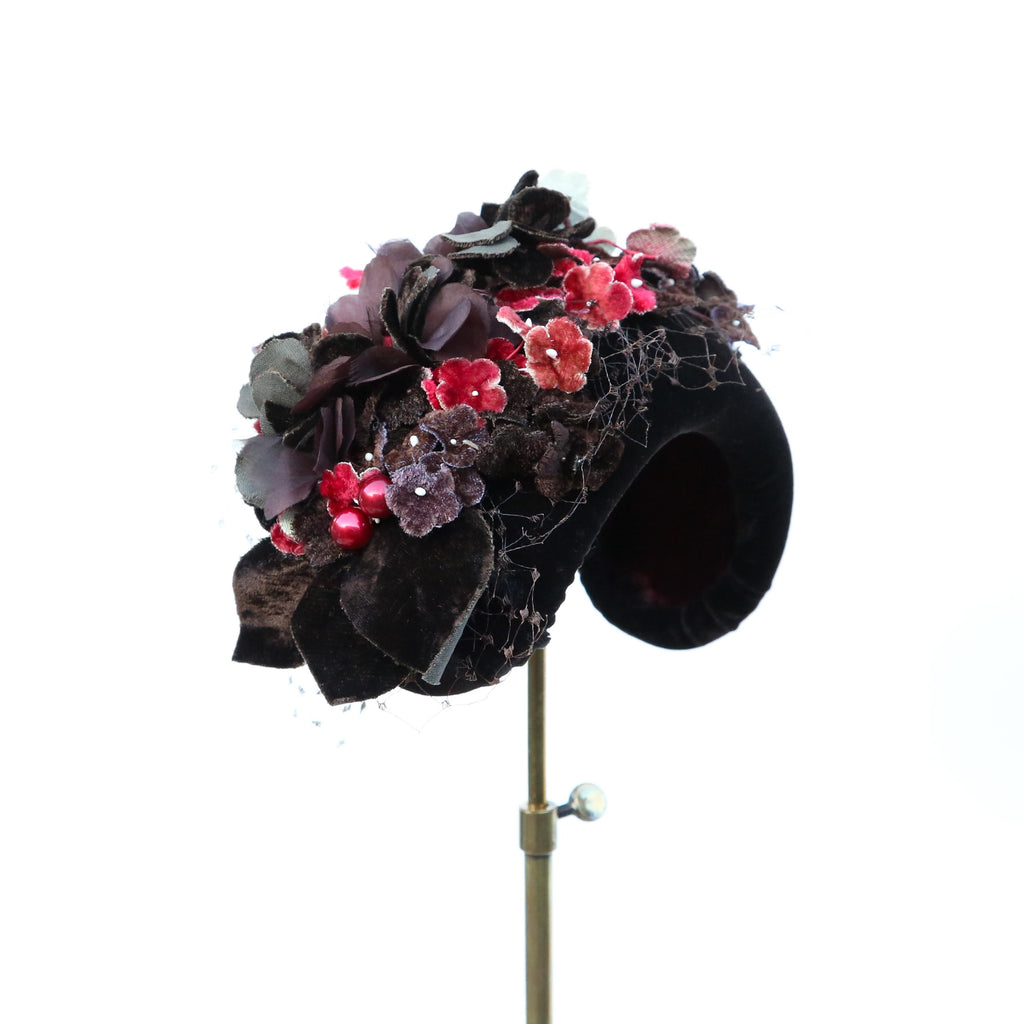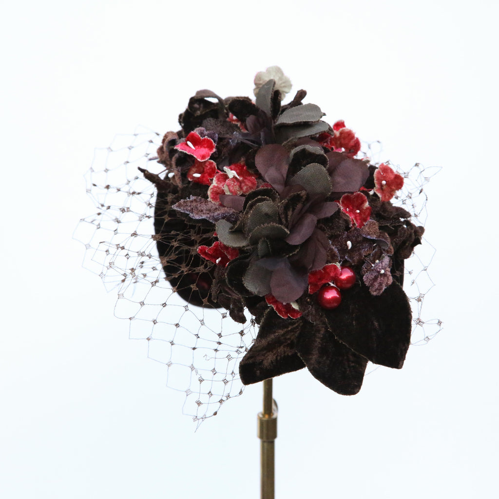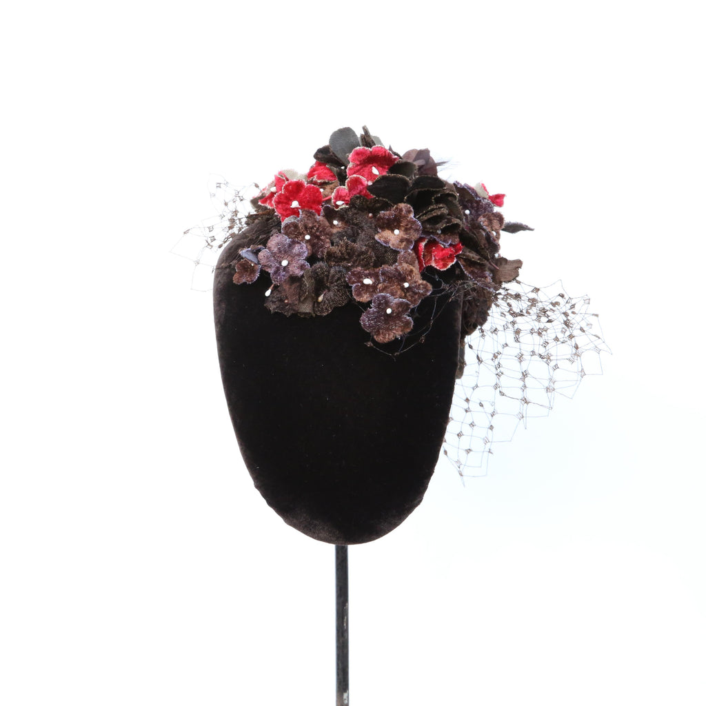 A rich dark brown velvet almond shaped headband, with vintage brown veiling, red velvet flowers and berries, and brown velvet and organza flowers and leaves.