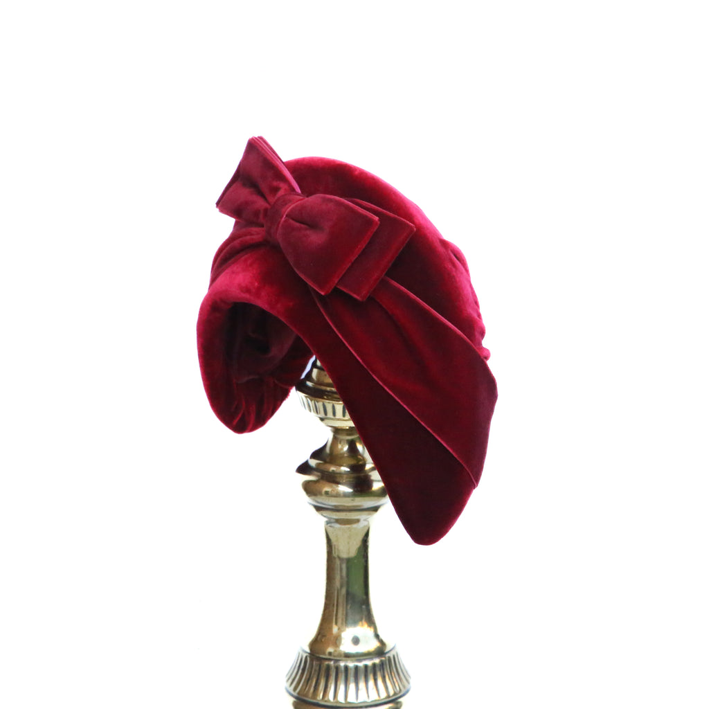 Red silk velvet high moon headband with matching red velvet bow.