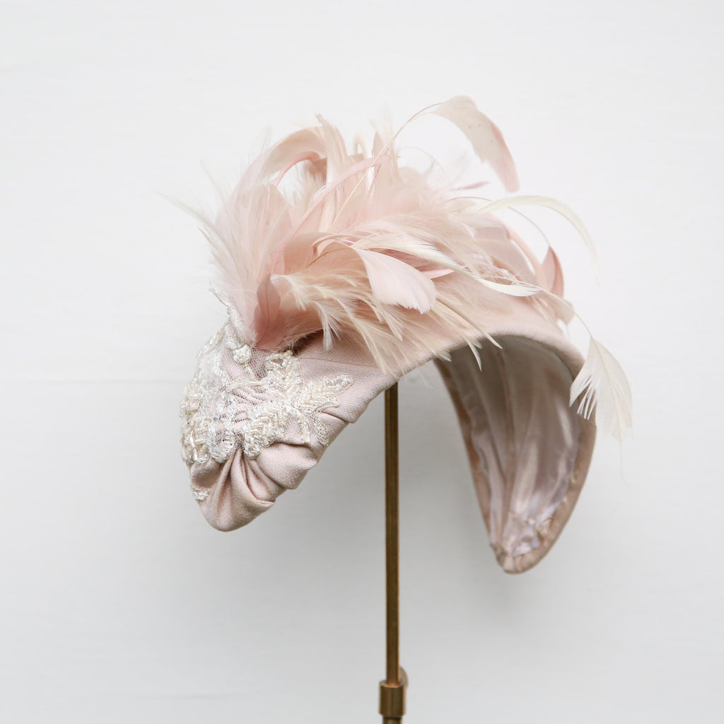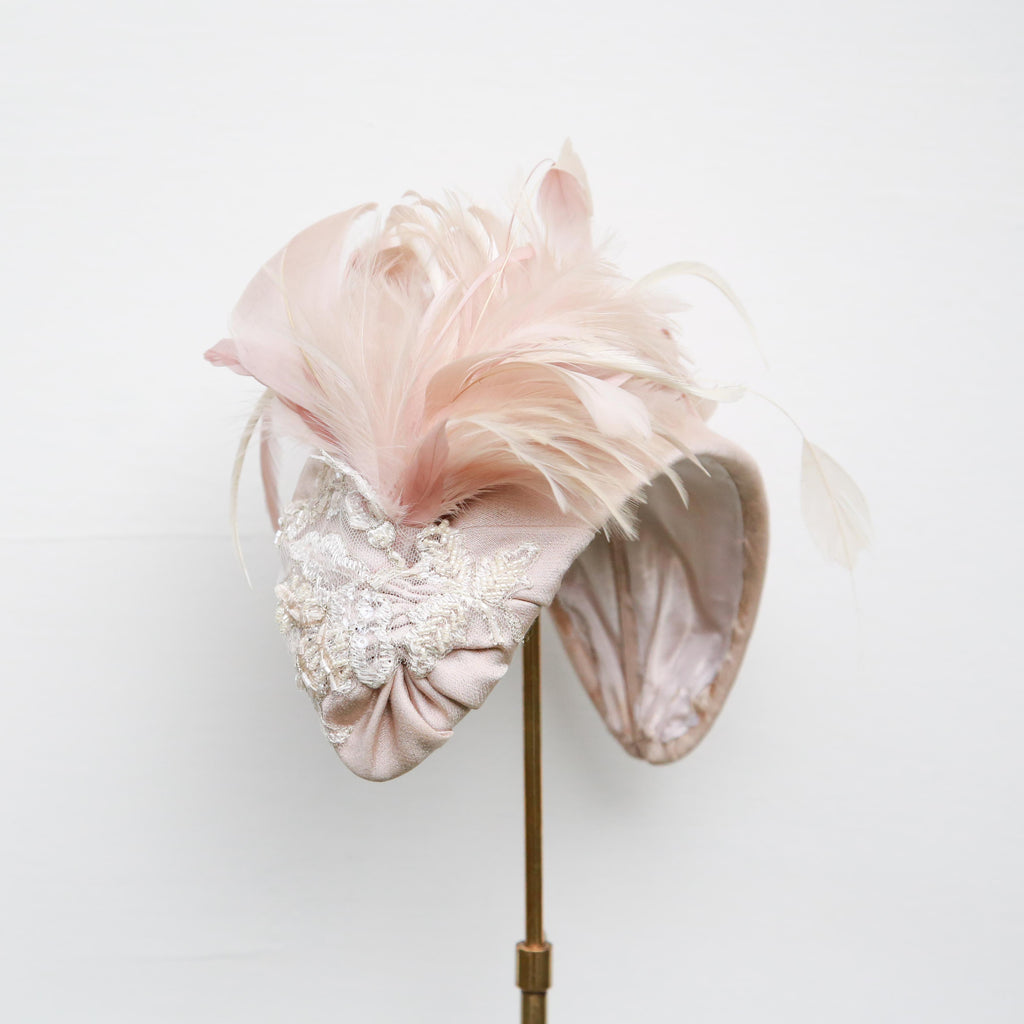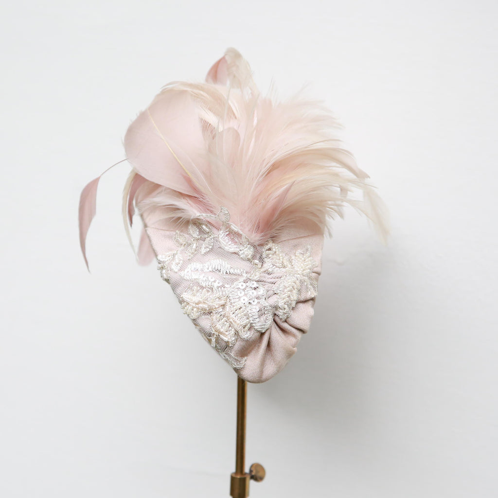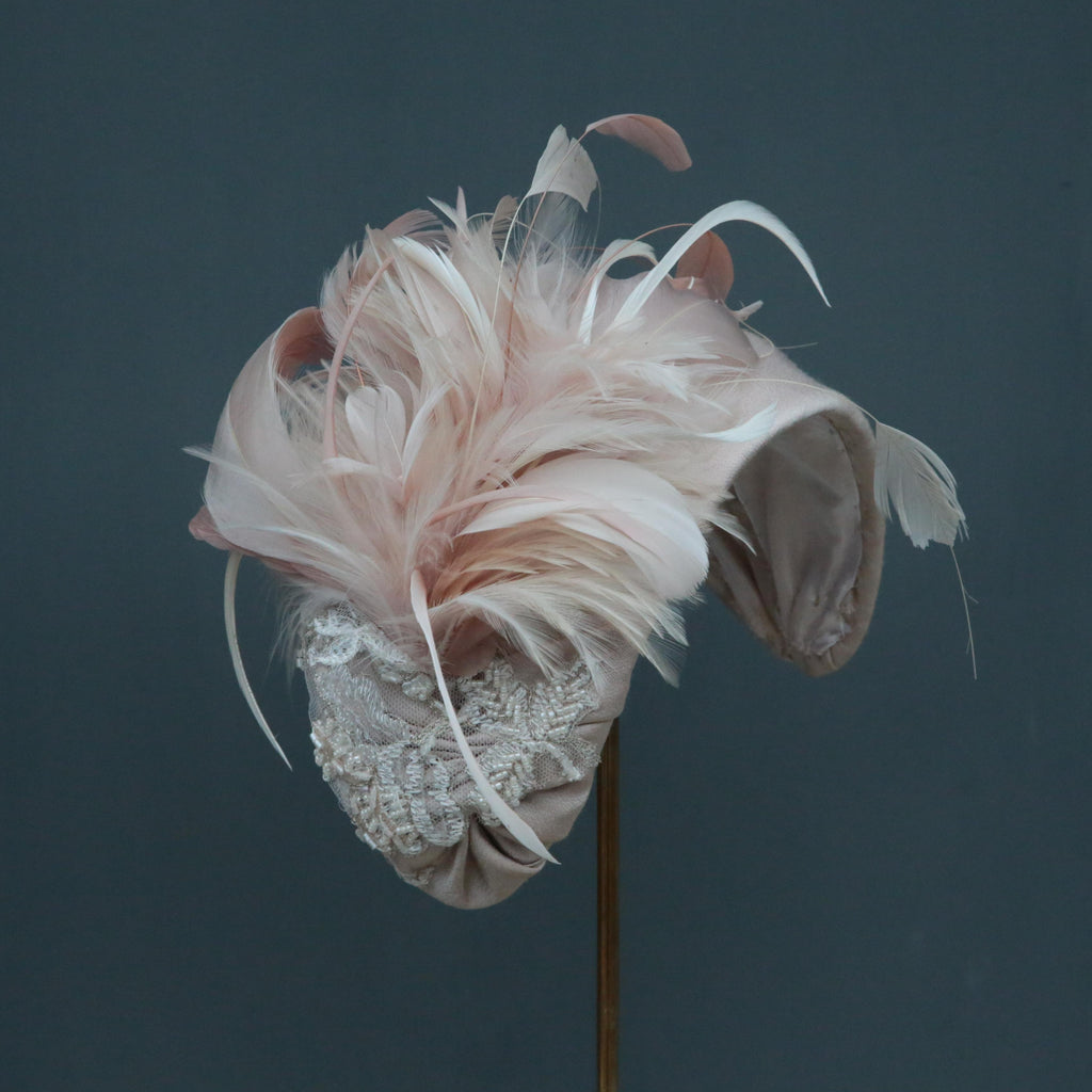 A think pale pink silk double bandeau, with a frooth of soft pink, nude and ivory goose feathers, a silk rouche, and emroided and lightly beaded lace pleat.