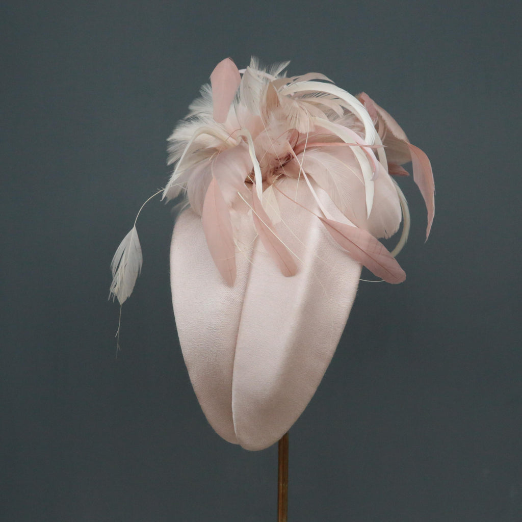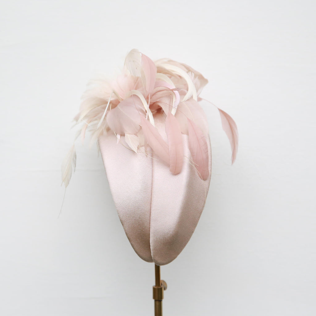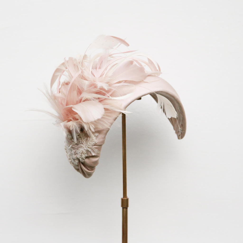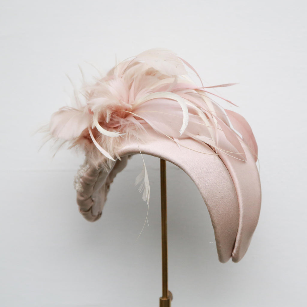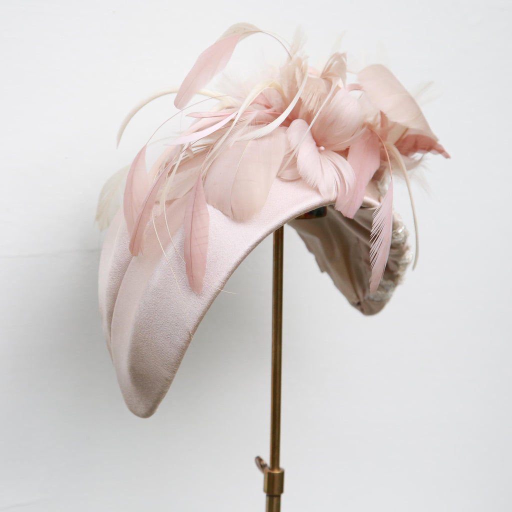 A think pale pink silk double bandeau, with a frooth of soft pink, nude and ivory goose feathers, a silk rouche, and emroided and lightly beaded lace pleat.