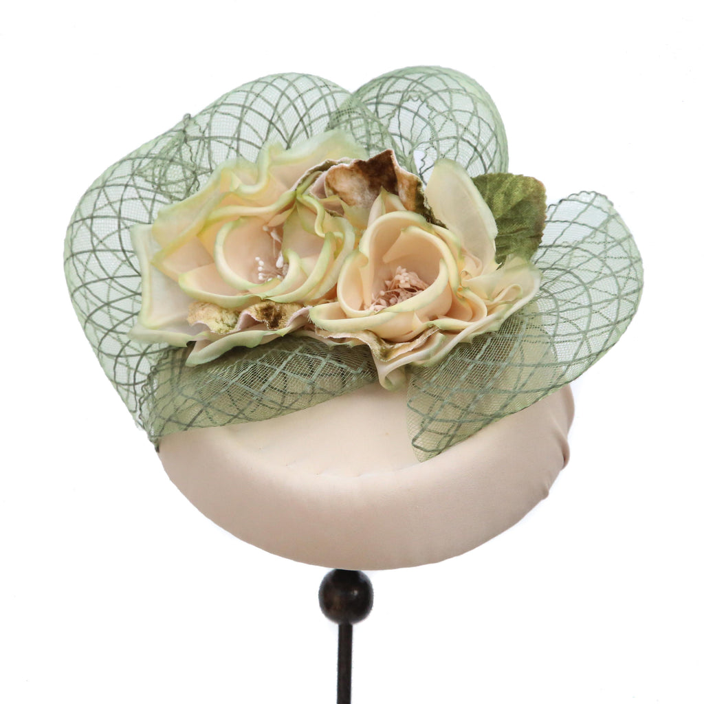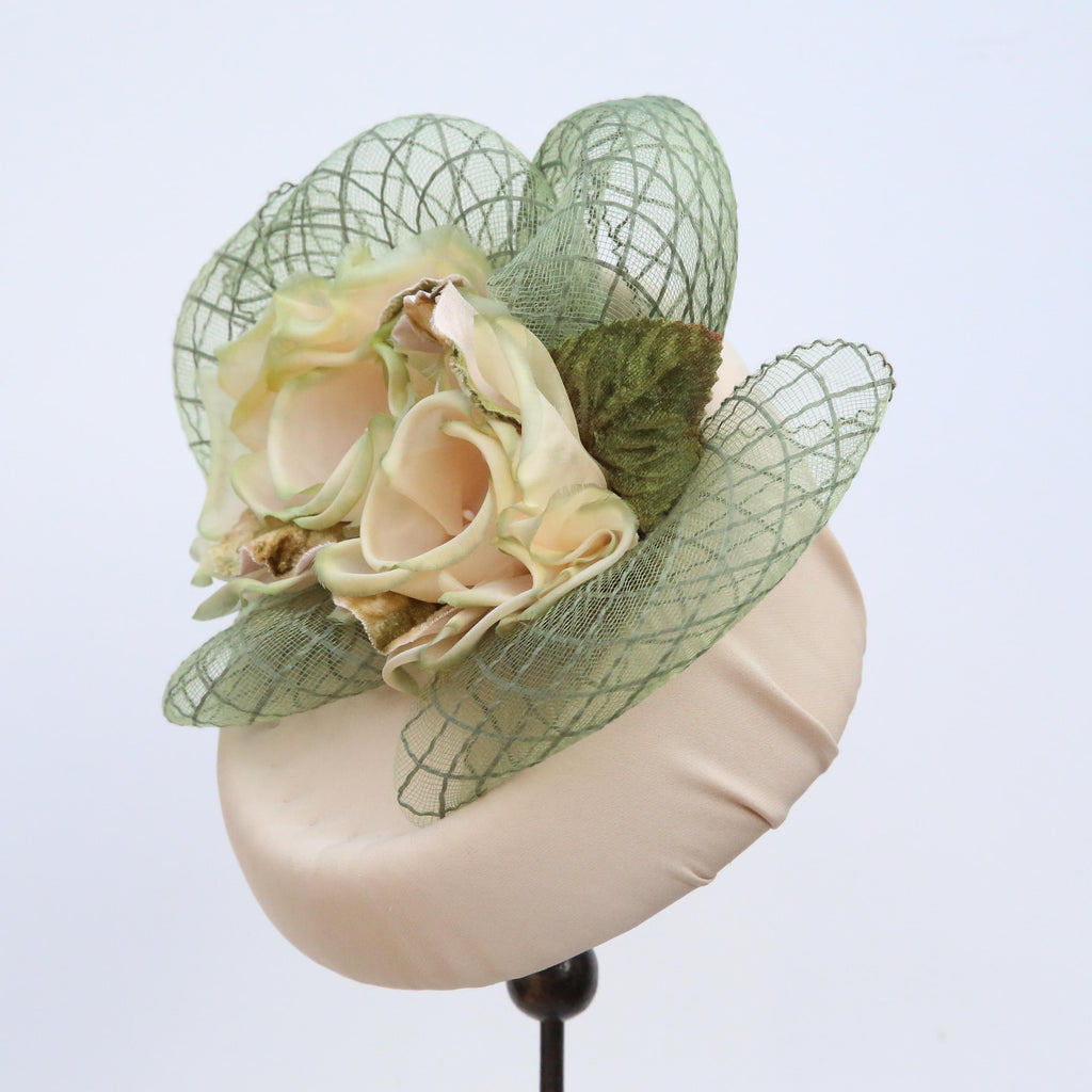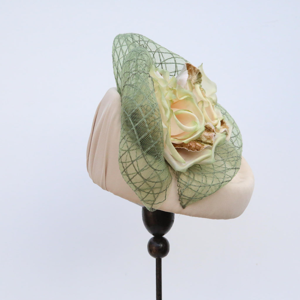 A stone-nude matt silk little high tear pillbox, with a high point at the back, with soft bows of sage green crinoline, a vintage velvet leaf, and two velvet and silk roses.