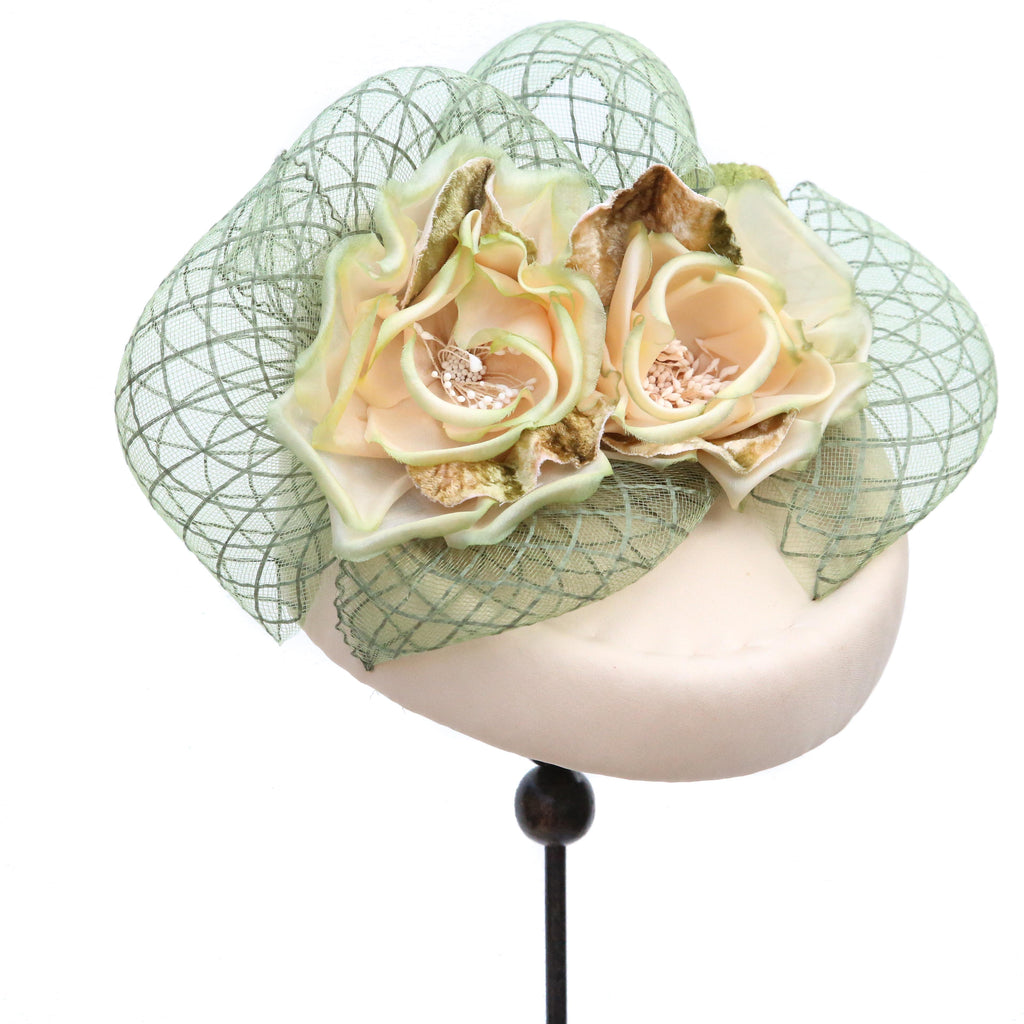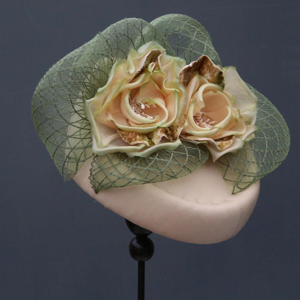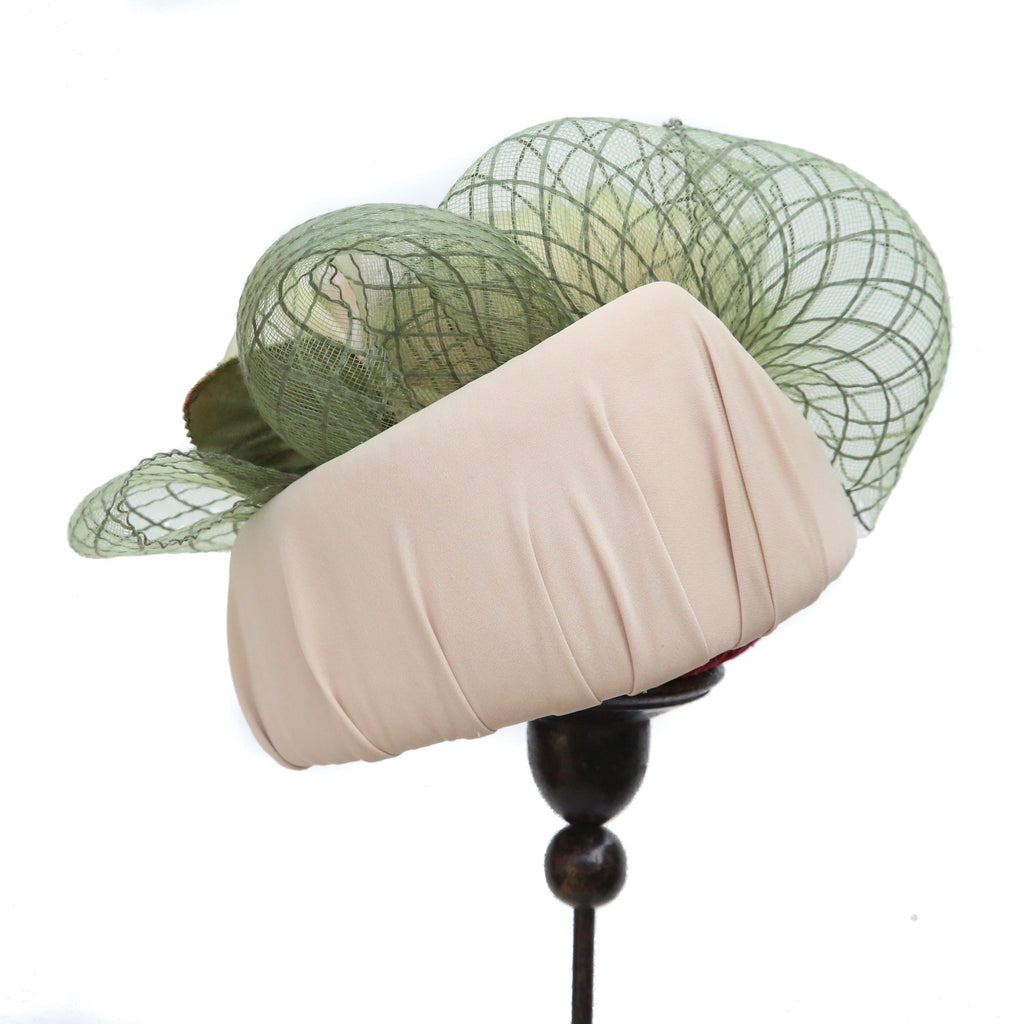 A stone-nude matt silk little high tear pillbox, with a high point at the back, with soft bows of sage green crinoline, a vintage velvet leaf, and two velvet and silk roses.