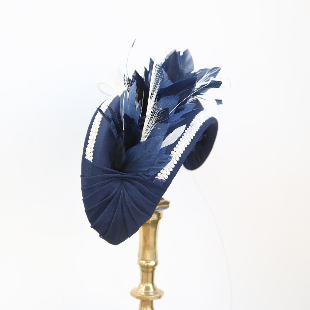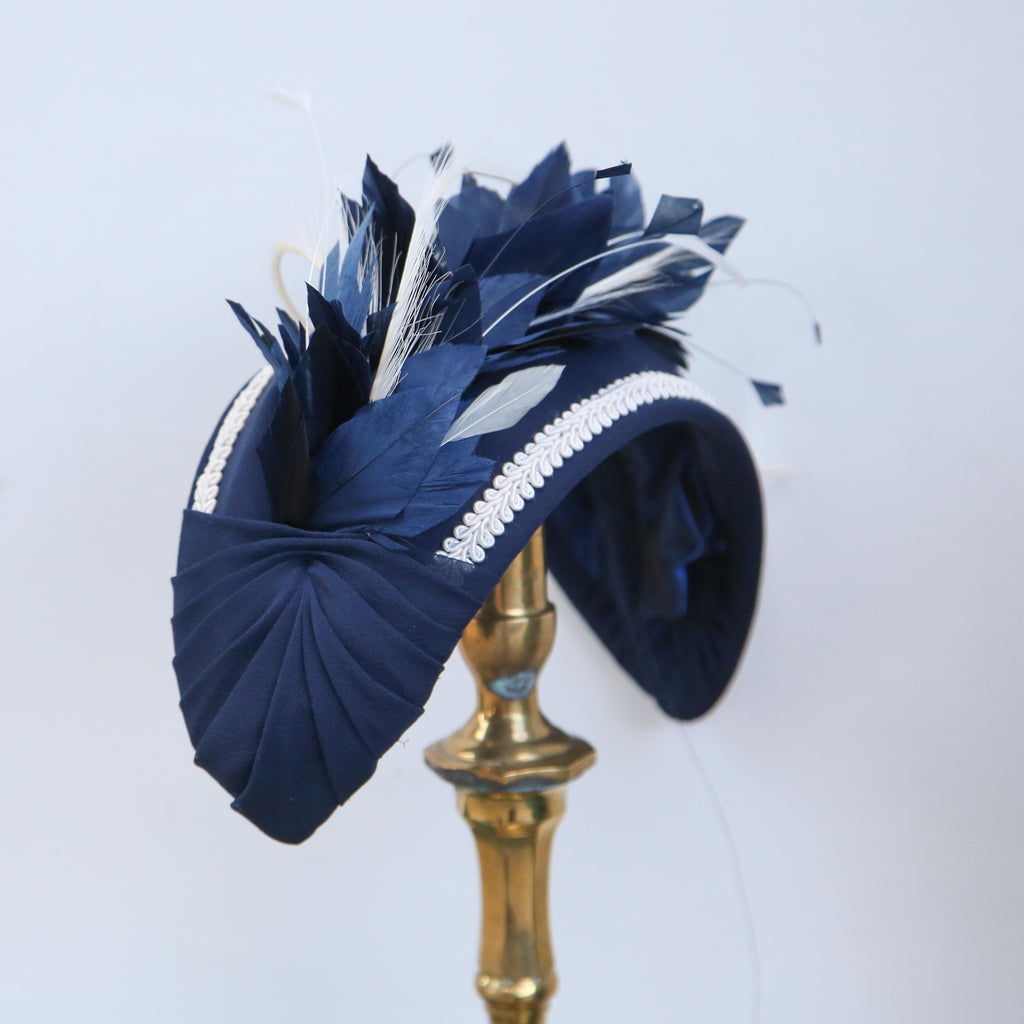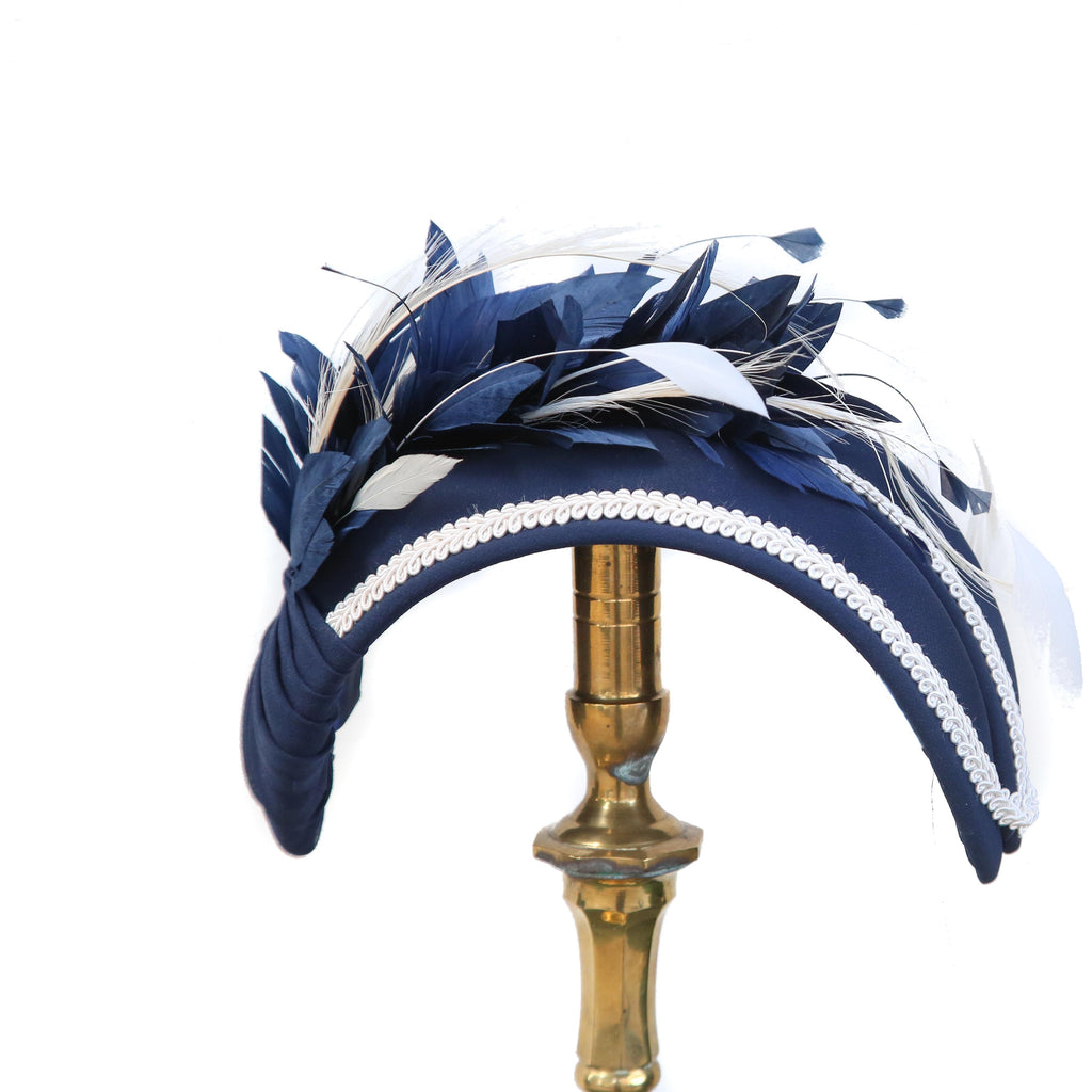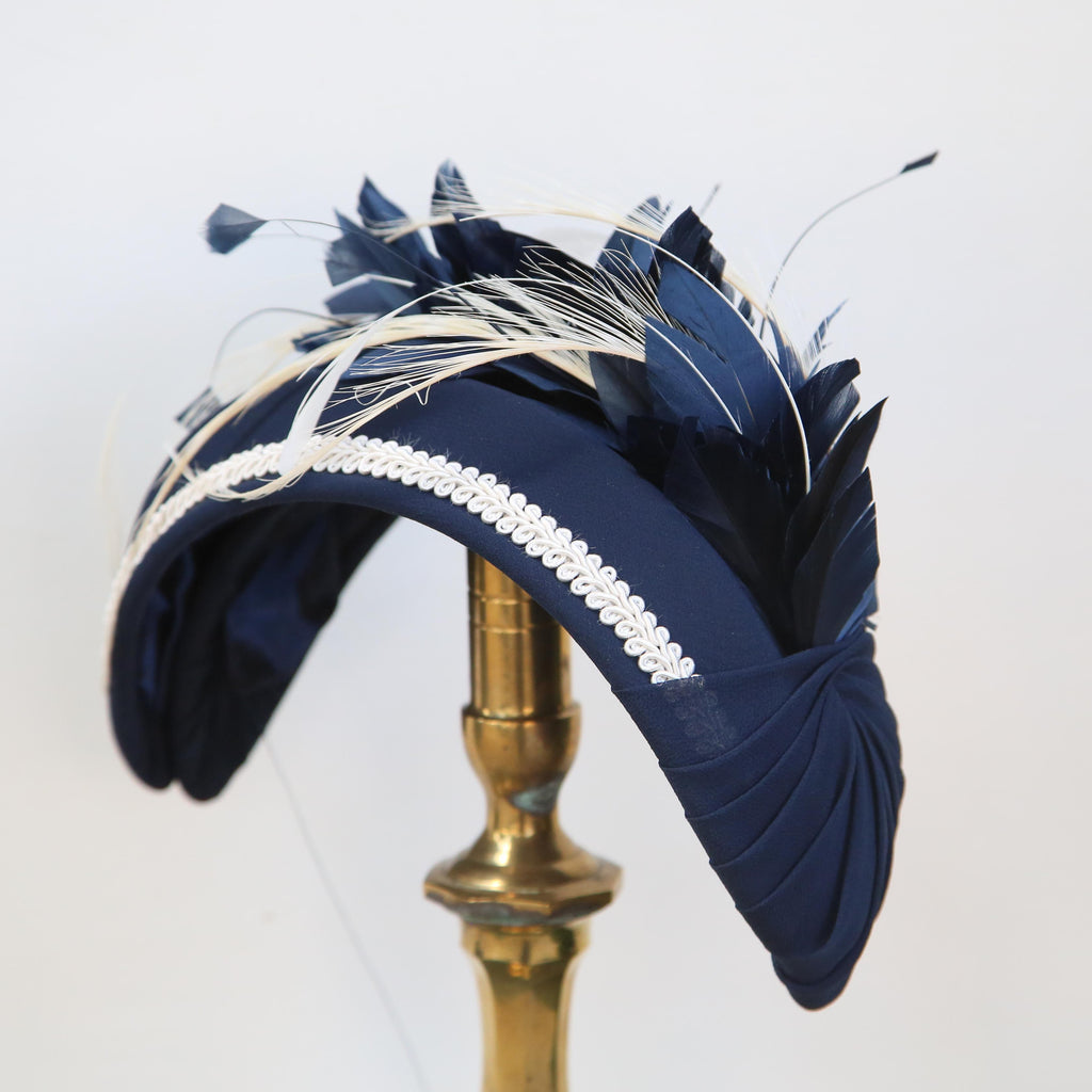 A navy blue fine silk georgette double bandeau, with ivory silk braiding, and plume of navy goose feathers with ivory stripped coque and ivory burnt pheasant, and a georgette pleat at the side.