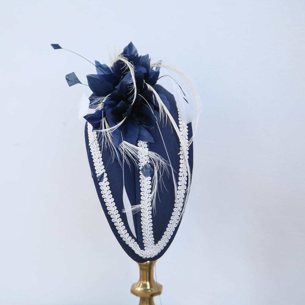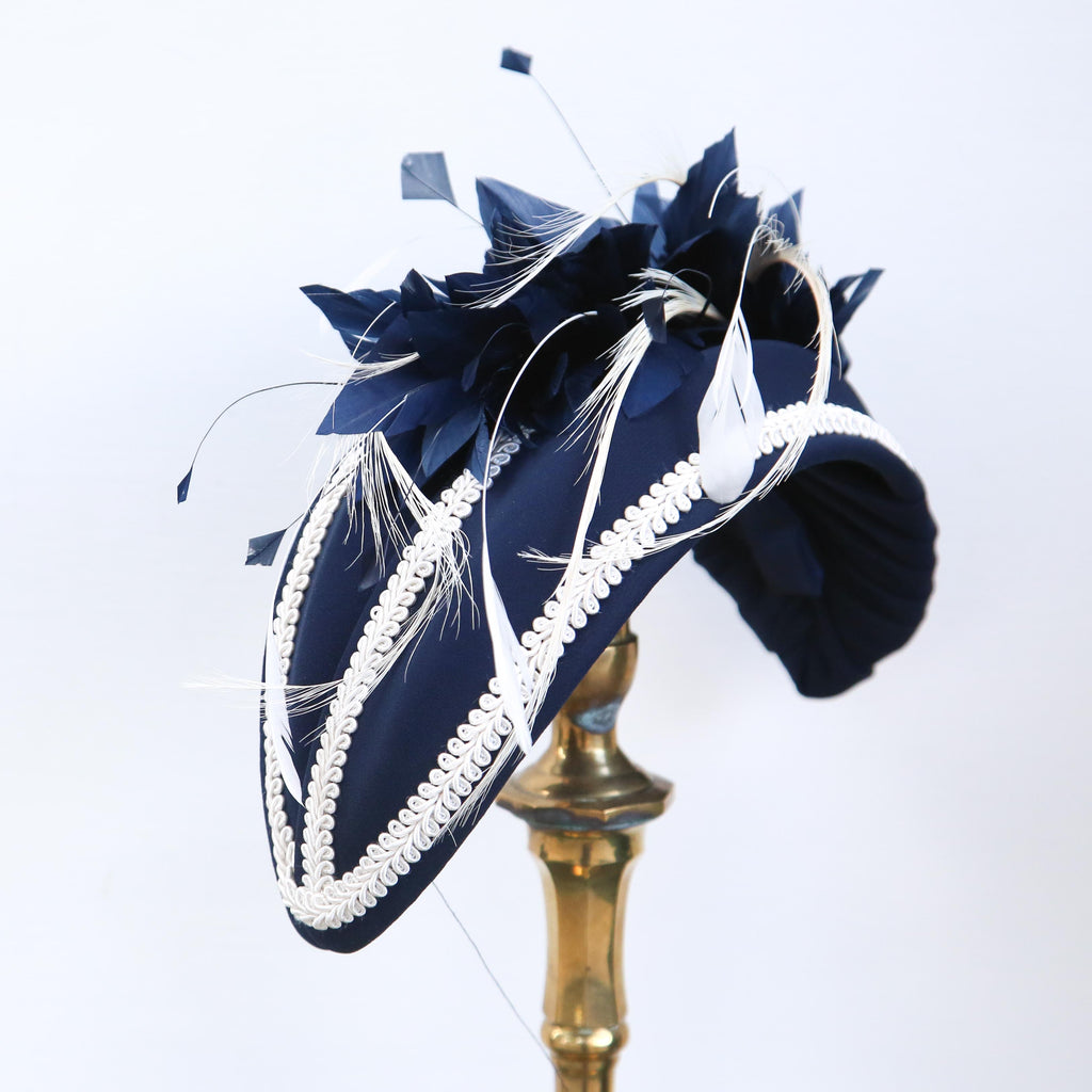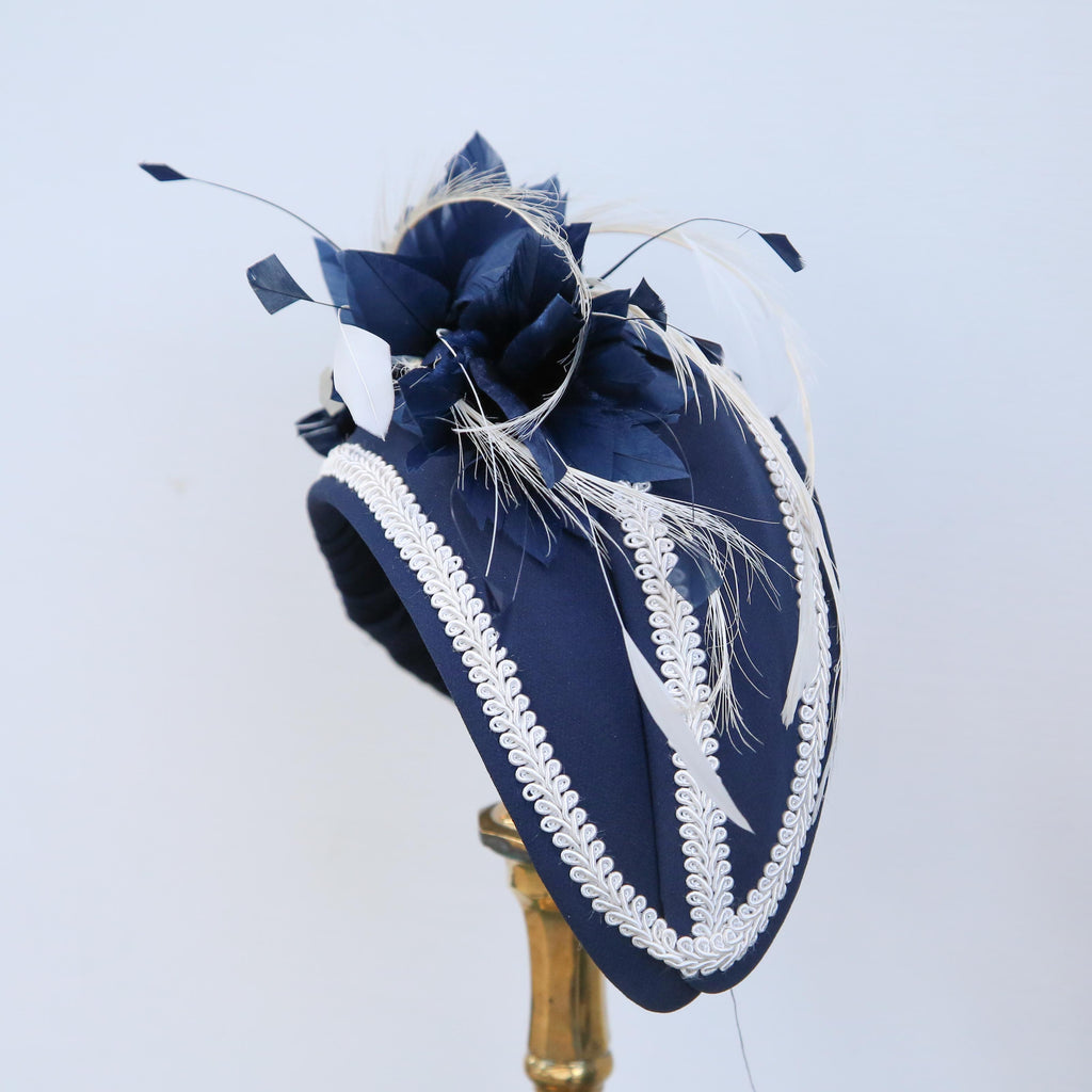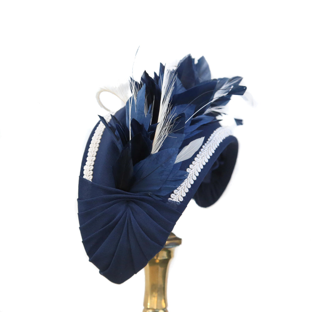 A navy blue fine silk georgette double bandeau, with ivory silk braiding, and plume of navy goose feathers with ivory stripped coque and ivory burnt pheasant, and a georgette pleat at the side.