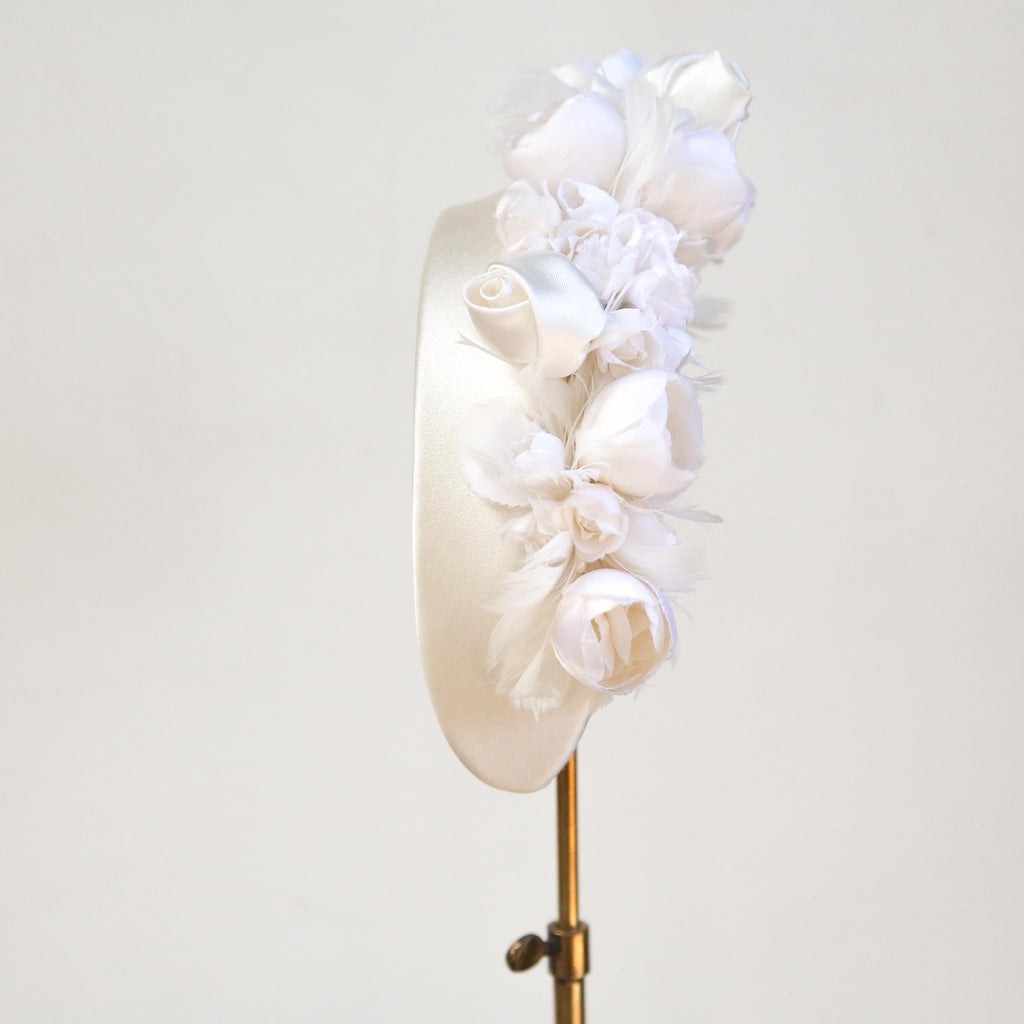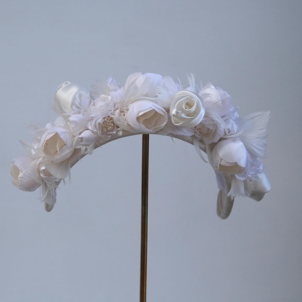 An ivory heavy silk ridged bandeau headband, with ivory, cream and white silk and paper flowers, and ivory feathered flower petals.
