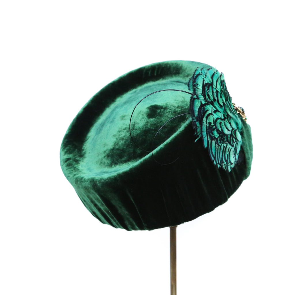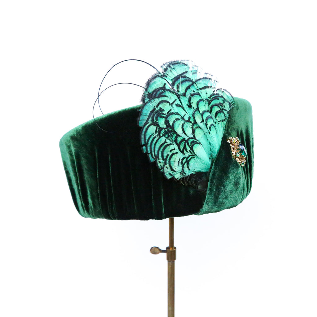 A Beautiful emerald green silk velvet tall waves topped cossack, with vintage bright green dyed feathers, two black vintage bird of paradise quills and an antique paste gold and green brooch.
