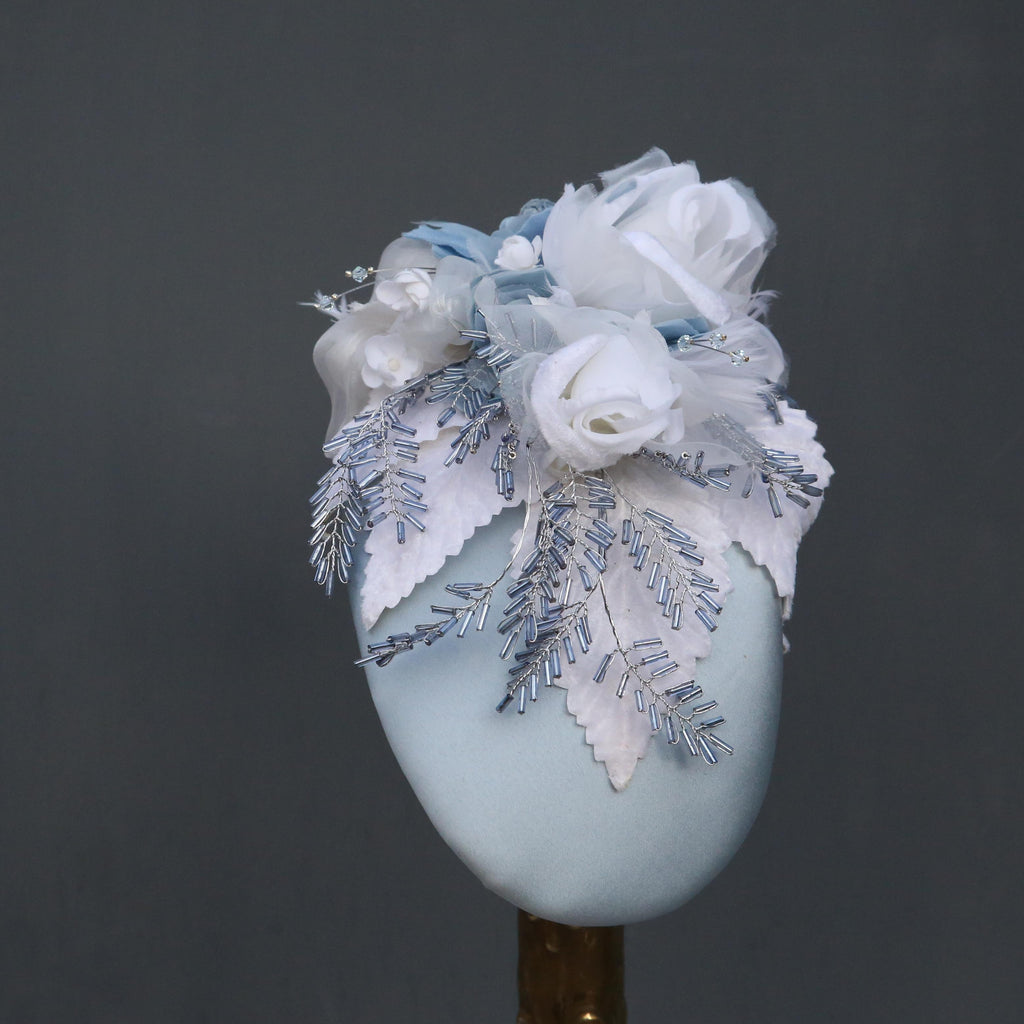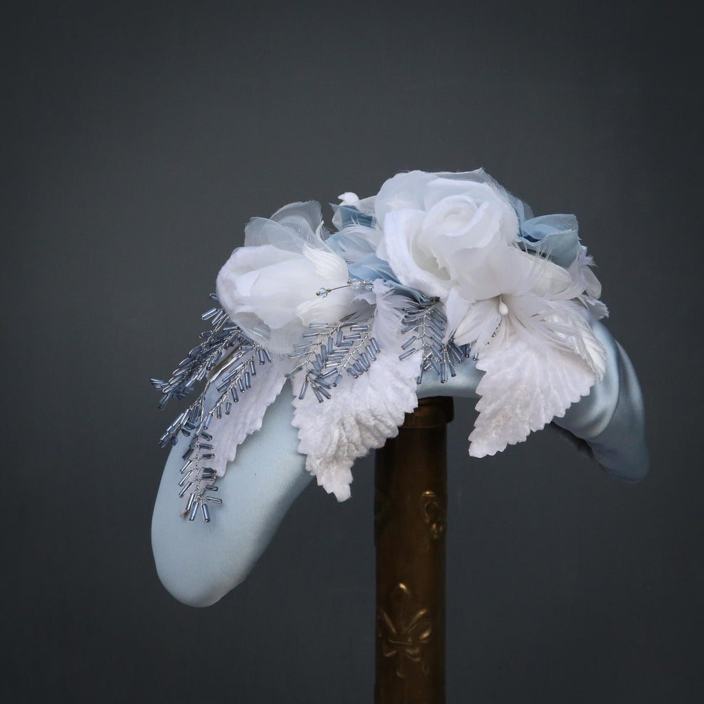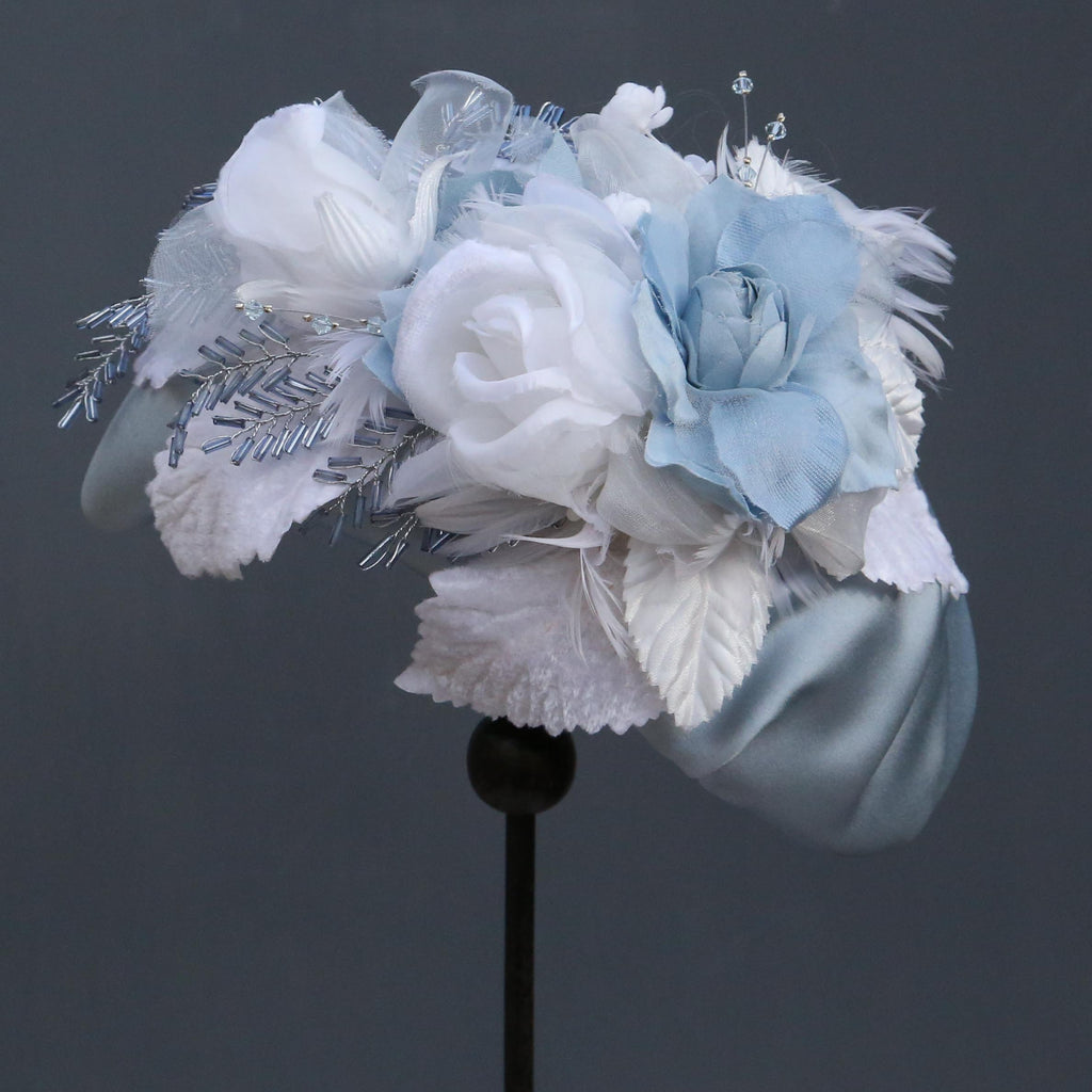 A blue silk headband, with handmade flowers made in the same silk, and other organzas, with white chiffon flowers, white velvet leaves, ivory feathered flowers and blue and silver beaded leaves.