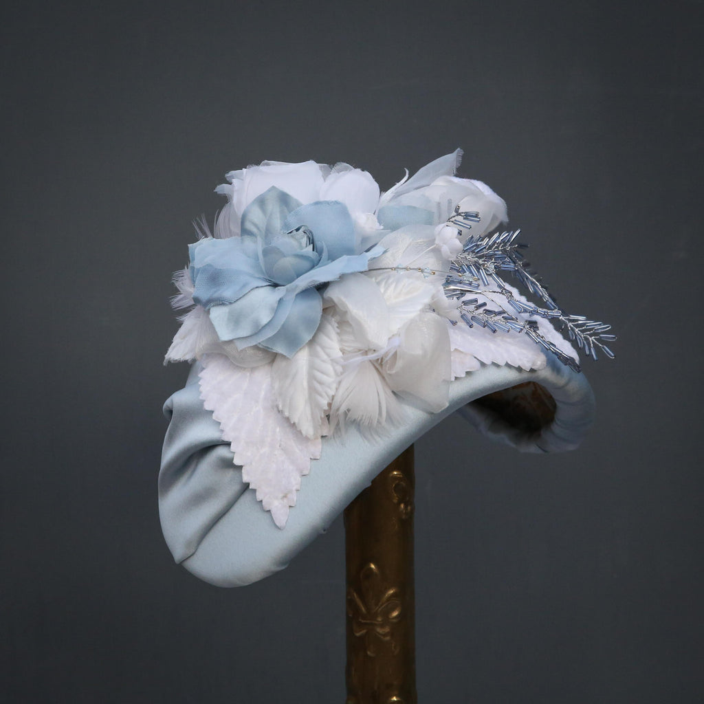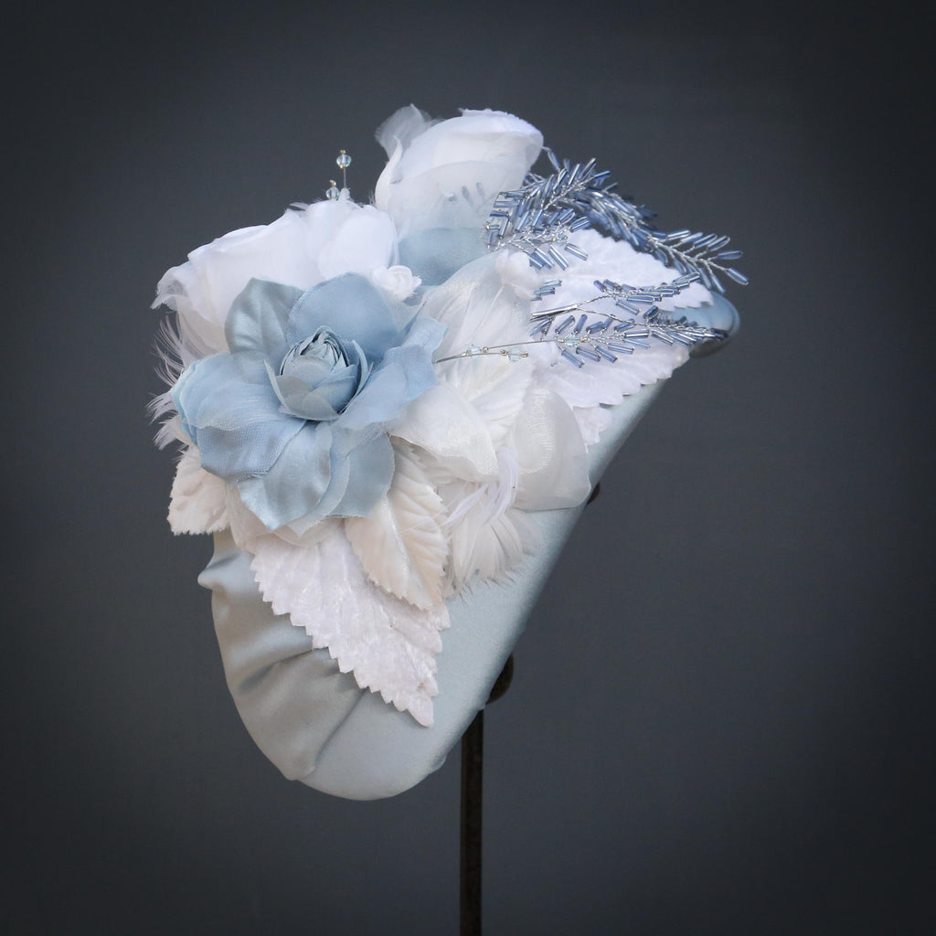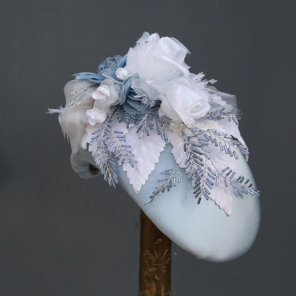 A blue silk headband, with handmade flowers made in the same silk, and other organzas, with white chiffon flowers, white velvet leaves, ivory feathered flowers and blue and silver beaded leaves.