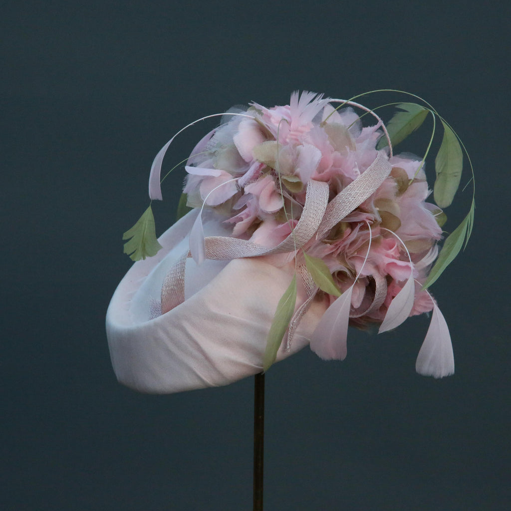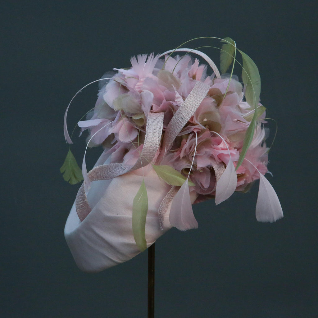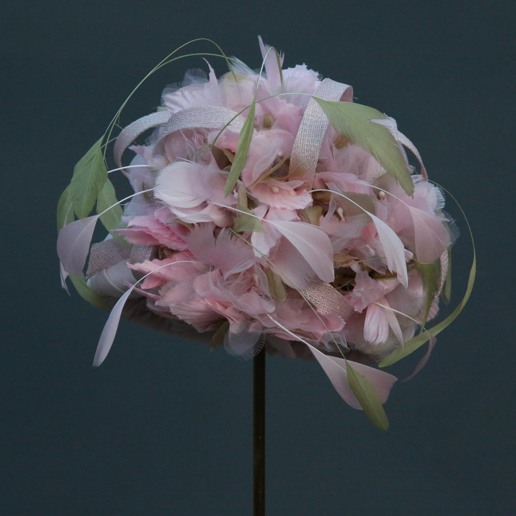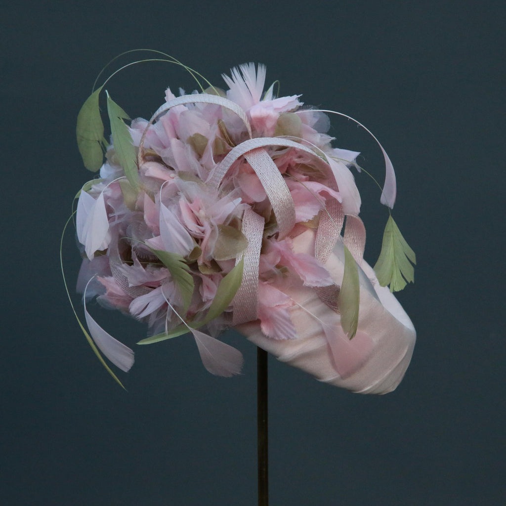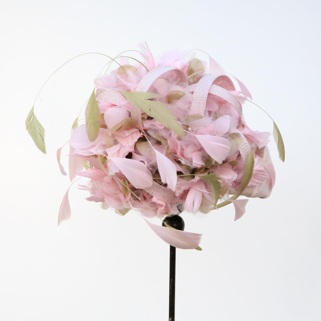 Pale pink silk chiffon over silk, with pale pink and green silk organza hydrangea flowers, with sinnamay swirls and green and pink hand dyed stripped goose feathers.