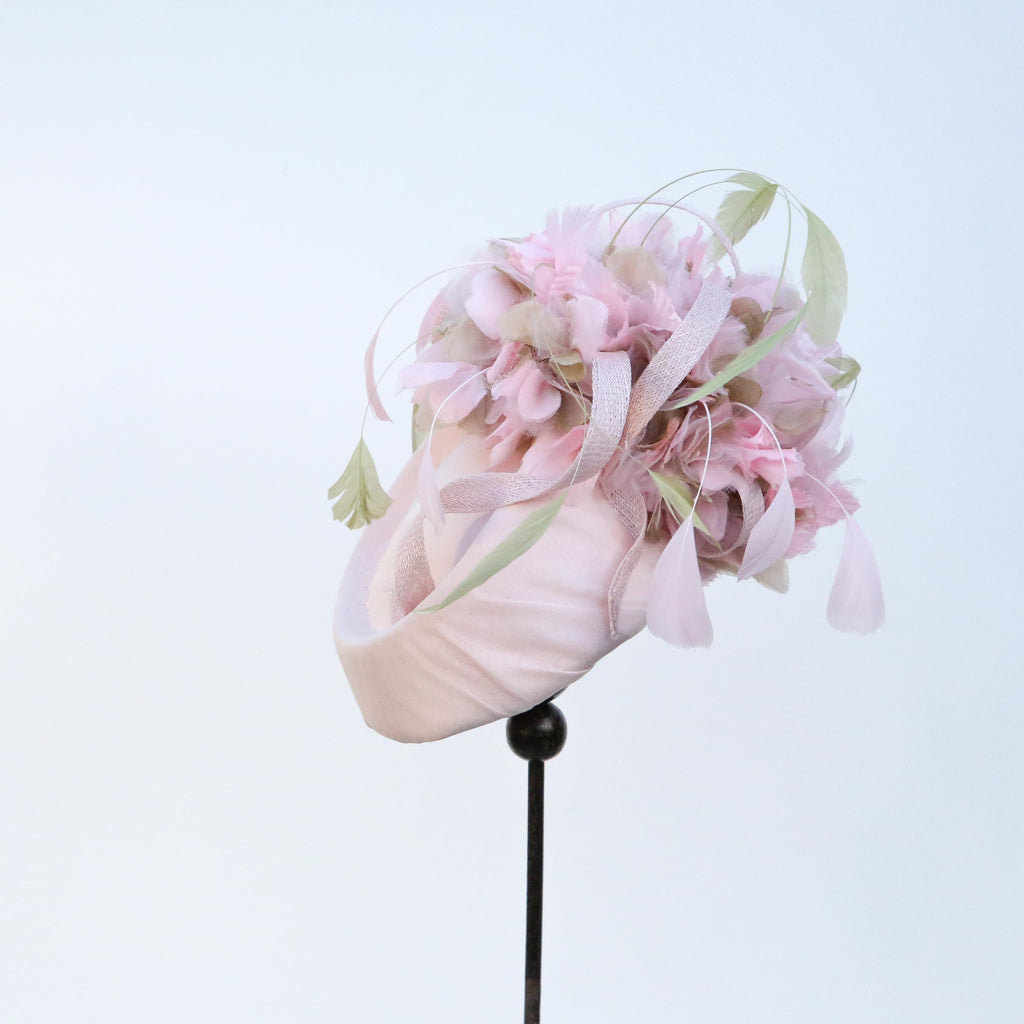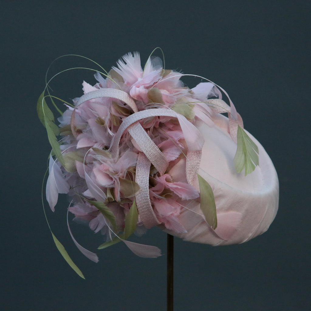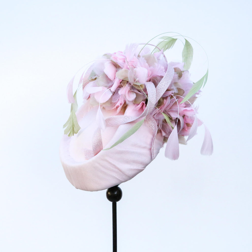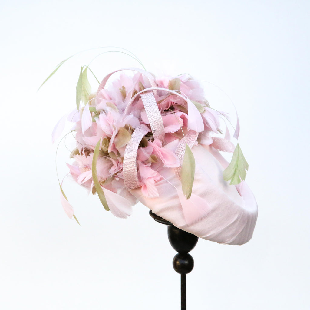 Pale pink silk chiffon over silk, with pale pink and green silk organza hydrangea flowers, with sinnamay swirls and green and pink hand dyed stripped goose feathers.