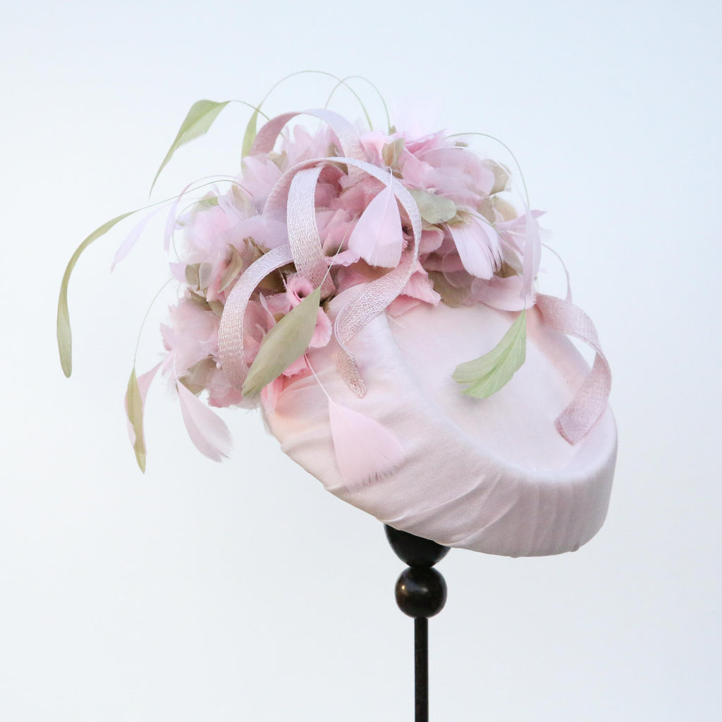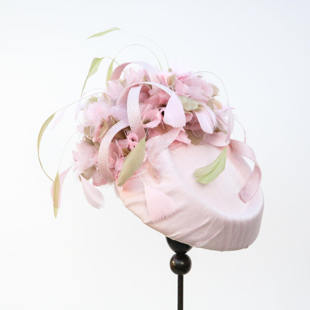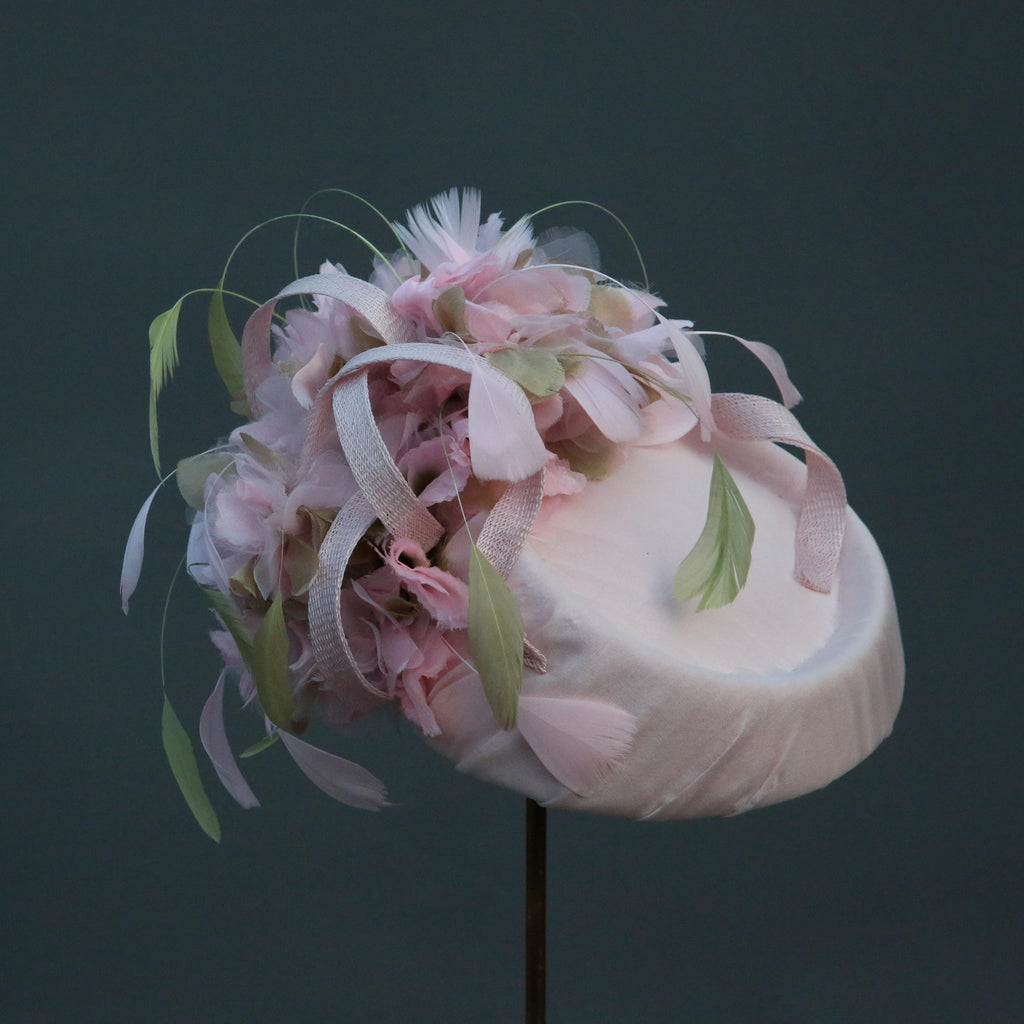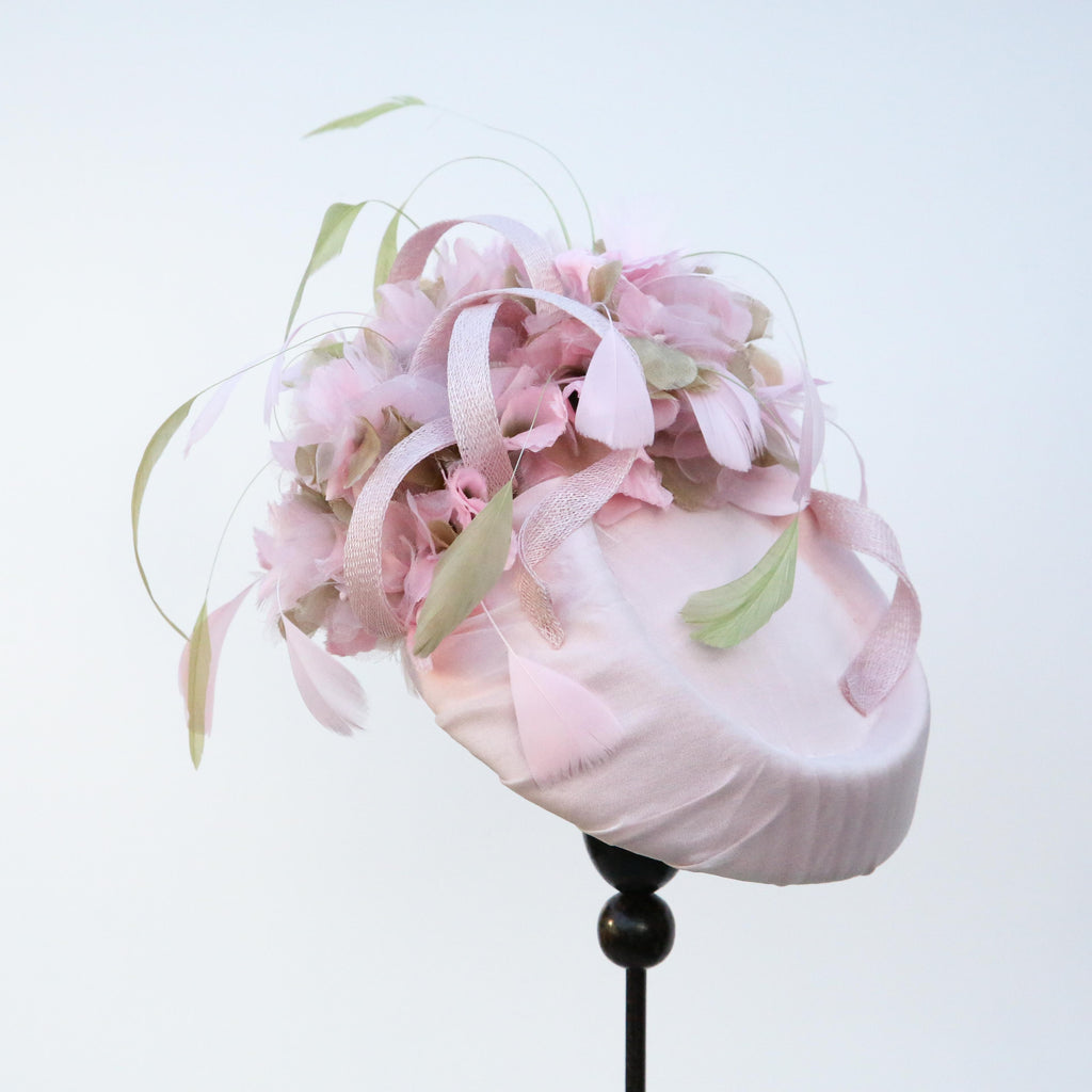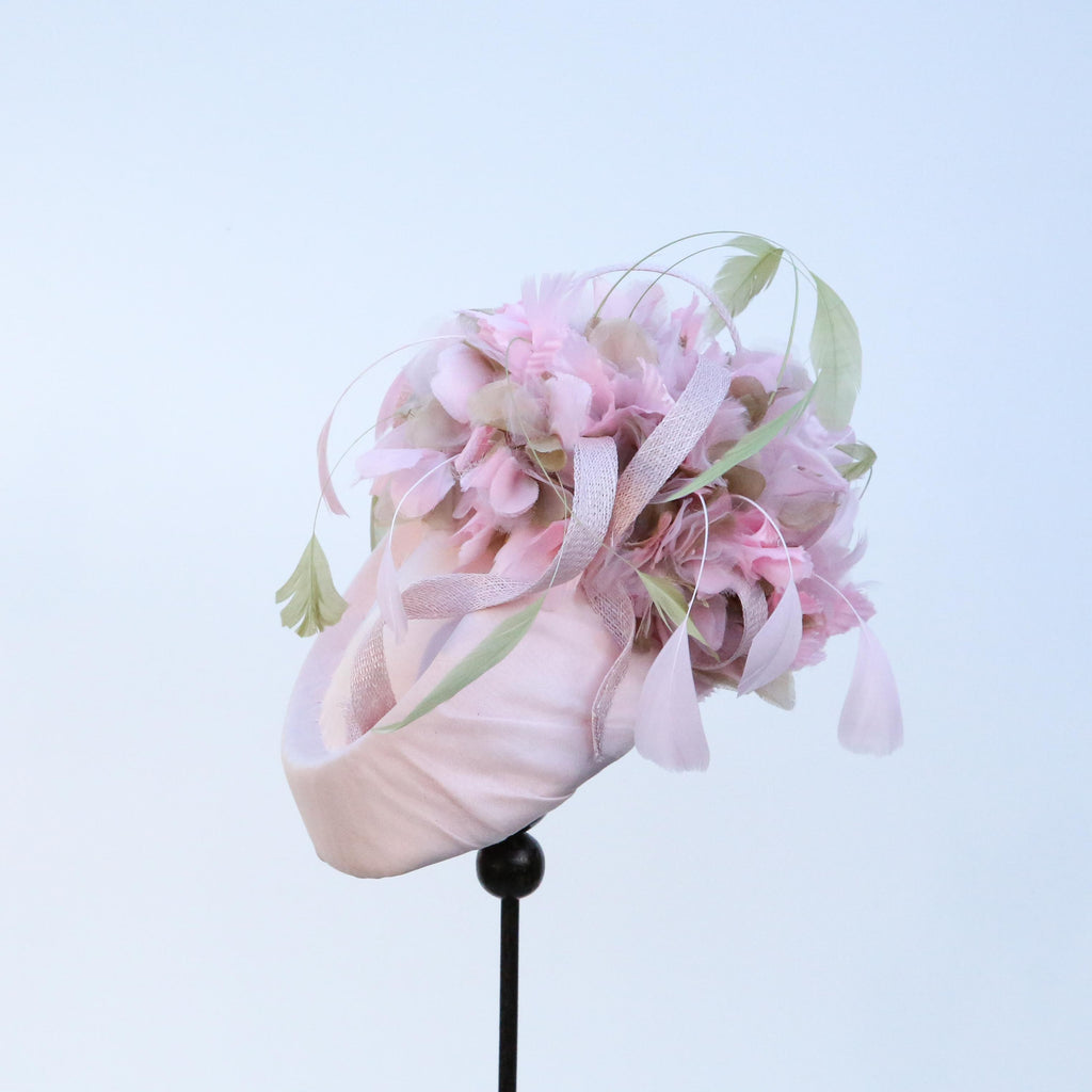 Pale pink silk chiffon over silk, with pale pink and green silk organza hydrangea flowers, with sinnamay swirls and green and pink hand dyed stripped goose feathers.