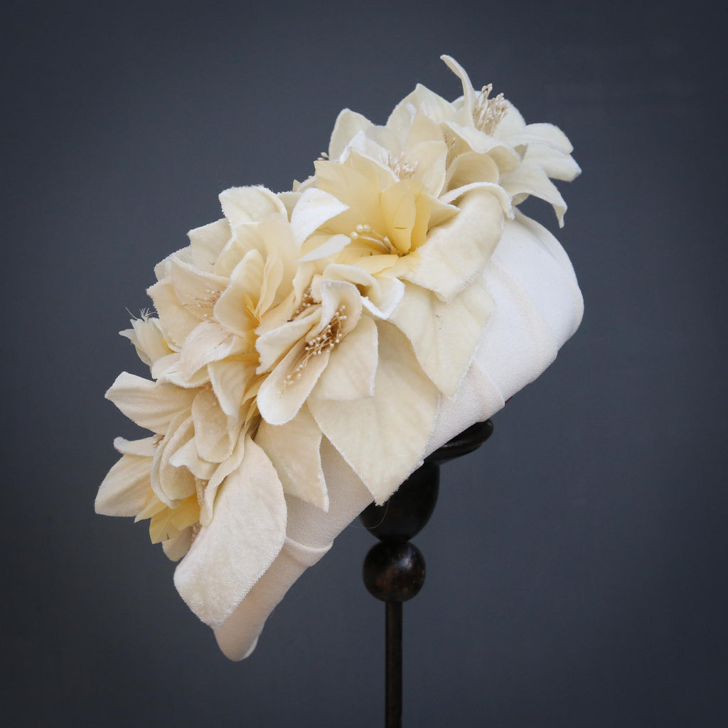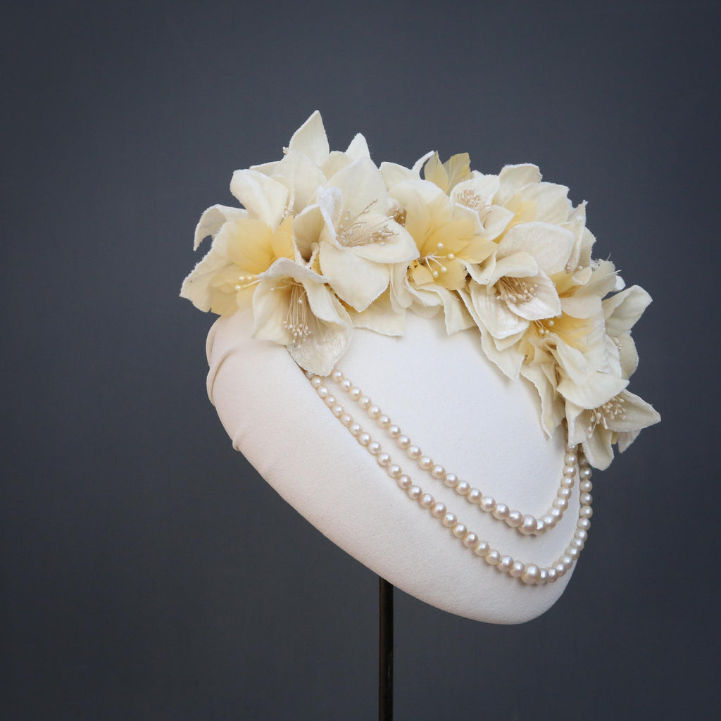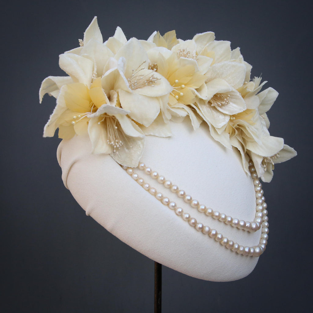 An ivory crepe ridged hat, with cream velvet flowers and soft butter yellow feathered hydrangeas, and two strands of graduated pearls sewn to echo the shape of the hat.