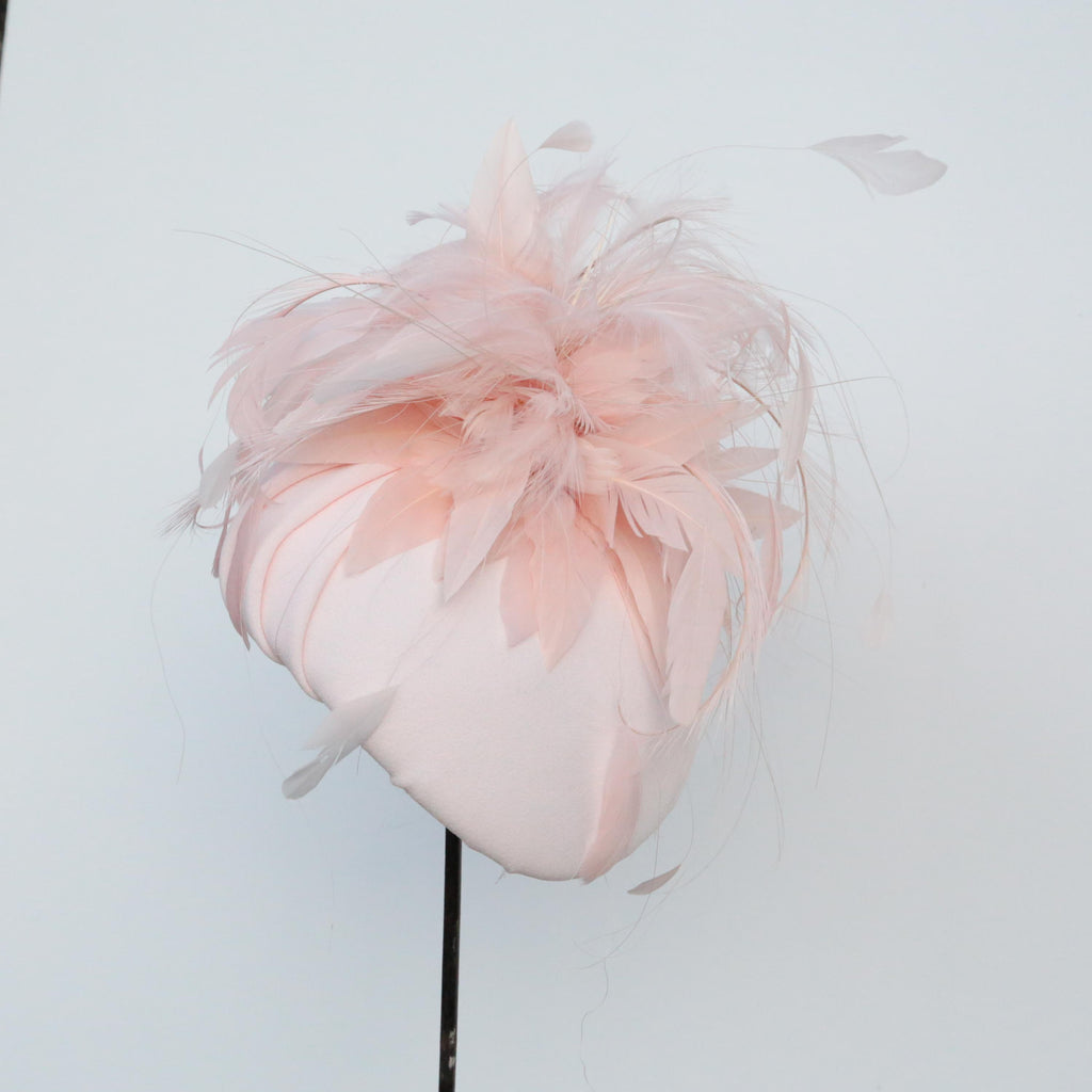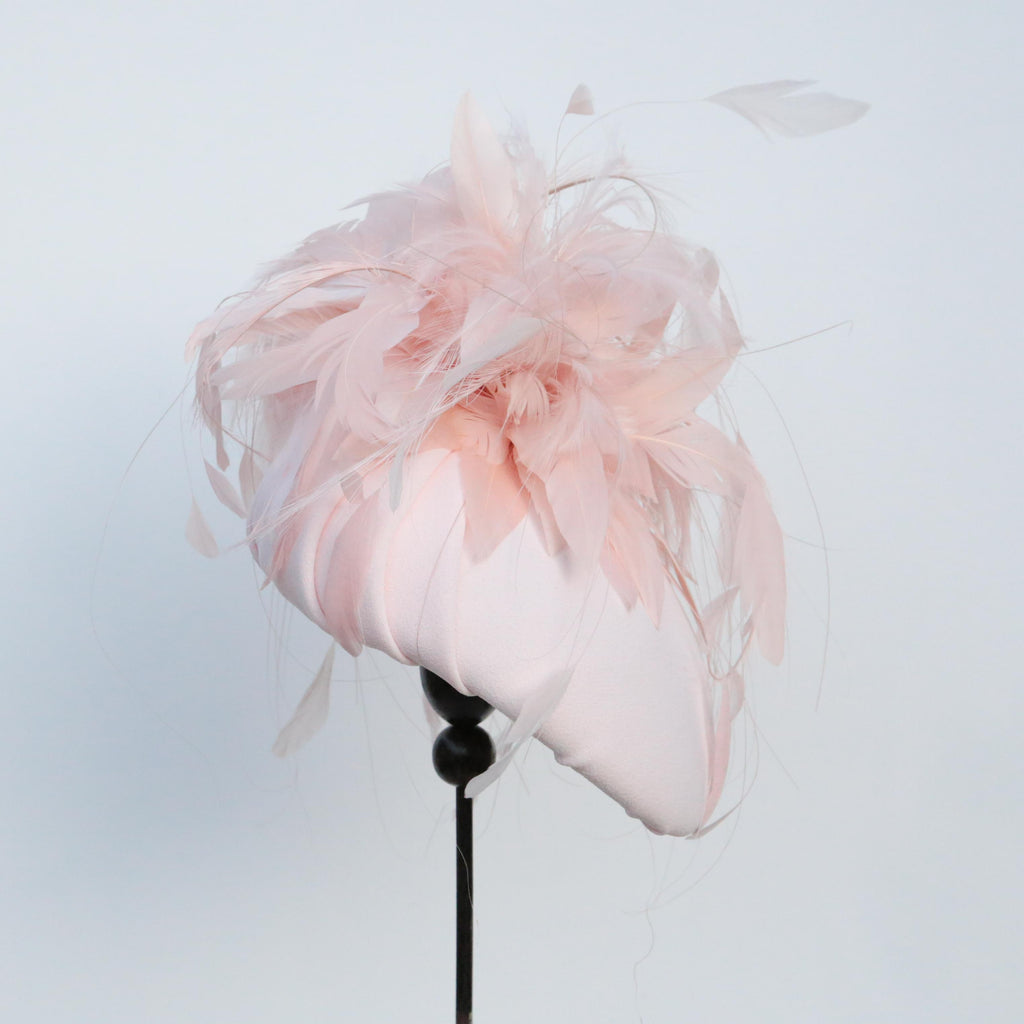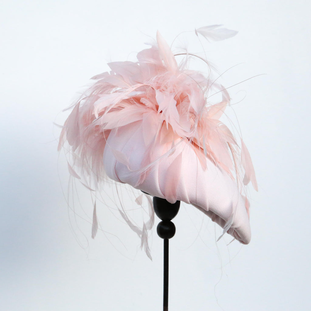 A peach crepe hat, with pleated bow at the top, with a plume of trimmed goose, burnt pheasant and stripped coq feathers.