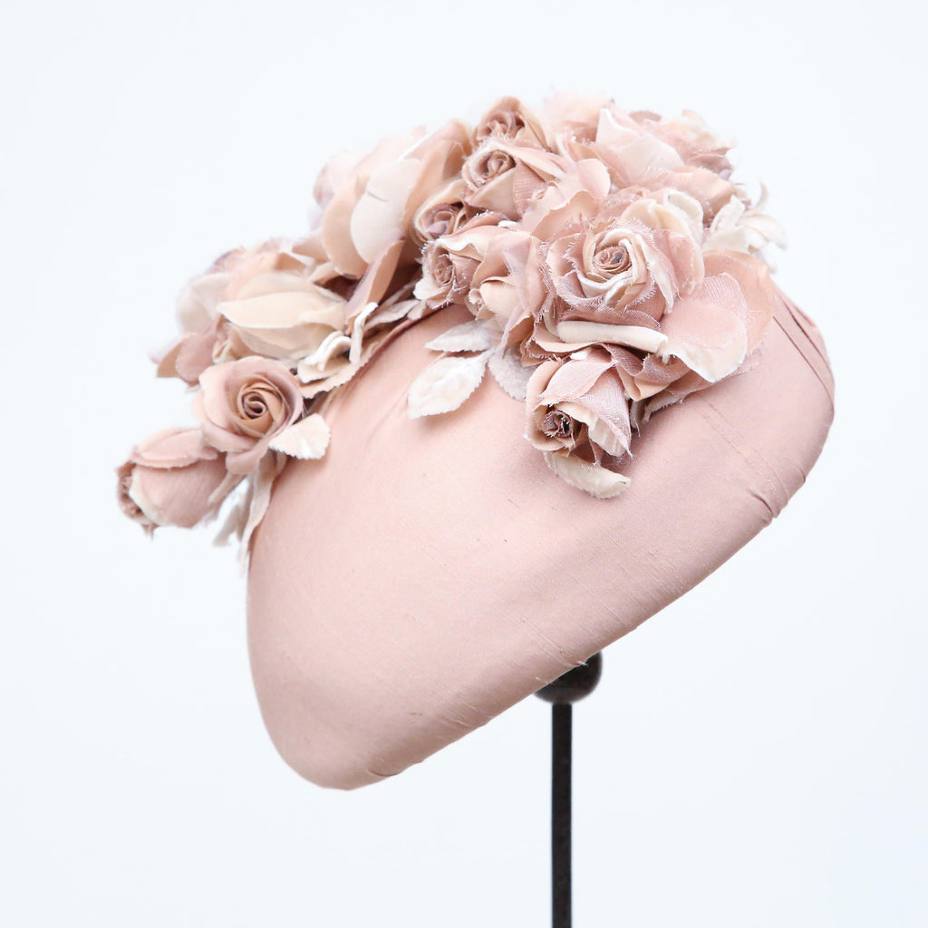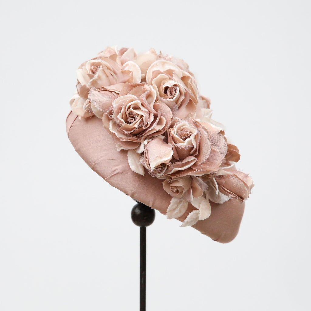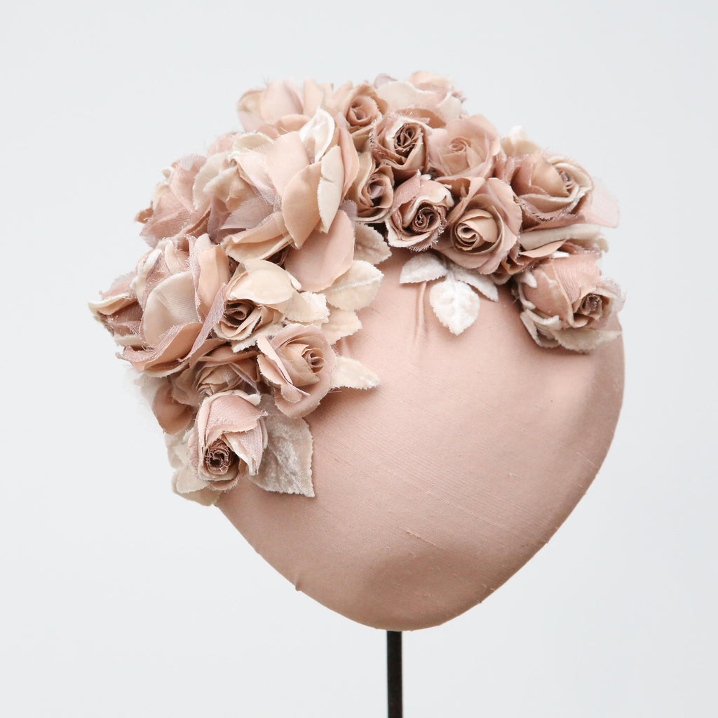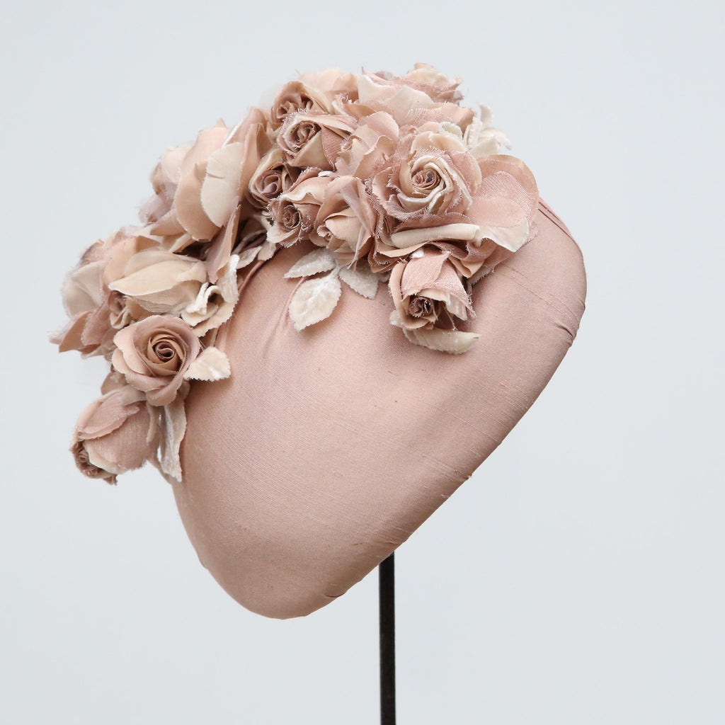 A nude-pink pure silk little ridged side hat, with handmade flowers in the same silk as the hat, blush silk velvet, nude and copper organzas, and blush velvet leaves.