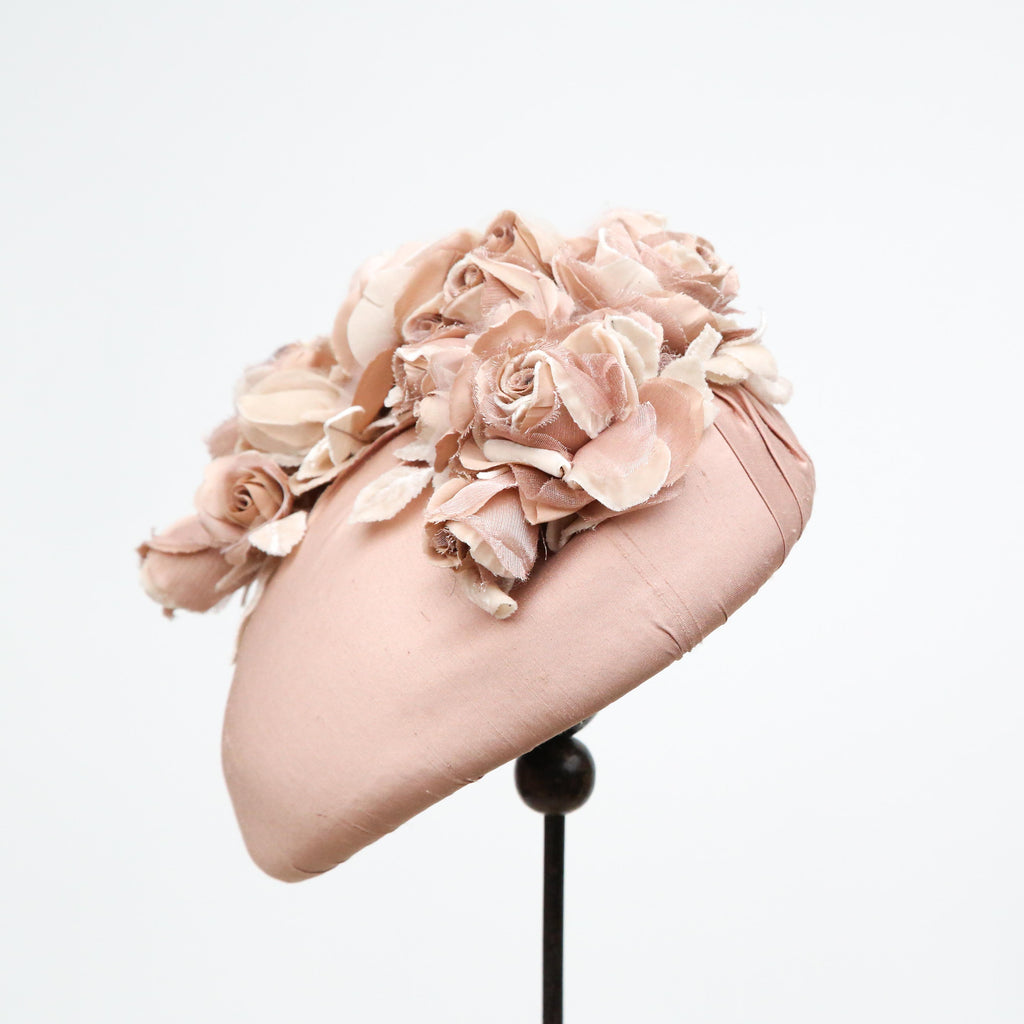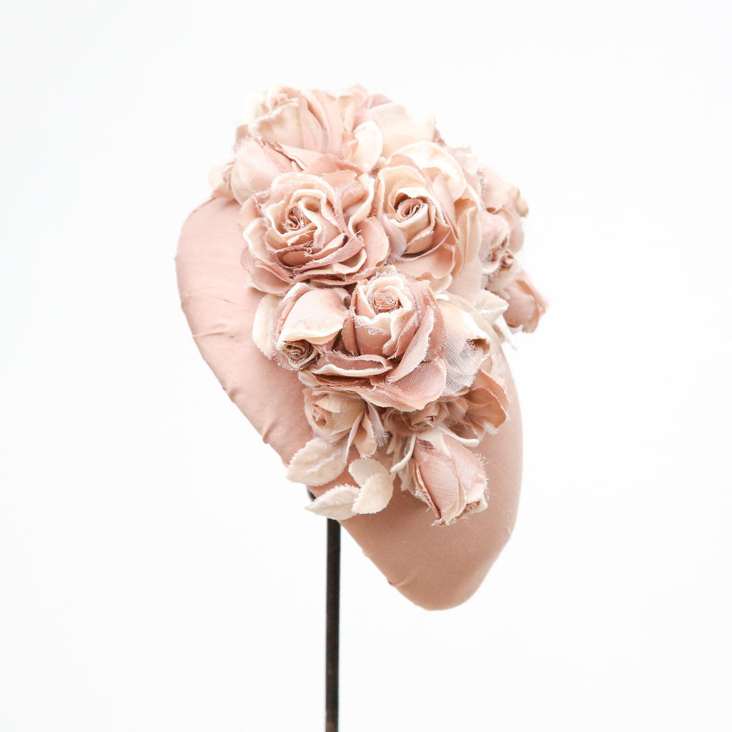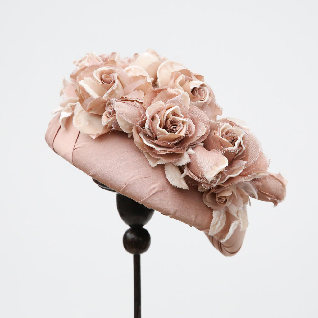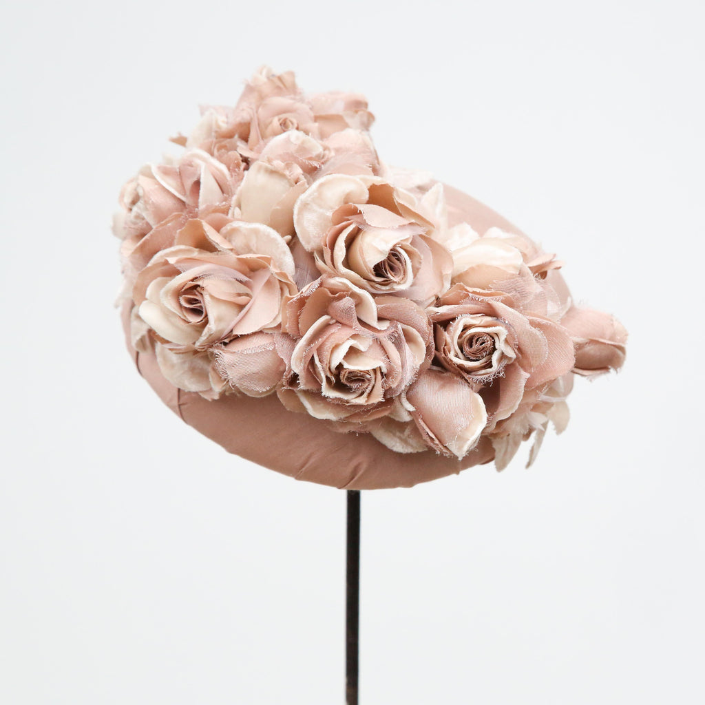 A nude-pink pure silk little ridged side hat, with handmade flowers in the same silk as the hat, blush silk velvet, nude and copper organzas, and blush velvet leaves.