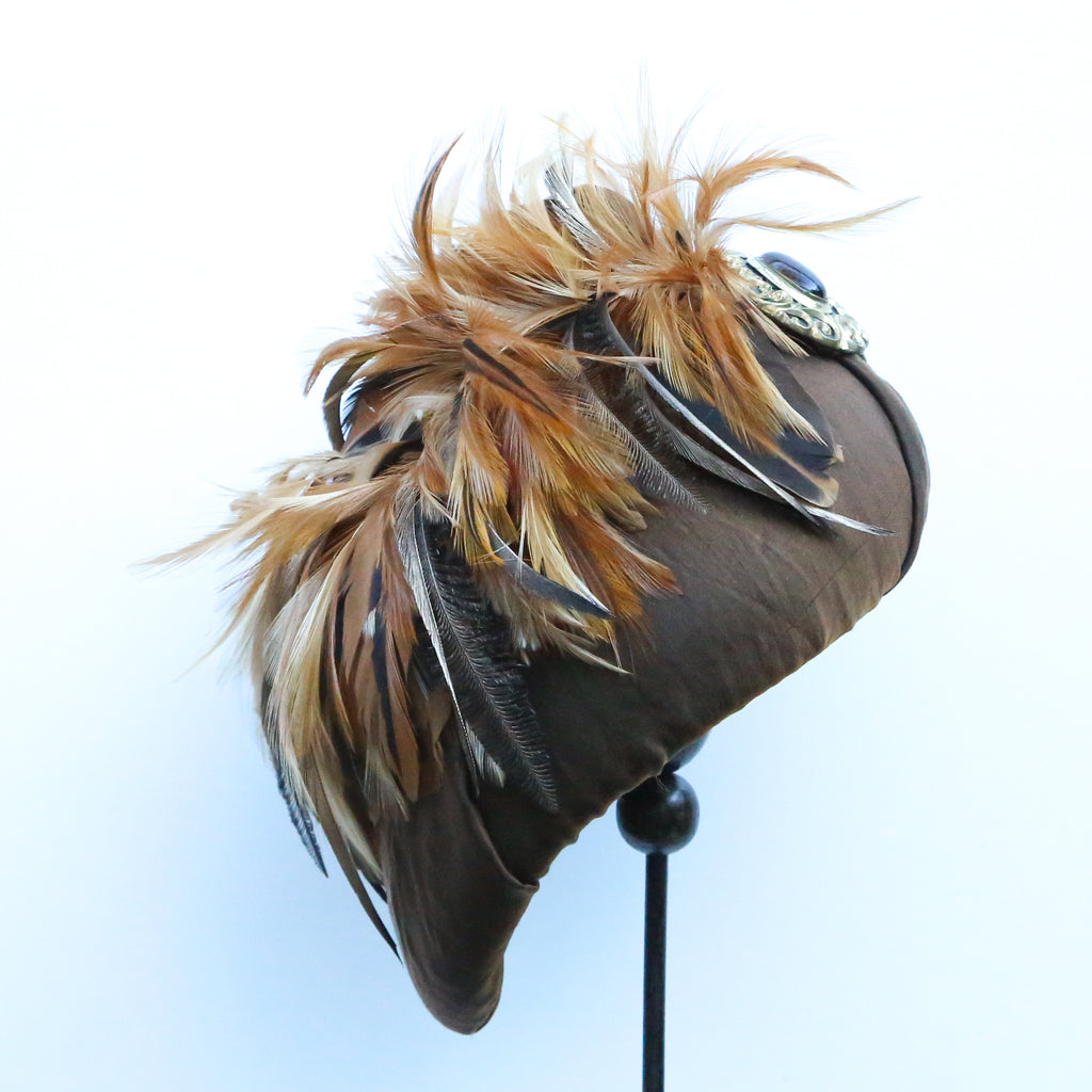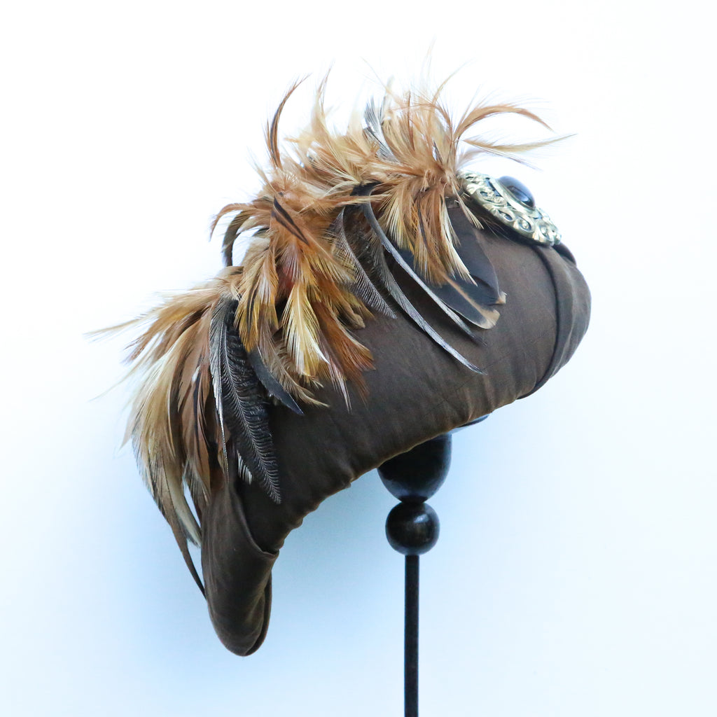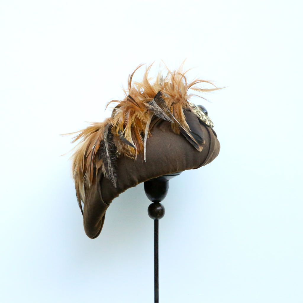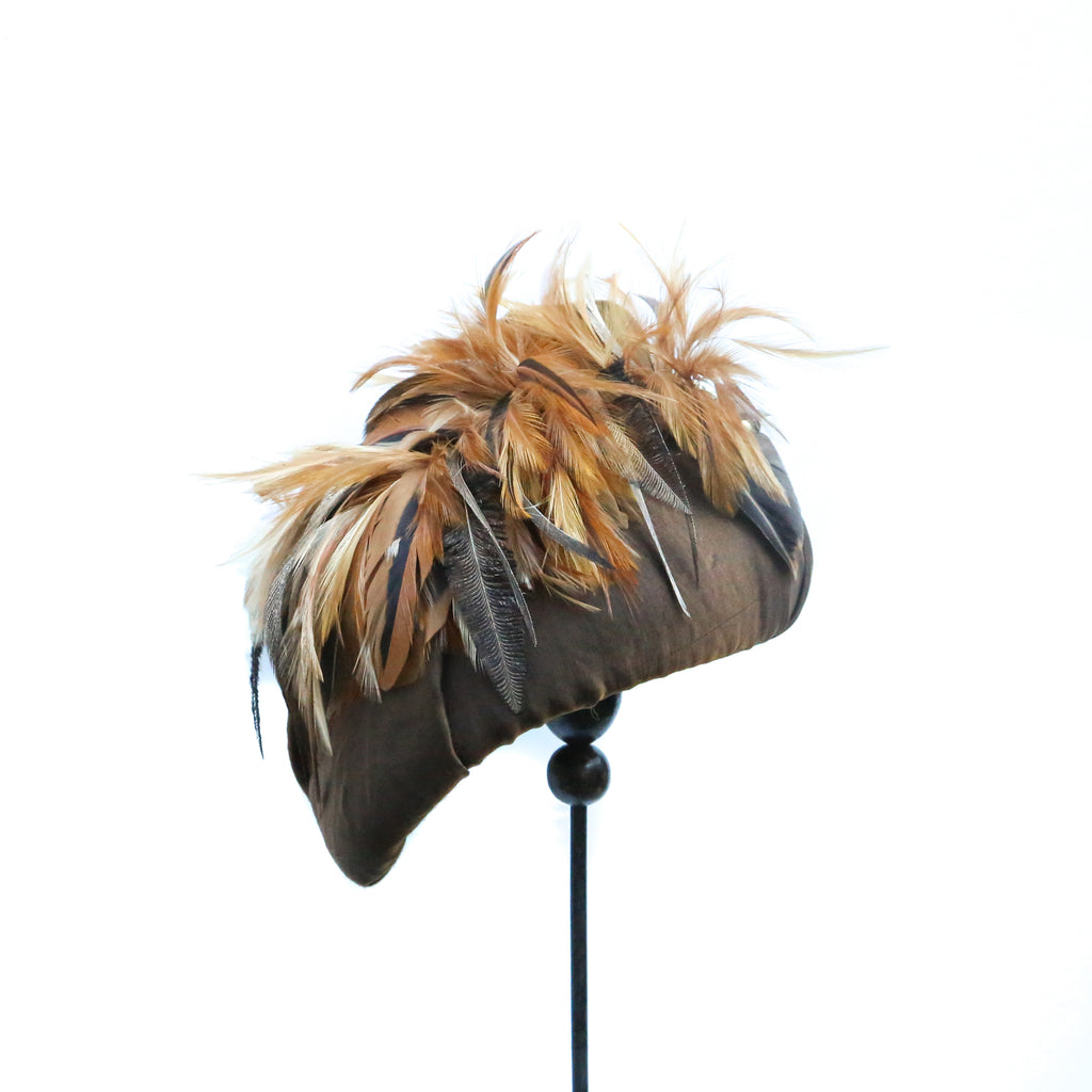 A metallic rust/black silk side hat with plume pop orange toned hackle feathers, guilded goose biot, gilded diamond trimmed ostrich feathers, and black chicken feathers, finished with a pleat and a vintage brooch.