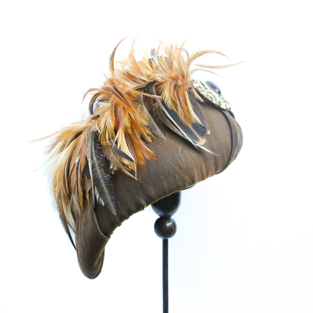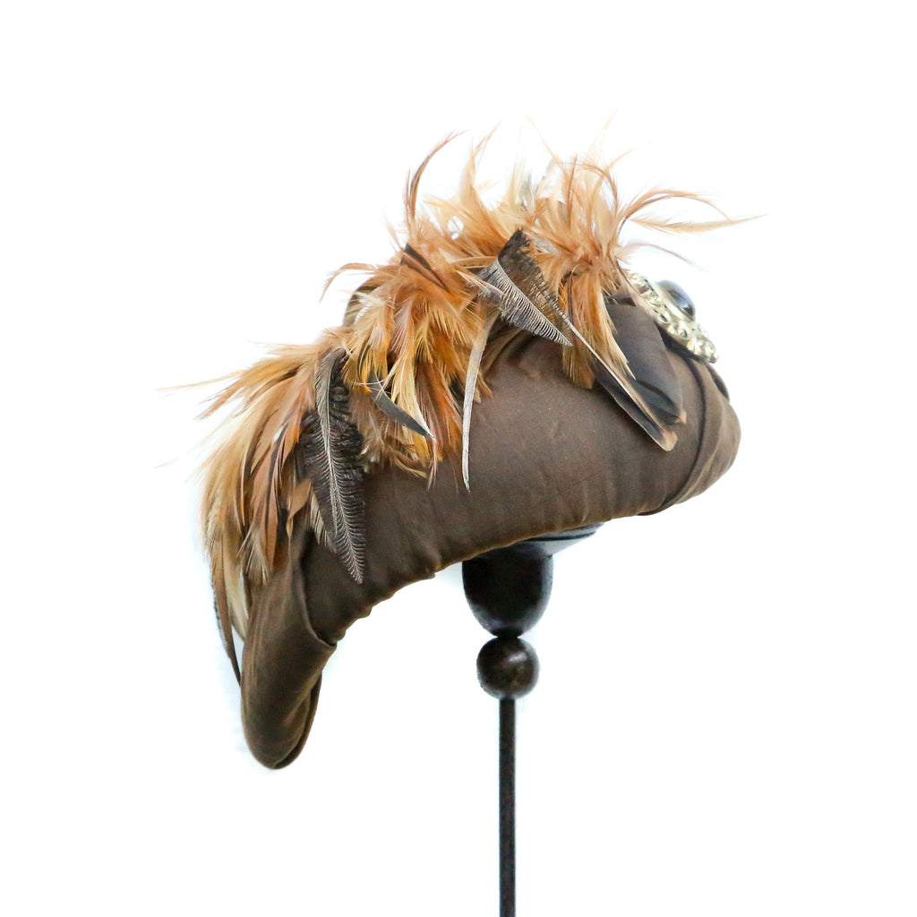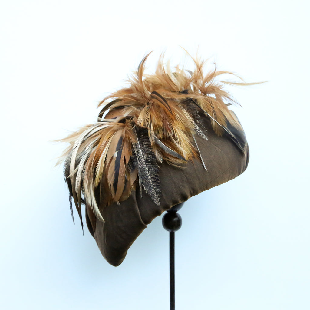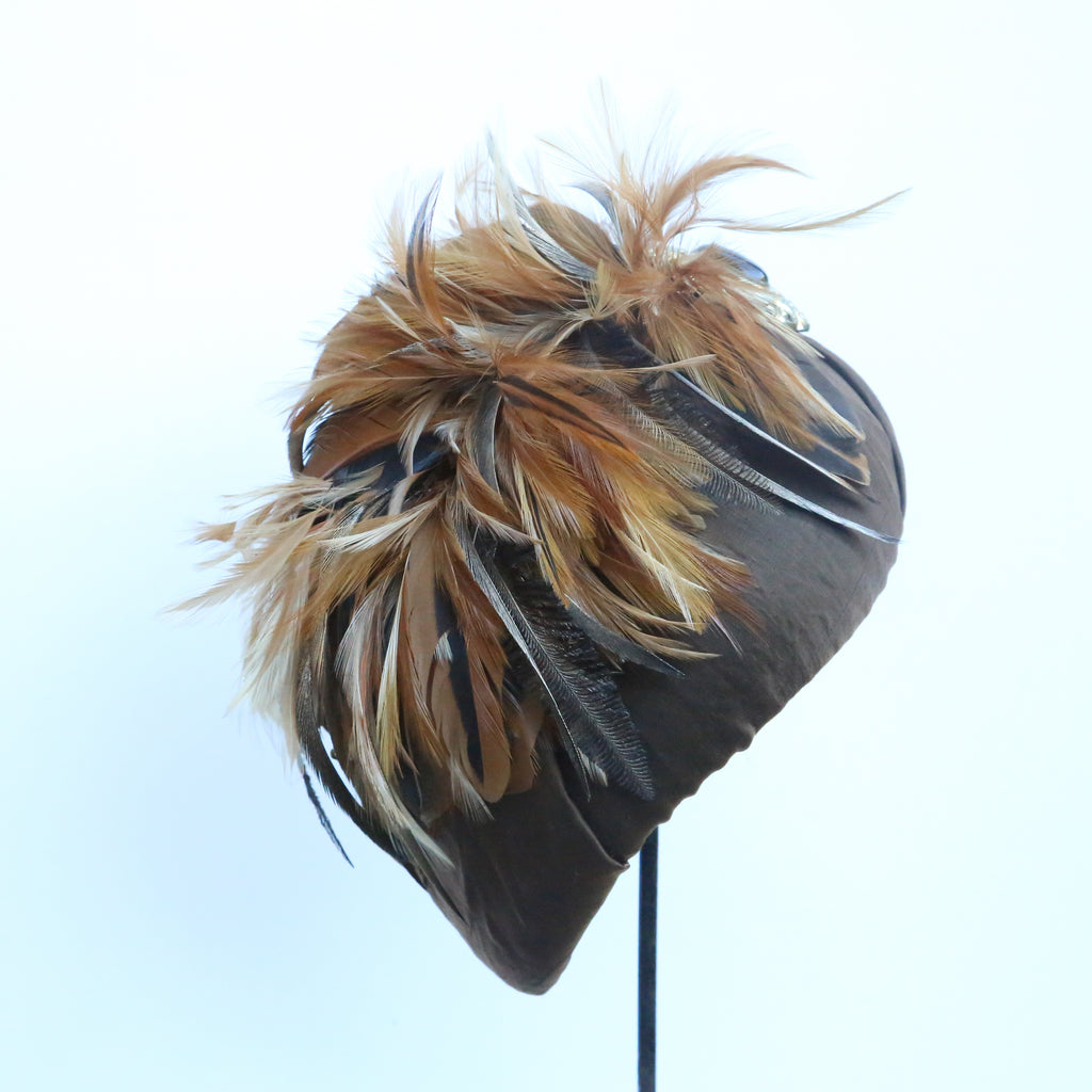 A metallic rust/black silk side hat with plume pop orange toned hackle feathers, guilded goose biot, gilded diamond trimmed ostrich feathers, and black chicken feathers, finished with a pleat and a vintage brooch.