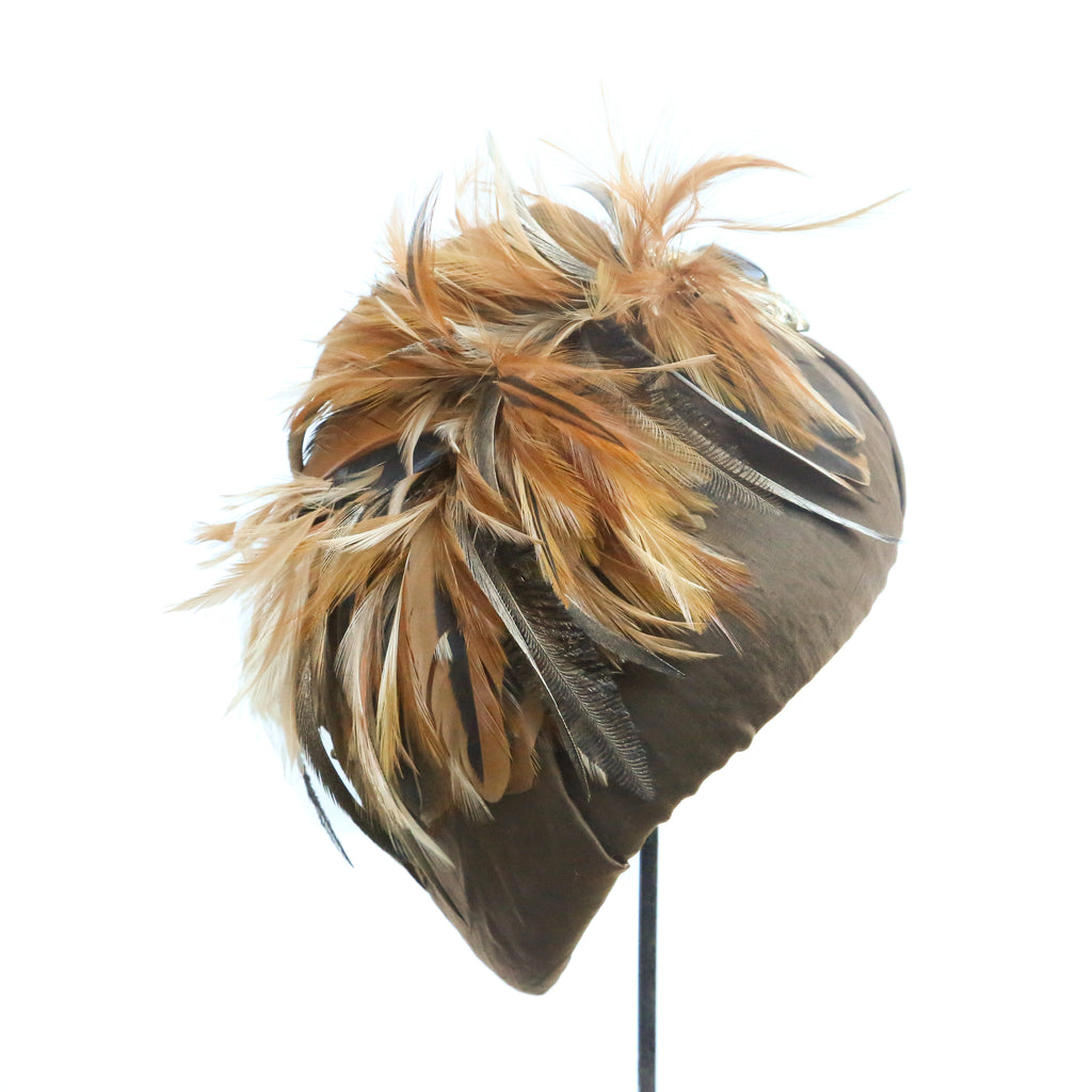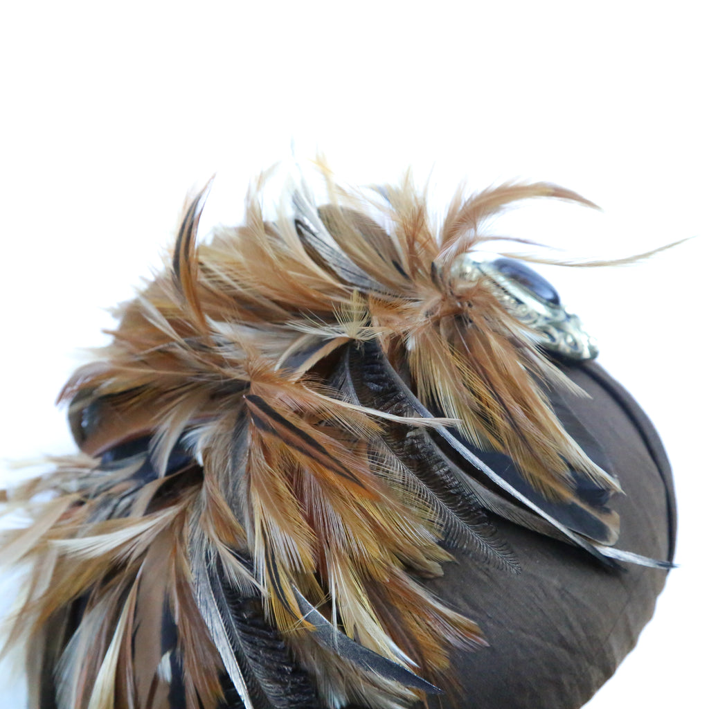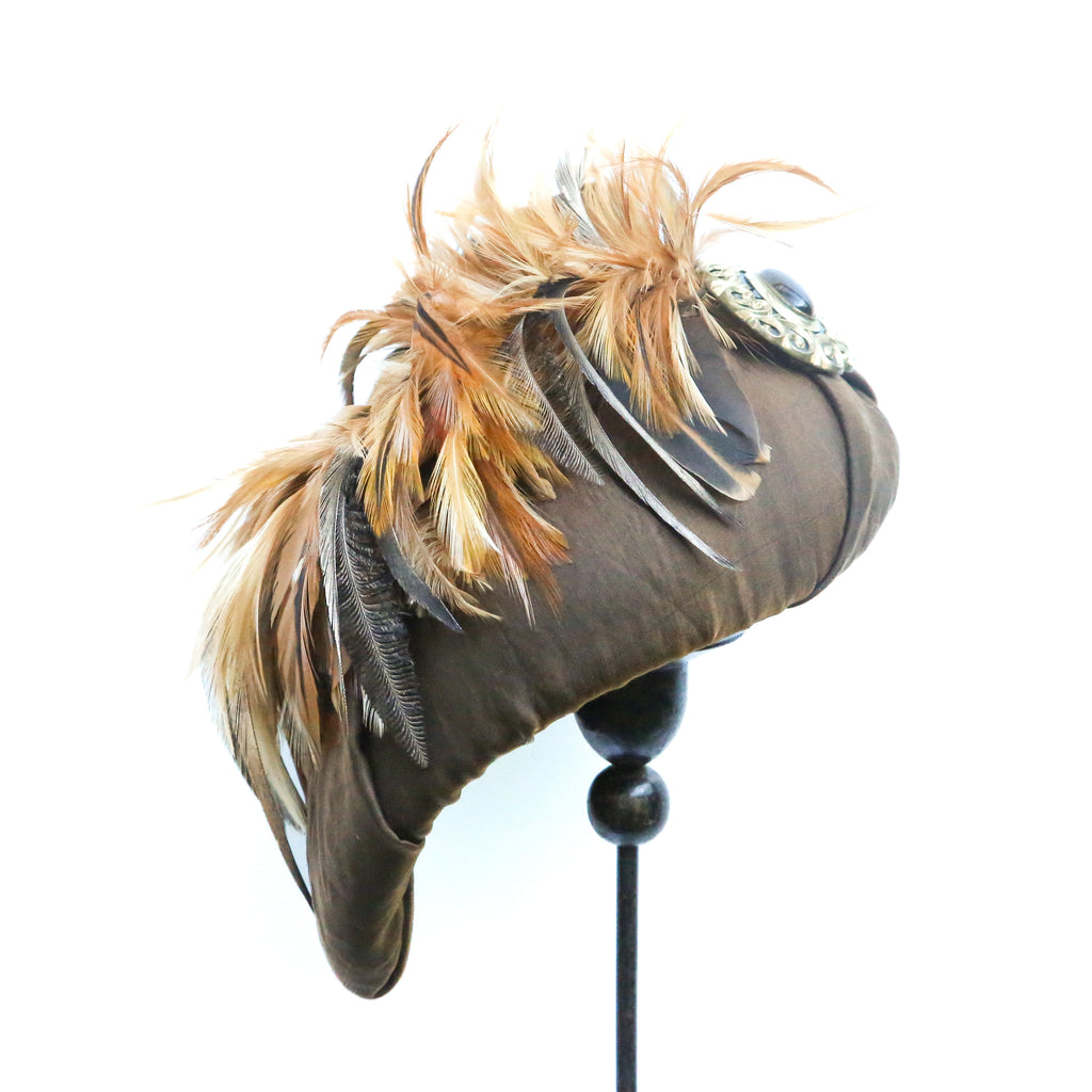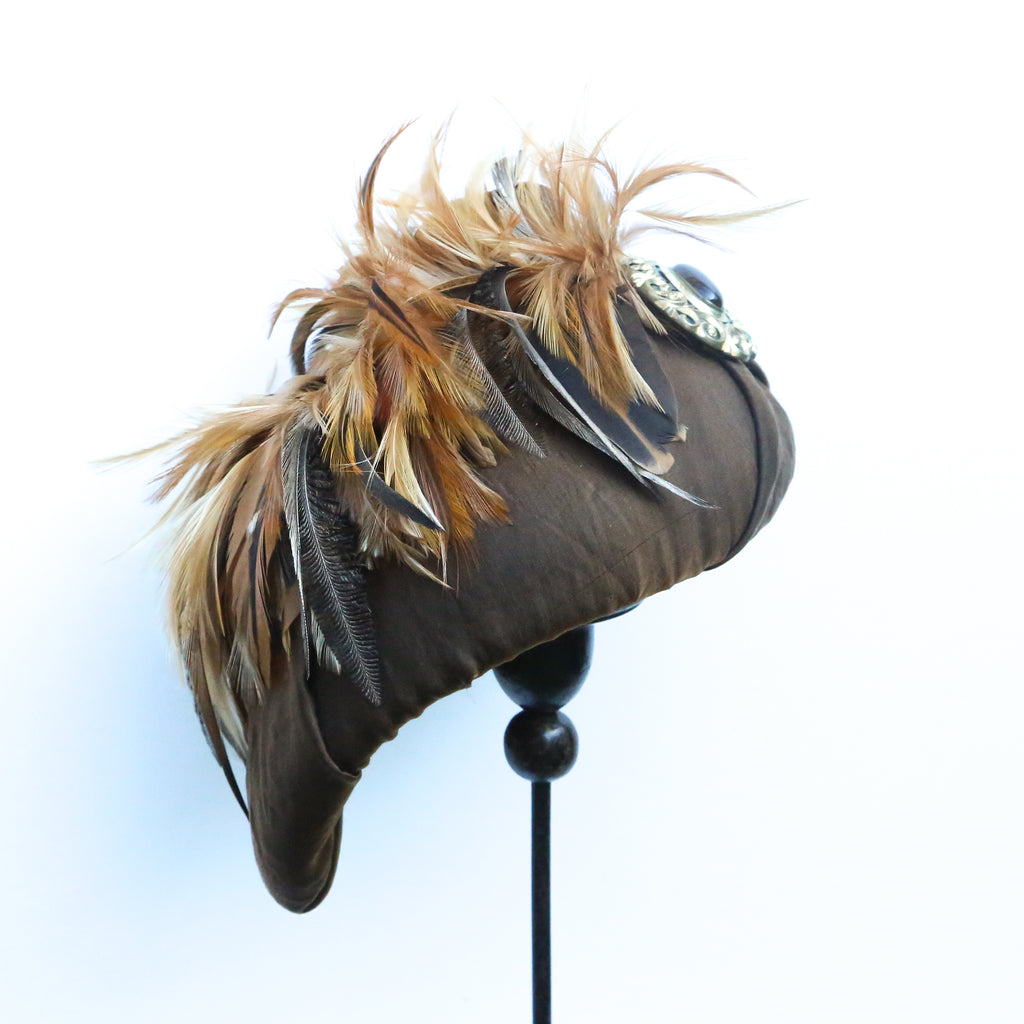A metallic rust/black silk side hat with plume pop orange toned hackle feathers, guilded goose biot, gilded diamond trimmed ostrich feathers, and black chicken feathers, finished with a pleat and a vintage brooch.