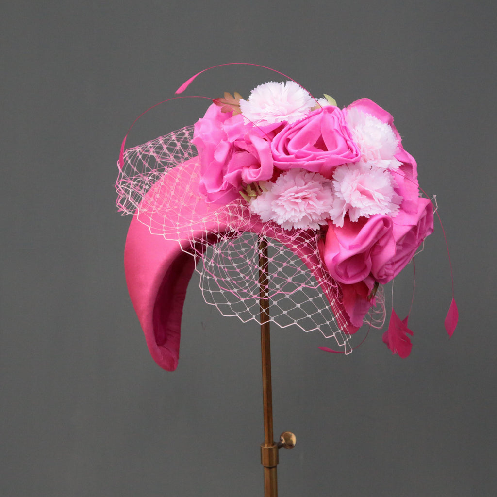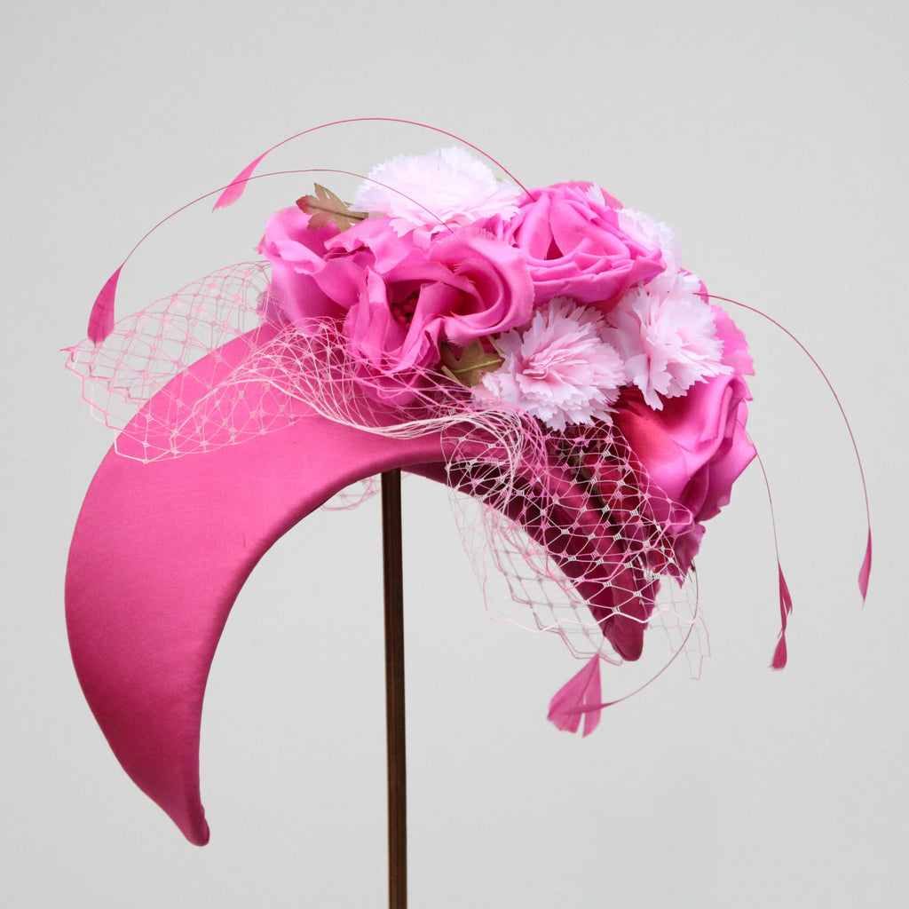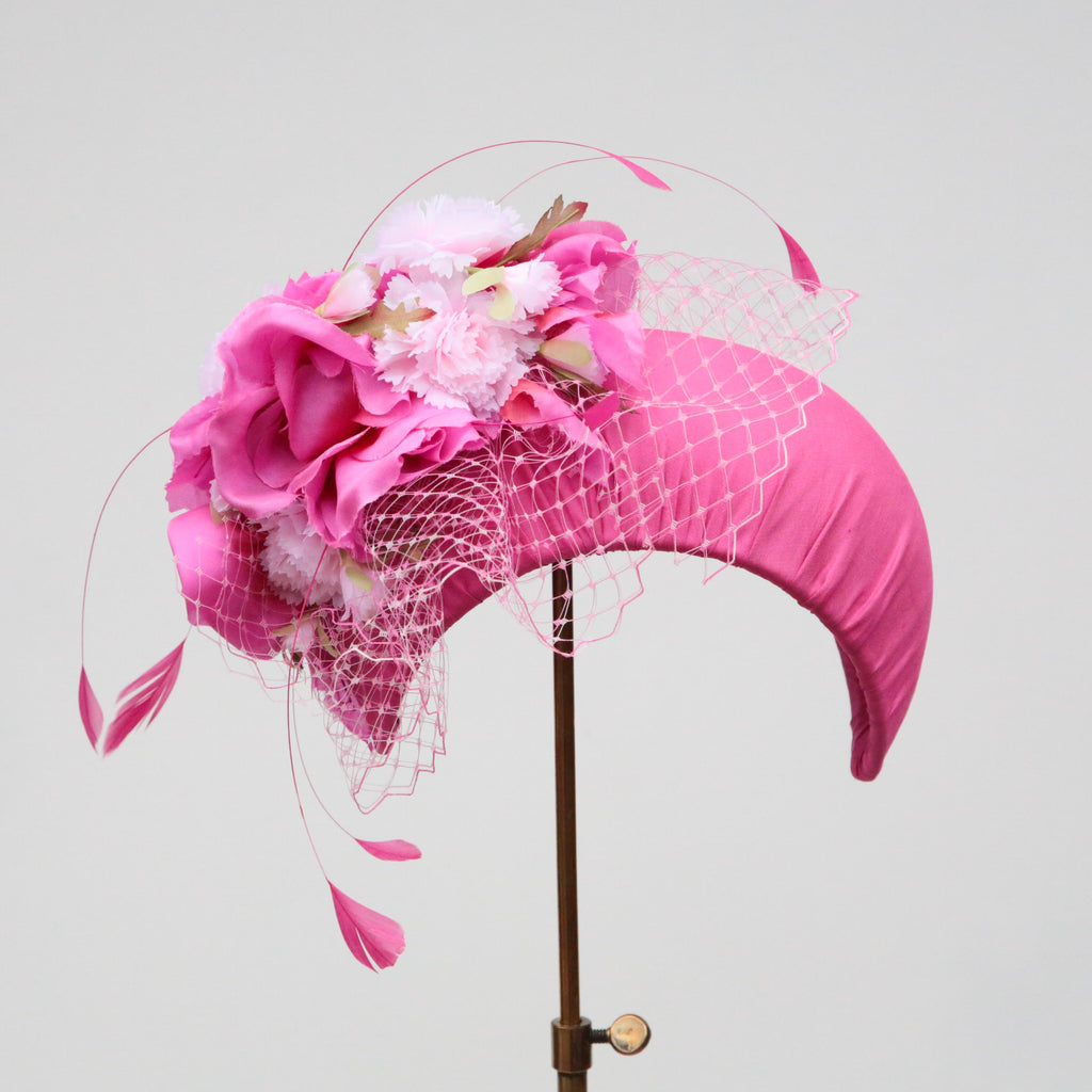 A bright pink silk high moon headband, softly gathered at the back, with a flower of pale and bright pink veiling, a mix of bright pink roses and pale pink silk chrysanthemums and bright pink stripped goose feathers.