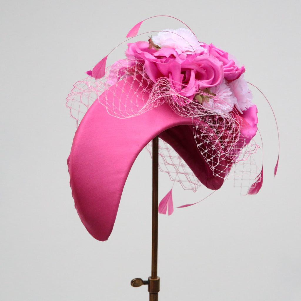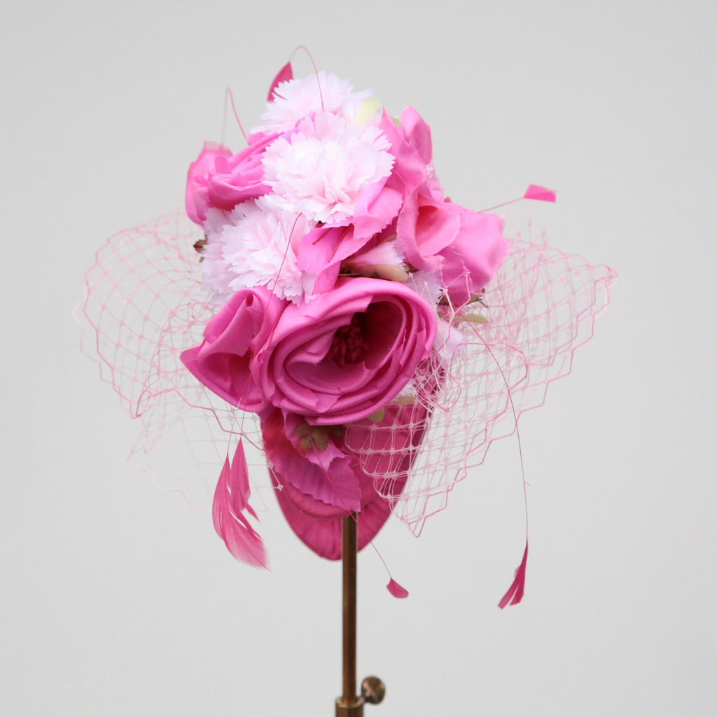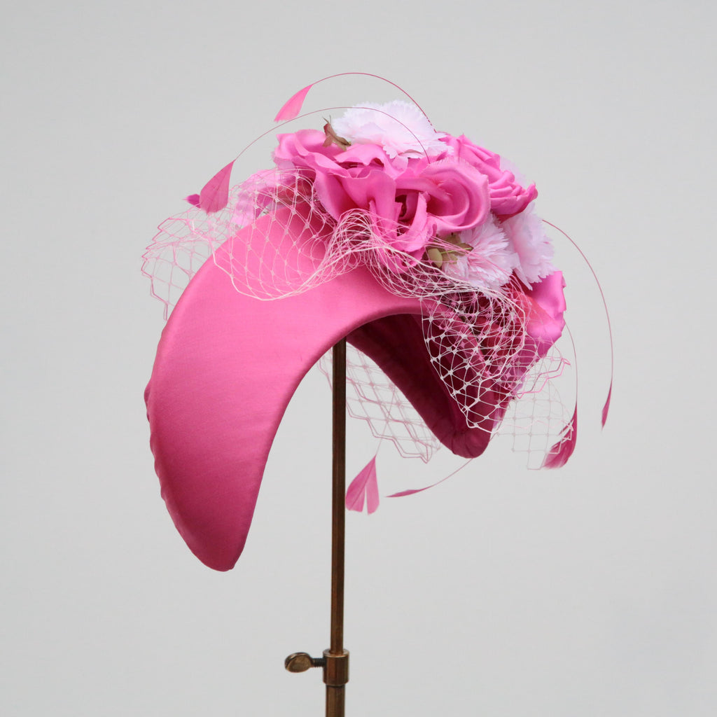 A bright pink silk high moon headband, softly gathered at the back, with a flower of pale and bright pink veiling, a mix of bright pink roses and pale pink silk chrysanthemums and bright pink stripped goose feathers.