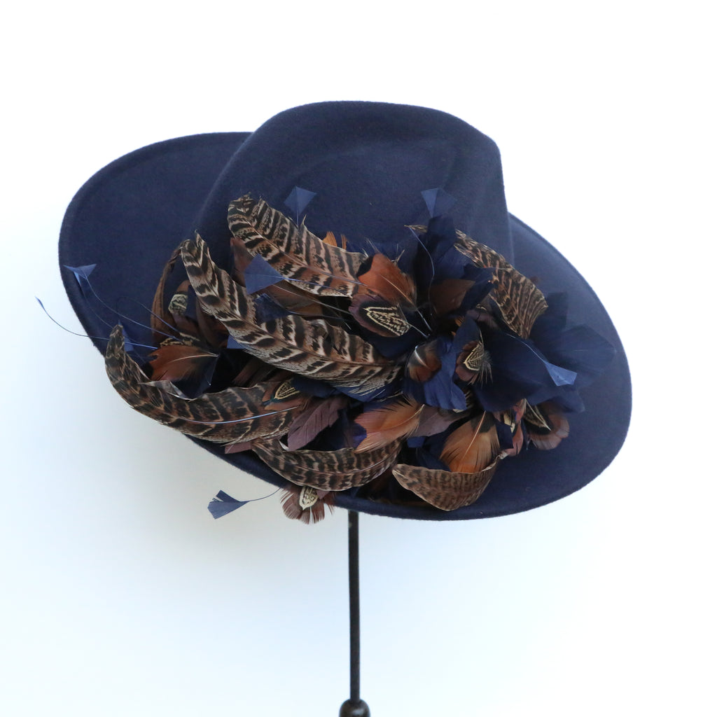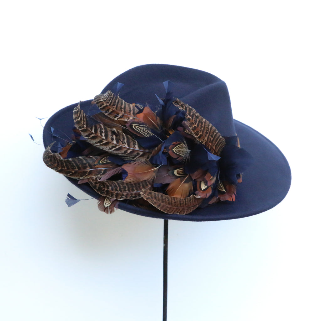 A navy 100% pure British wool trilby with a brown velvet band, and a plume of navy and brown diamond trimmed goose feathers, and pheasant breast and wing feathers.