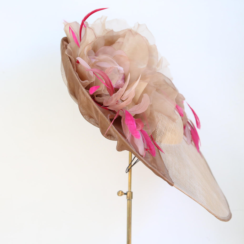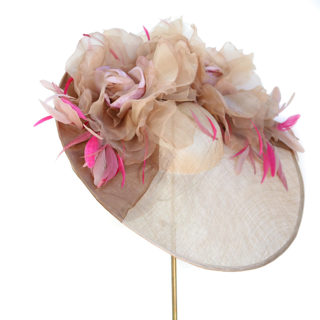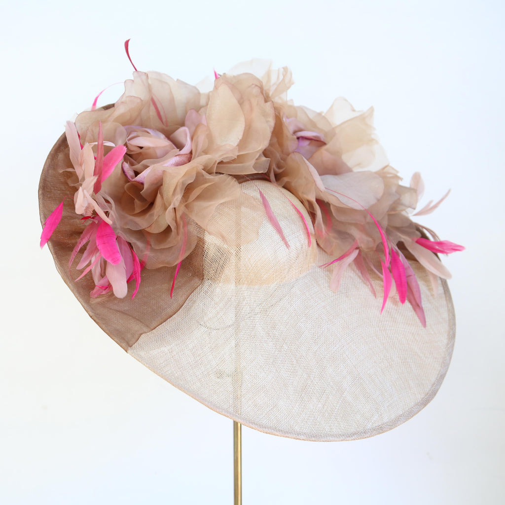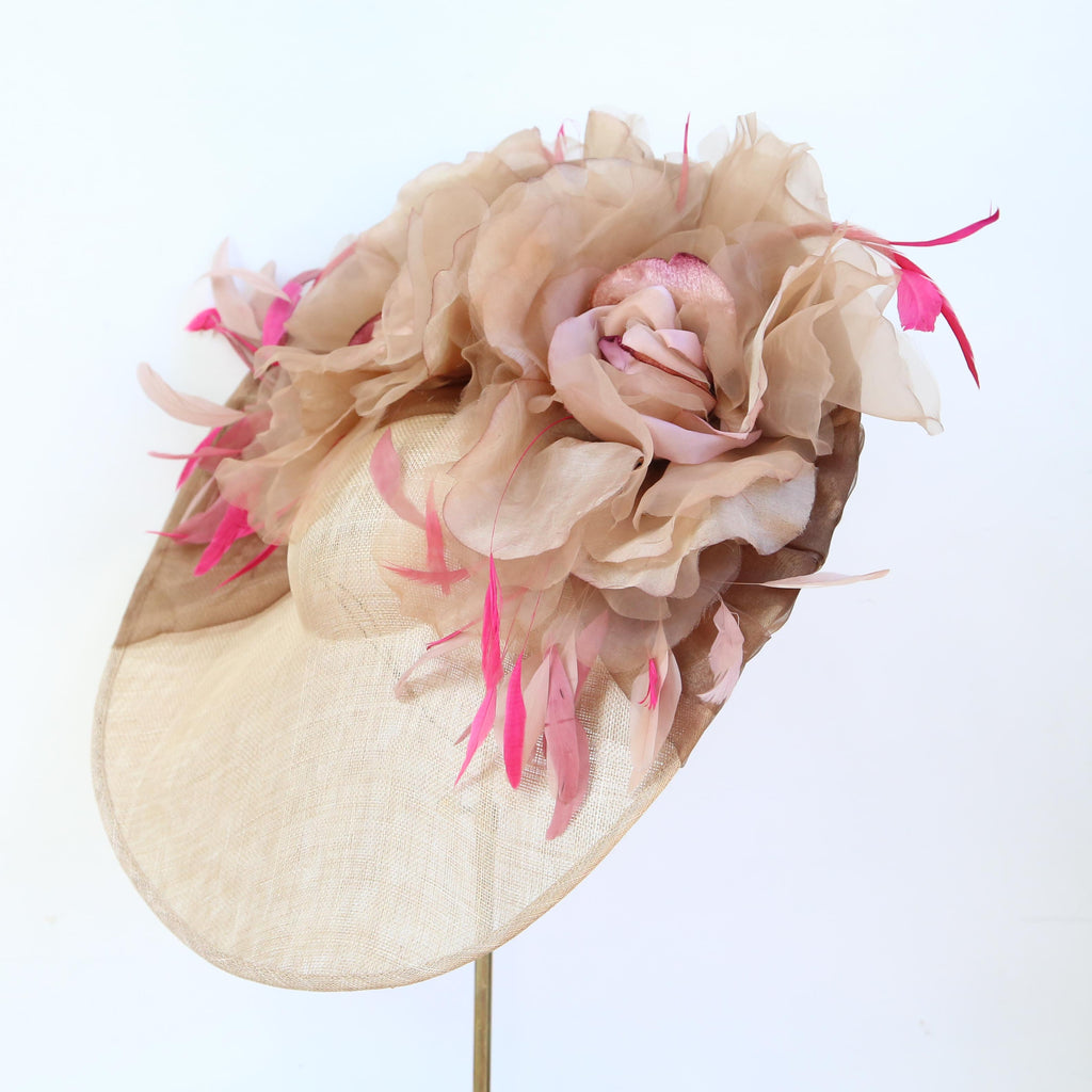 A gold large sinnamay saucer, with bronze silk organza, and two large velvet and organza autumn toned roses, and pink and fuchsia stripped coque and goose biot feathers.