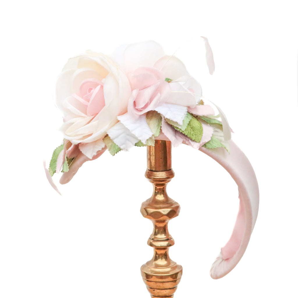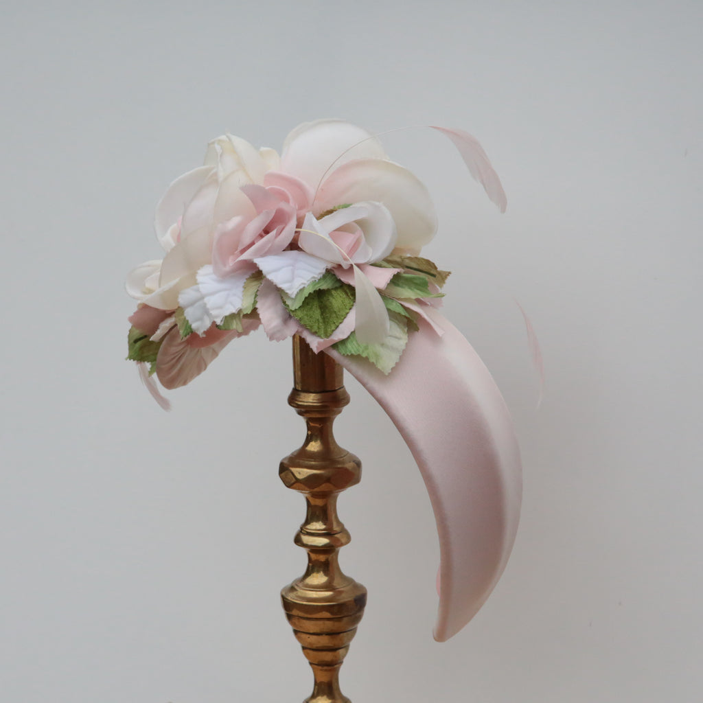 A pale pink silk chiffon headband, with vintage silk roses, velvet leaves and pale pink stripped coque feathers. Lined in pink silk wired ribbon.