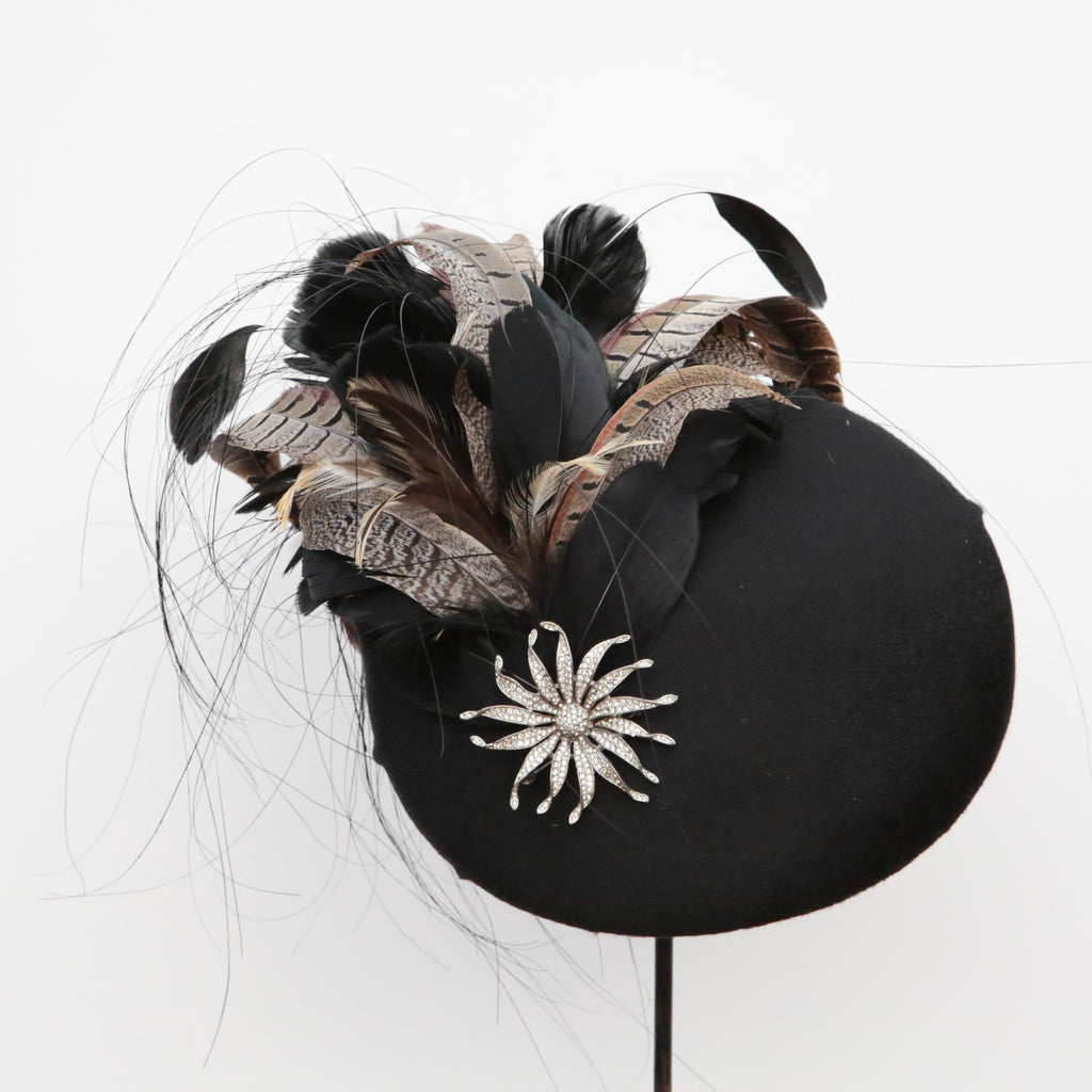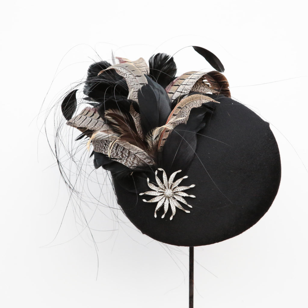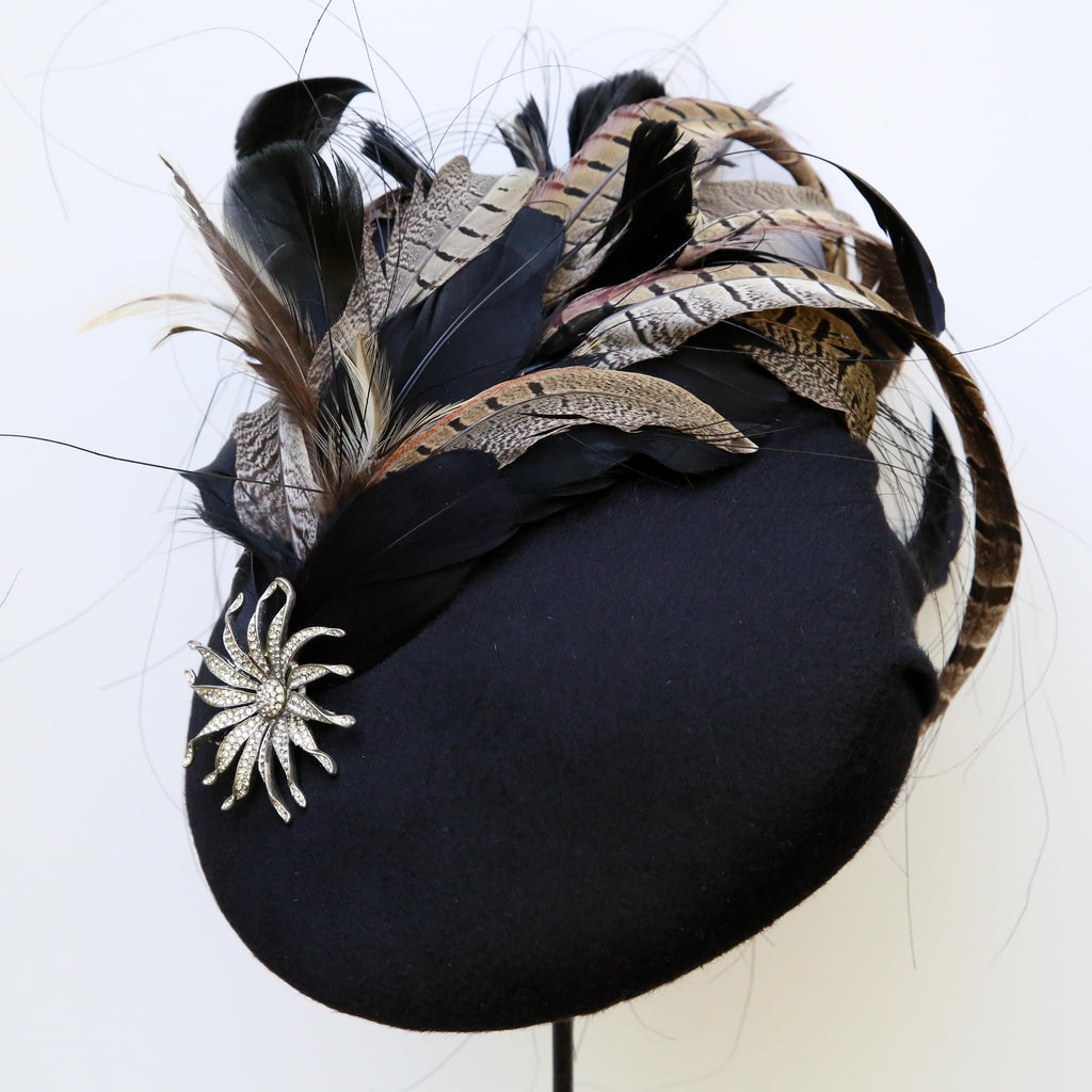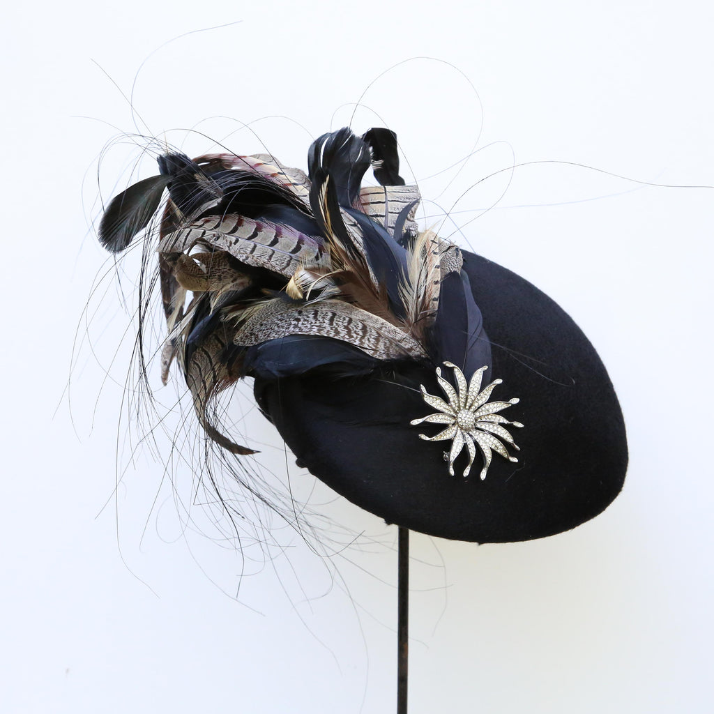 100% black cashmere beret, with plume of rich black goose feathers, natural hackle and pheasant feathers, with a large diamanté vintage brooch.