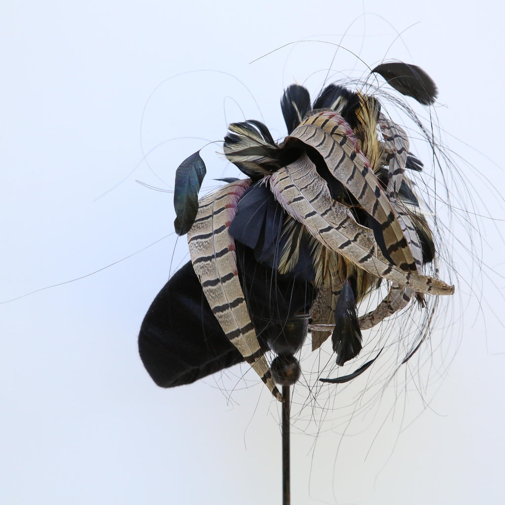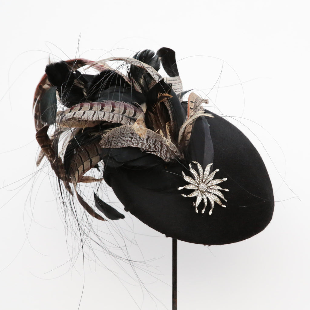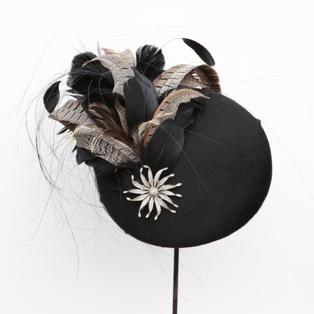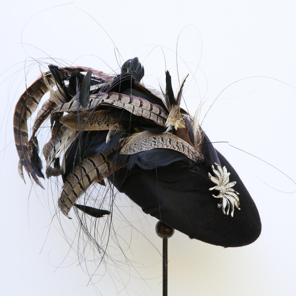 100% black cashmere beret, with plume of rich black goose feathers, natural hackle and pheasant feathers, with a large diamanté vintage brooch.