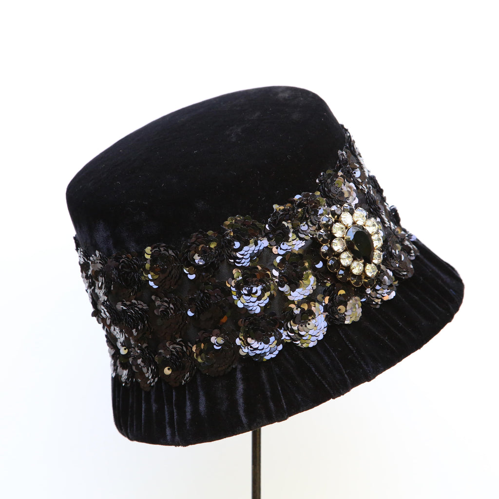 A black silk velvet cloche, with band of black sequinned flowers and vintage jet and diamanté paste brooch.