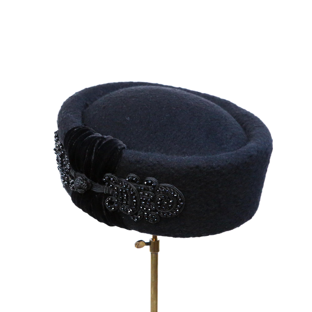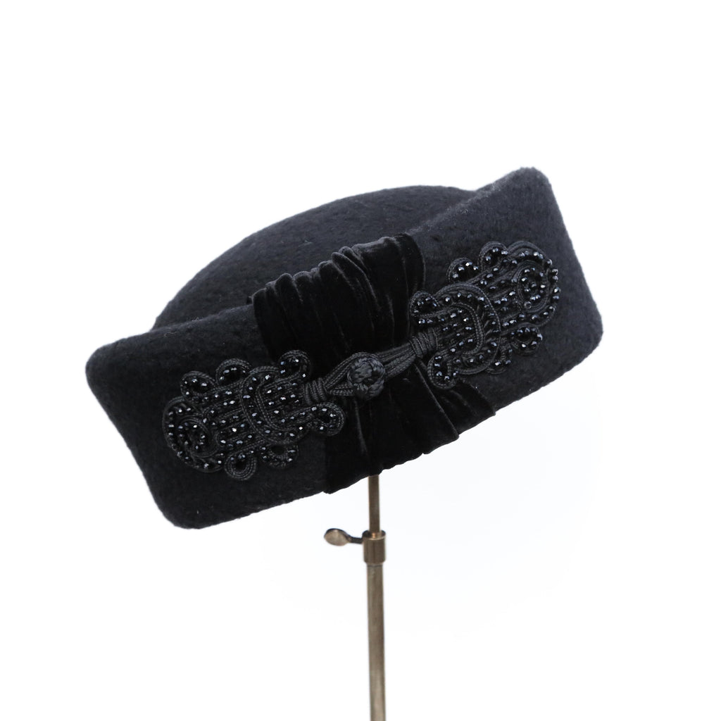 A black cashmere cossack hat, with black silk velvet rouched pleat and beaded black frogging.