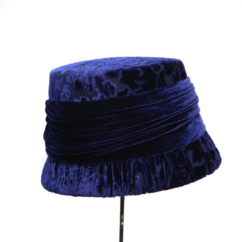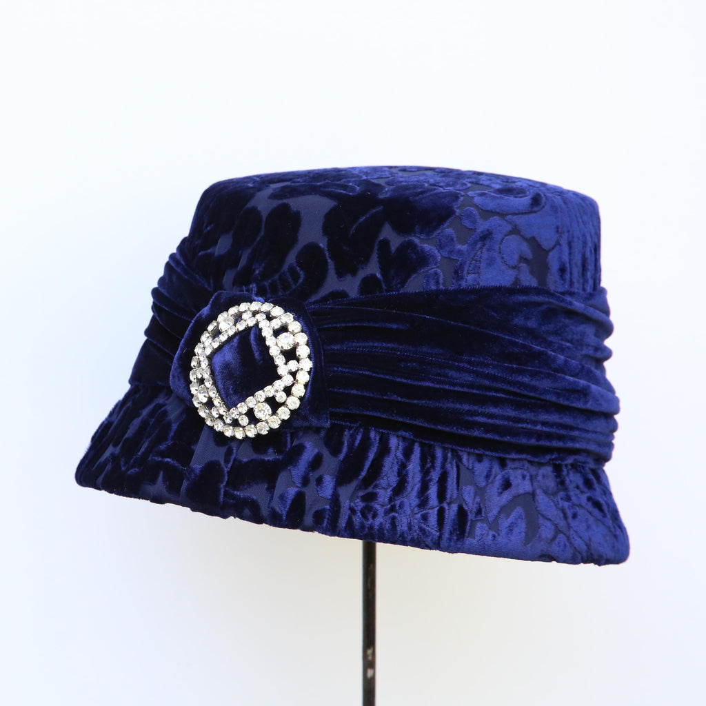 A navy silk velvet devoré cloche, with a plain blue silk velvet rouched band and large vintage diamanté brooch.