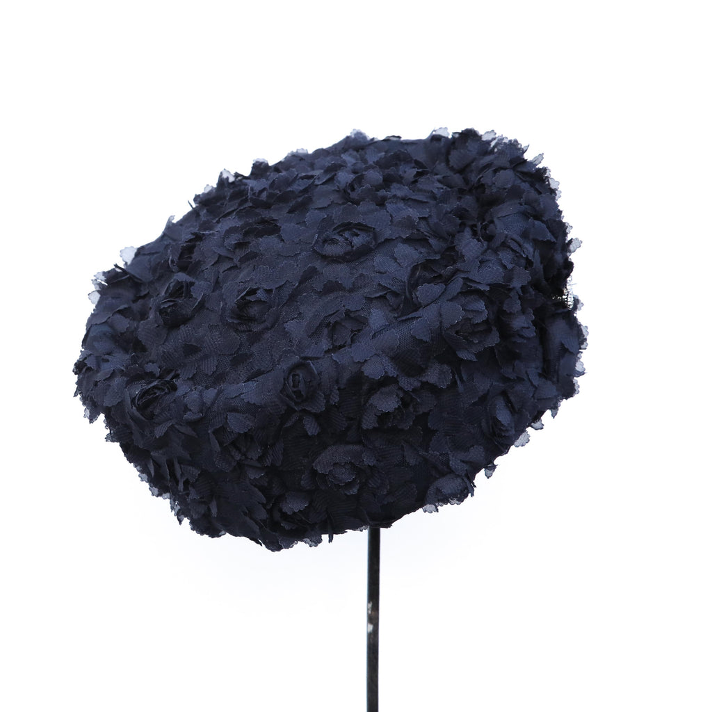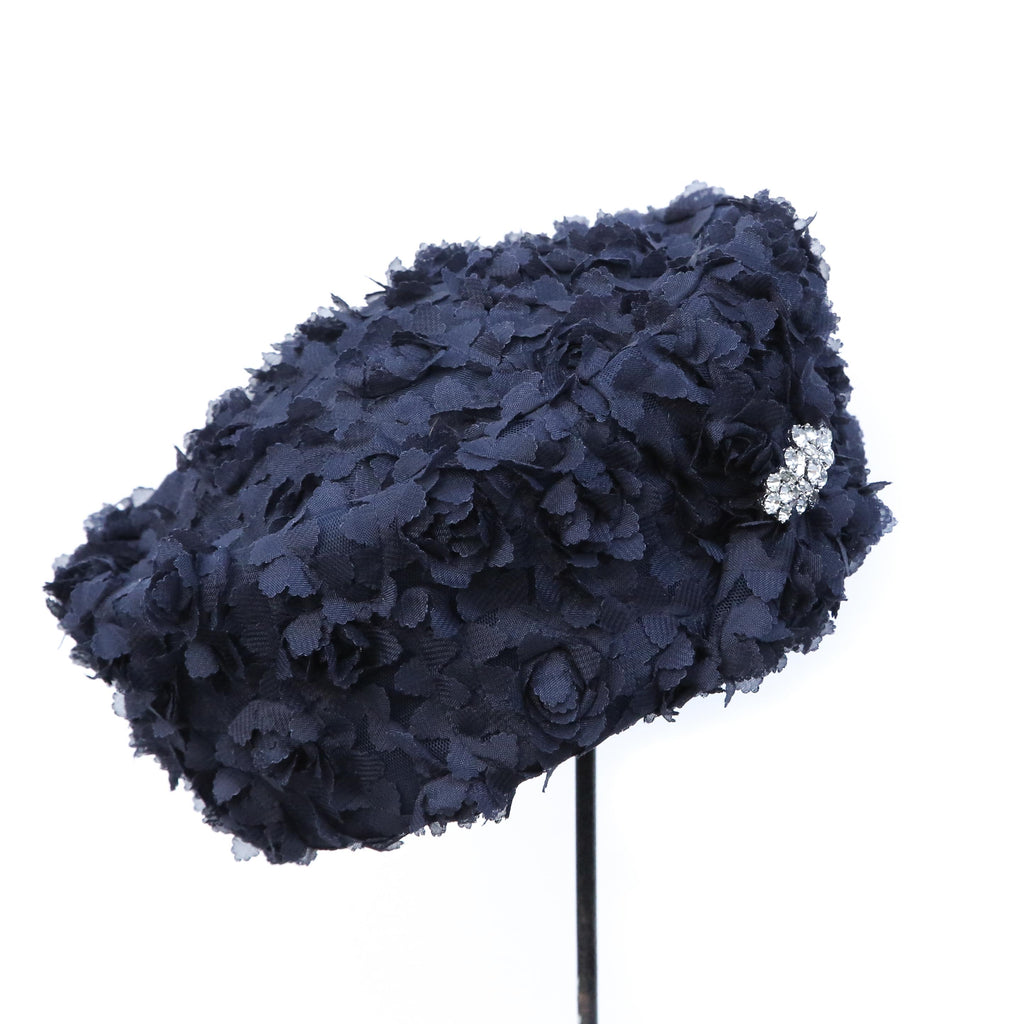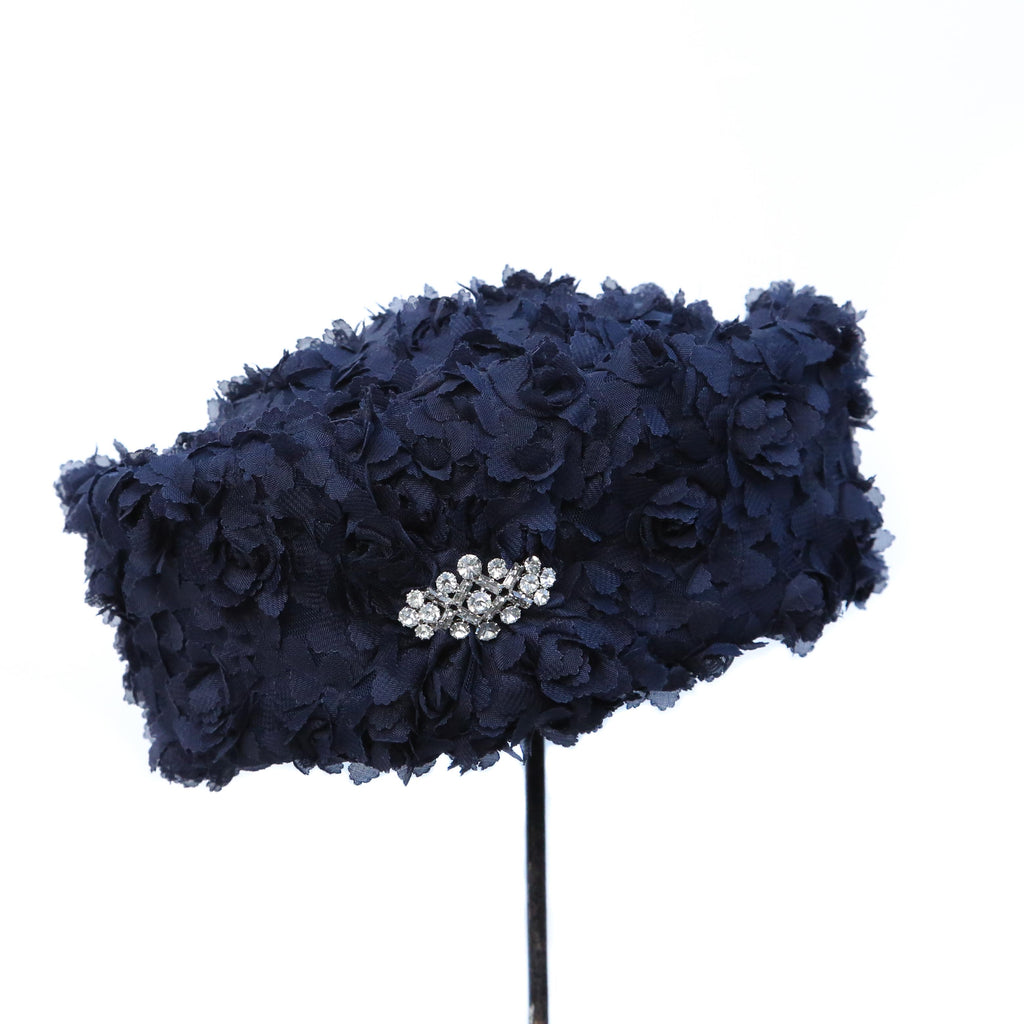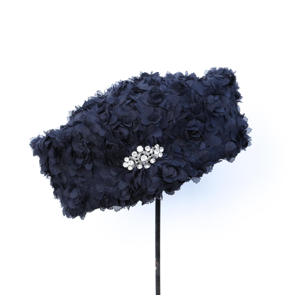 A French navy rose embellished cossack, with simple self fabric pleat detail and a pretty vintage paste brooch.