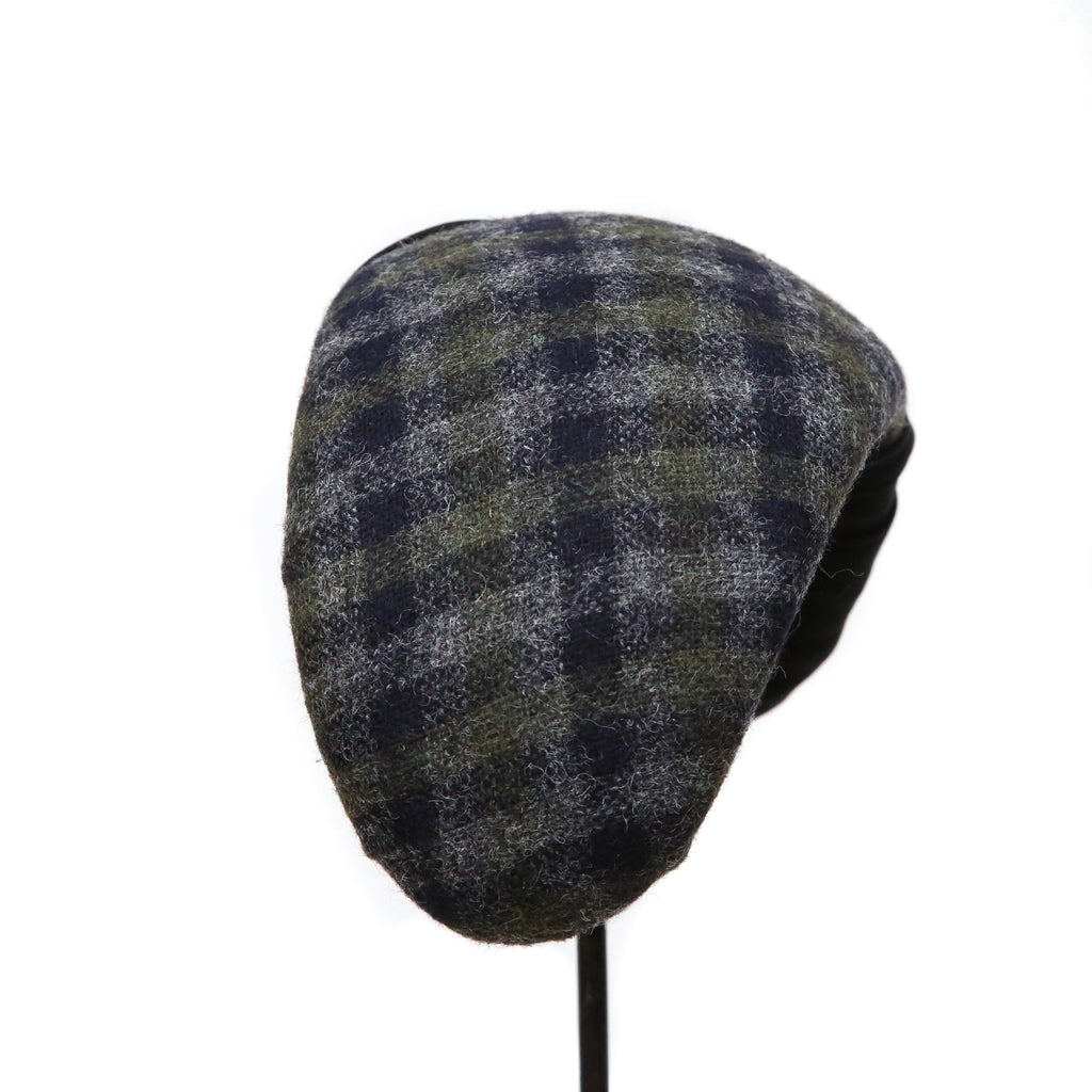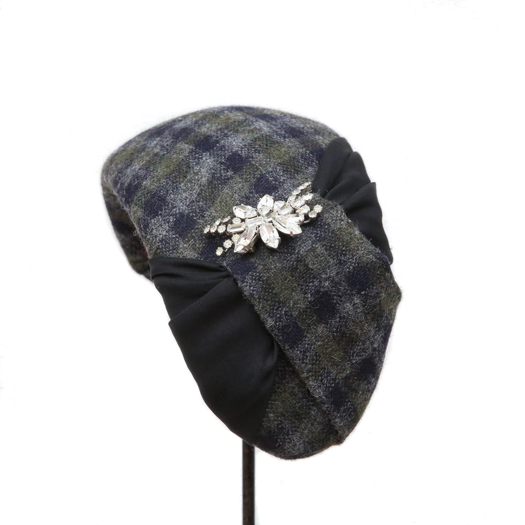 A grey, green and black check pure wool almond shaped headband, with black chiffon and tweed pleat and a vintage paste flower brooch. Lined in black silk velvet.