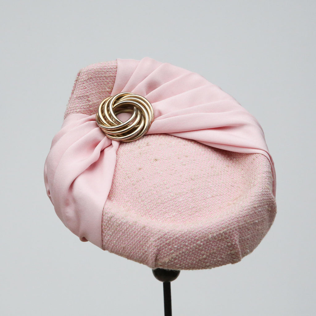 A pink and beige tweed, with pink pure silk bow detail and a vintage gold and silver brooch.