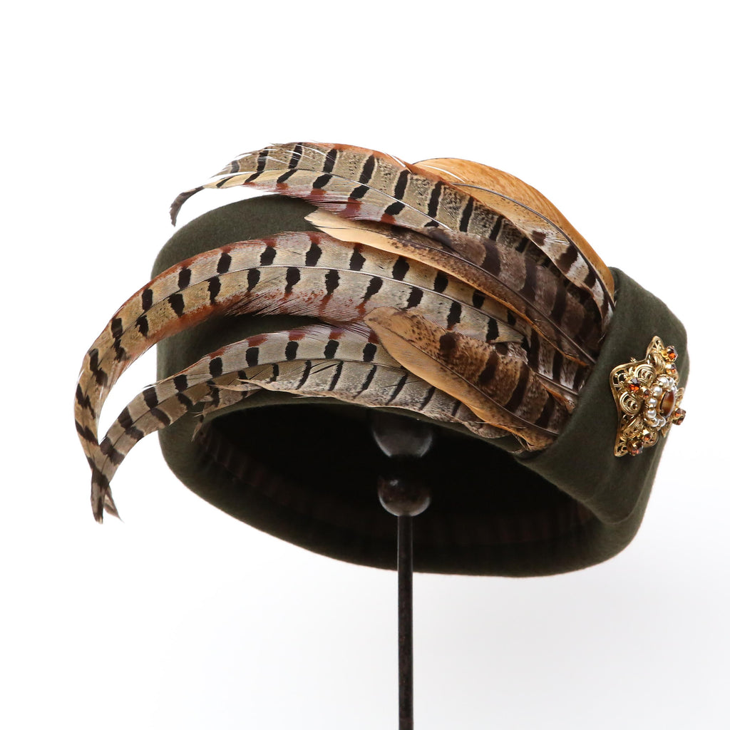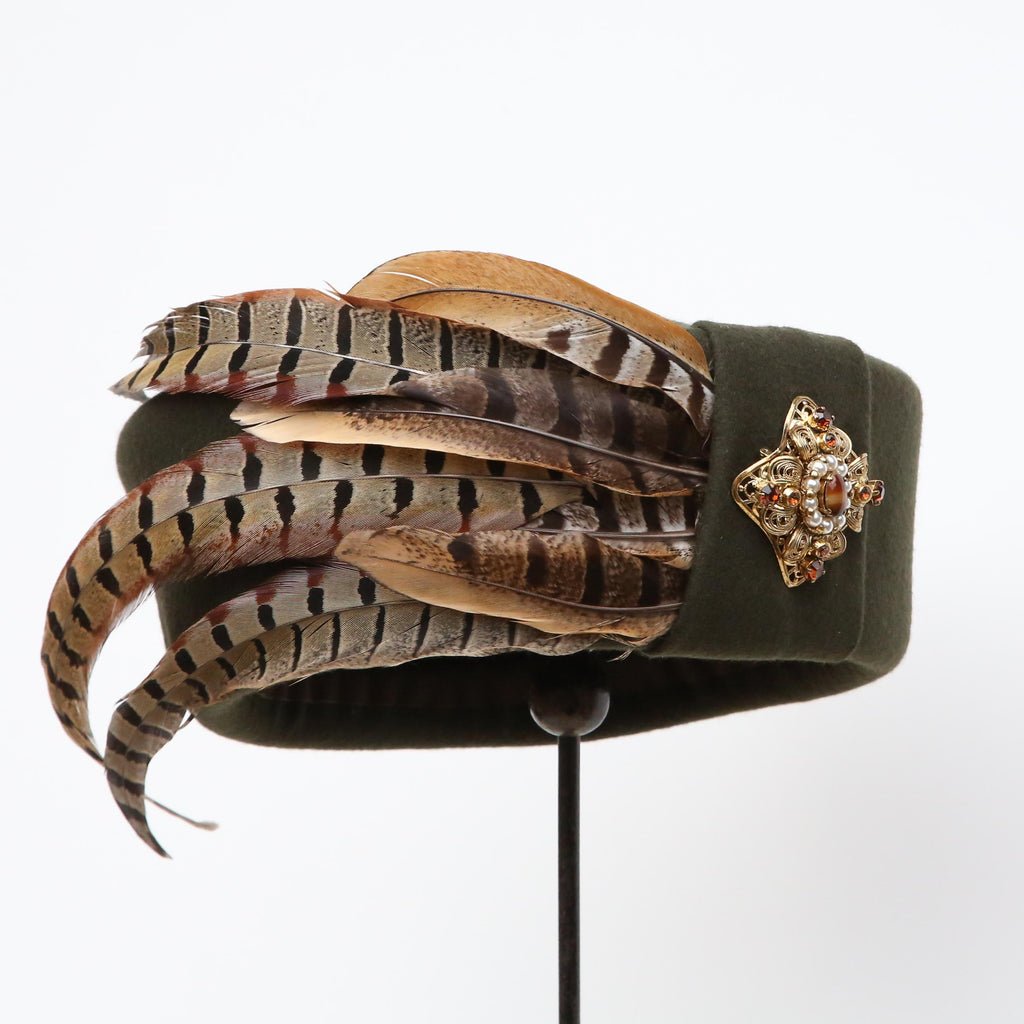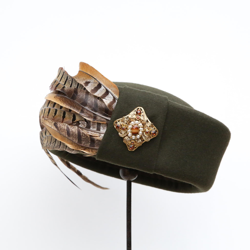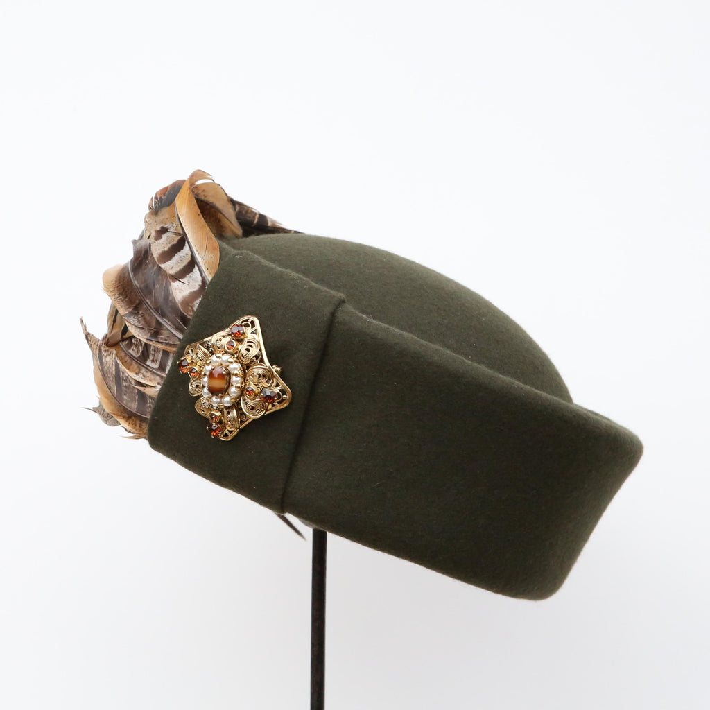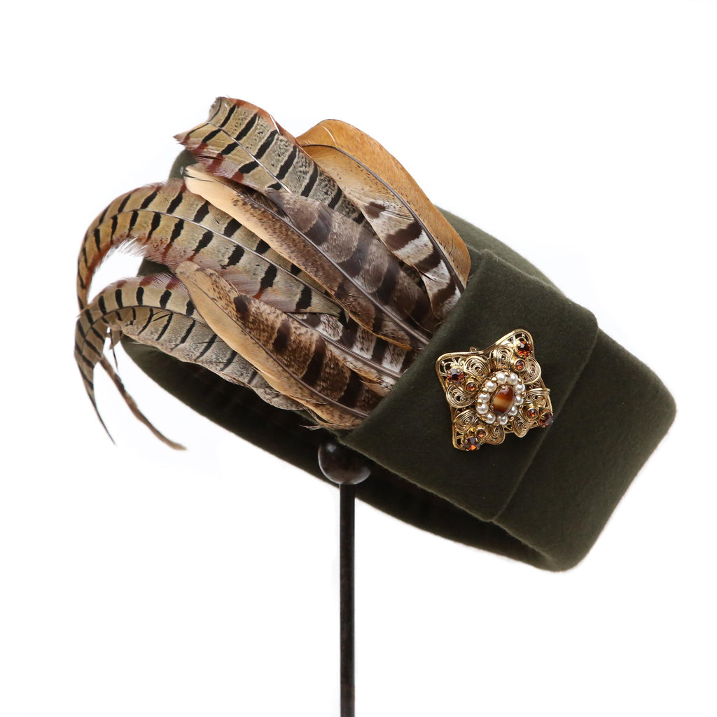 A dark olive green cashmere wool blend, with crest of curled pheasant feathers, a felt pleat and vintage agate, pearl and brown gem gold brooch.
