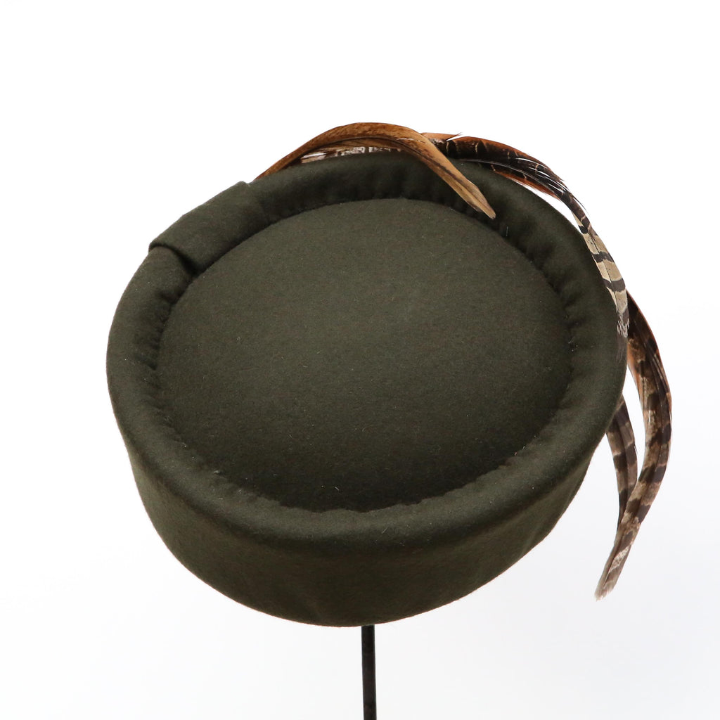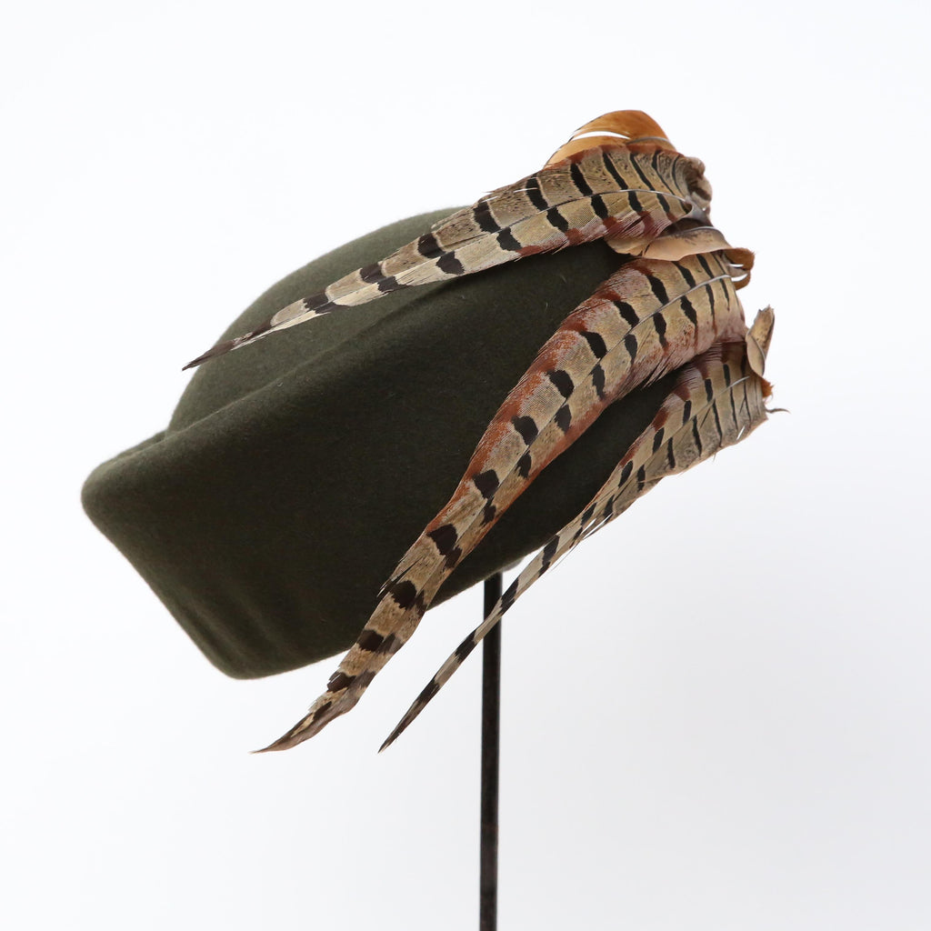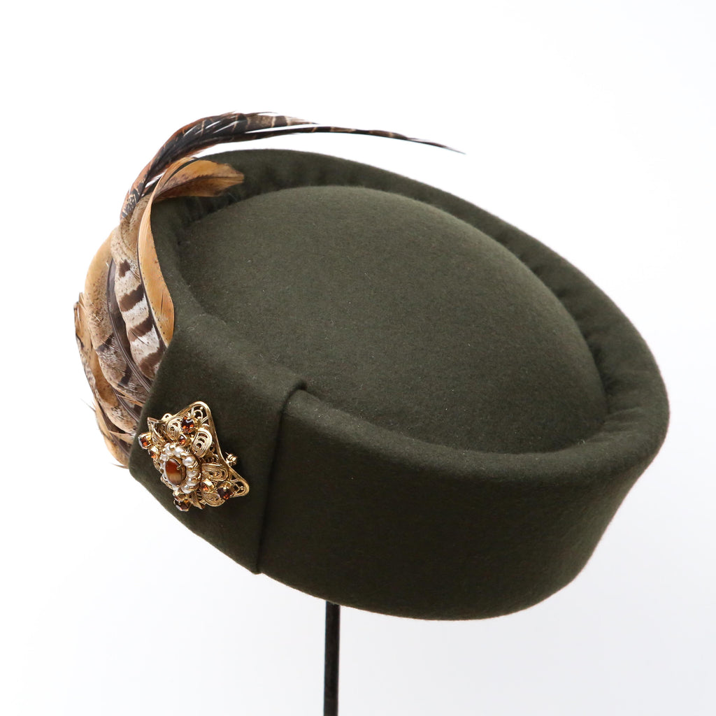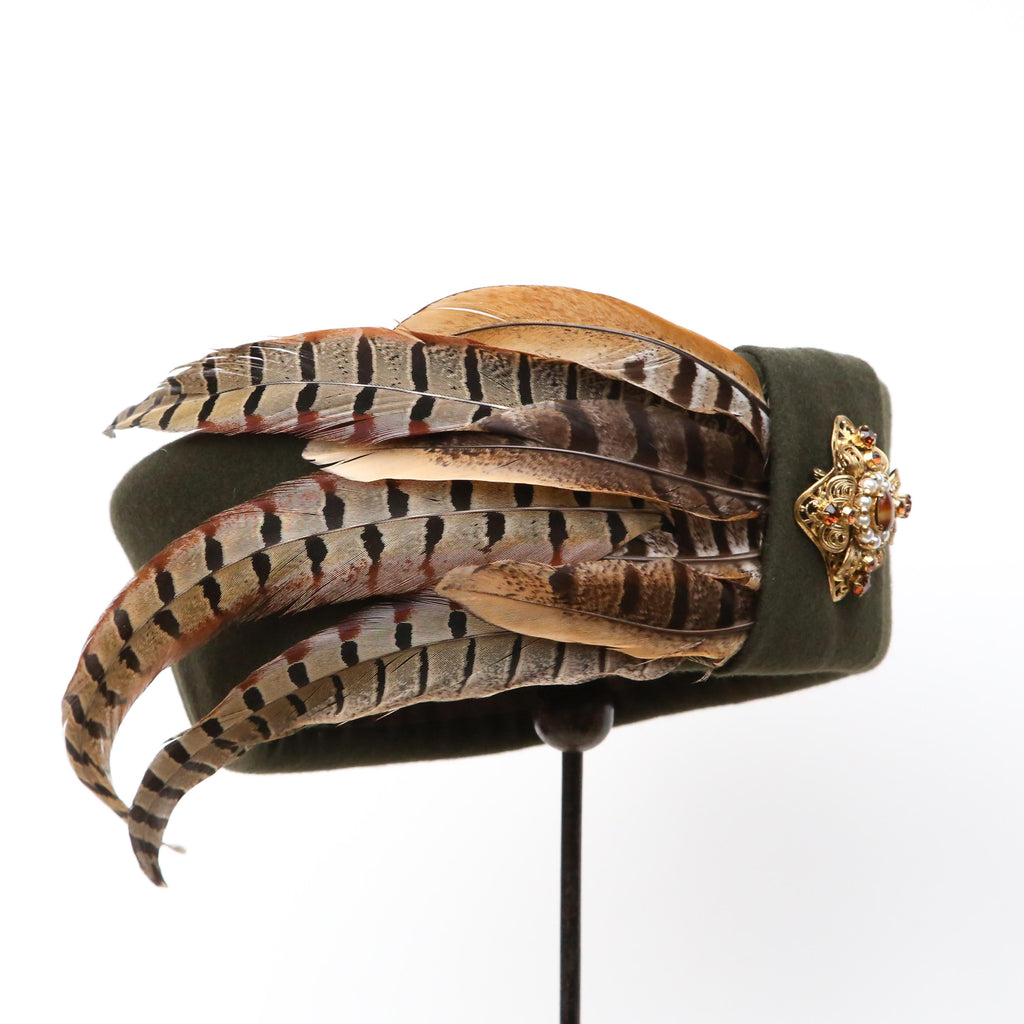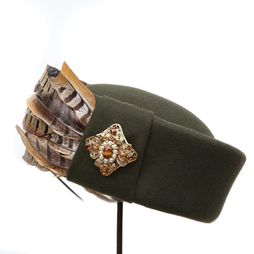 A dark olive green cashmere wool blend, with crest of curled pheasant feathers, a felt pleat and vintage agate, pearl and brown gem gold brooch.